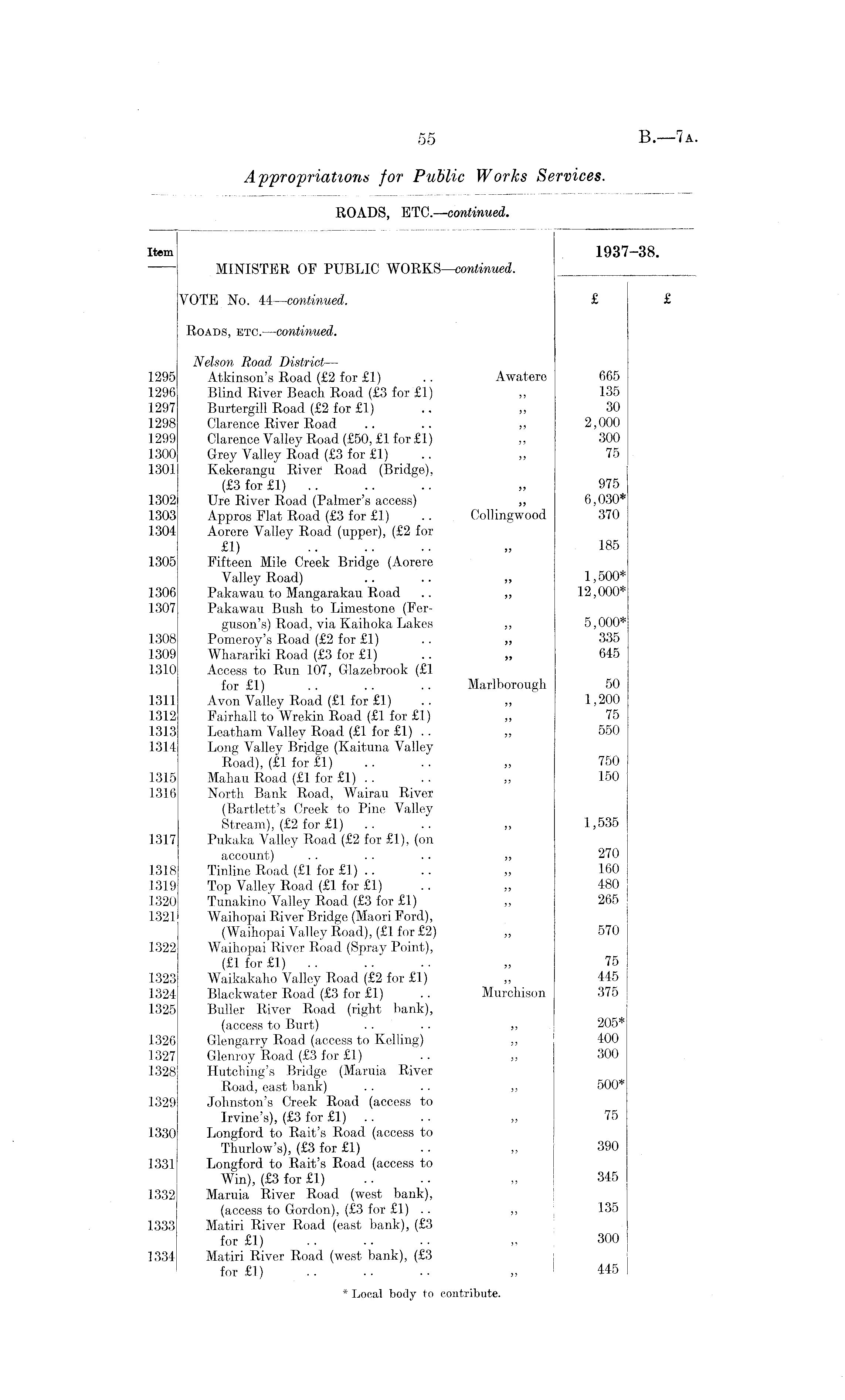 Item 1937—38. MINISTER OF PUBLIC WORKS —continued. VOTE No. 44—continued. £ £ Roads, etc. —continued. Nelson Road District — 1295 Atkinson's Road (£2 for £1) .. Awatere 665 1296 Blind River Beach Road (£3 for £1) ,, 135 1297 Burtergill Road (£2 for £1) .. ,, 30 1298 Clarence River Road .. .. ,, 2,000 1299 Clarence Valley Road (£50, £1 for £1) ,, 300 1300 Grey Valley Road (£3 for £1) .. „ 75 1301 Kekerangu River Road (Bridge), (£3 for £1) „ 975 1302 Ure River Road (Palmer's access) ,, 6,030* 1303 Appros Flat Road (£3 for £1) .. Collingwood 370 1304 Aorere Valley Road (upper), (£2 for £1) „ 185 1305 Fifteen Mile Creek Bridge (Aorere Valley Road) .. .. „ 1,500* 1306 Pakawau to Mangarakau Road .. „ 12,000* 1307 Pakawau Bush to Limestone (Ferguson's) Road, via Kaihoka Lakes ,, 5,000* 1308 Pomeroy's Road (£2 for £1) .. ,, 335 1309 Wharariki Road (£3 for £1) .. „ 645 1310 Access to Run 107, Glazebrook (£1 for £1) .. .. .. Marlborough 50 1311 Avon Valley Road (£1 for £1) .. ,, 1,200 1312 Fairhall to Wrekin Road (£1 for £1) „ 75 1313 Leatham Valley Road (£1 for £1) .. ,, 550 1314 Long Valley Bridge (Kaituna Valley Road), (£1 for £1) .. .. „ 750 1315 Mahau Road (£1 for £1) . . . . „ 150 1316 North Bank Road, Wairau River (Bartlett's Creek to Pine Valley Stream), (£2 for £1) .. .. ,, 1,535 1317 Pukaka Valley Road (£2 for £1), (on account) . . . . .. ,, 270 1318 Tinline Road (£1 for £1) .. .. „ 160 1319 Top Valley Road (£1 for £1) .. ,, 480 1320 Tunakino Valley Road (£3 for £1) ,, 265 1321 Waihopai River Bridge (Maori Ford), (Waihopai Valley Road), (£1 for £2) ,, 570 1322 Waihopai River Road (Spray Point), (£1 for £1) .. .. .. „ 75 1323 Waikakaho Valley Road (£2 for £1) „ 445 1324 Blackwater Road (£3 for £1) .. Murchison 375 1325 Buller River Road (right bank), (access to Burt) .. . . ,, 205* 1326 Glengarry Road (access to Kelling) ,, 400 1327 Glenroy Road (£3 for £1) .. „ 300 1328 Hutching's Bridge (Maruia River Road, east bank) .. .. ,, 500* 1329 Johnston's Creek Road (access to Irvine's), (£3 for £1) .. .. „ 75 1330 Longford to Rait's Road (access to Thurlow's), (£3 for £1) .. „ 390 1331 Longford to Rait's Road (access to Win), (£3 for £1) .. .. „ 345 1332 Maruia River Road (west bank), (access to Gordon), (£3 for £1) .. ,, 135 1333 Matiri River Road (east bank), (£3 for £1) .. .. ■ • ,> 300 1334 Matiri River Road (west bank), (£3 for £1) „ 445 * Local body to contribute.