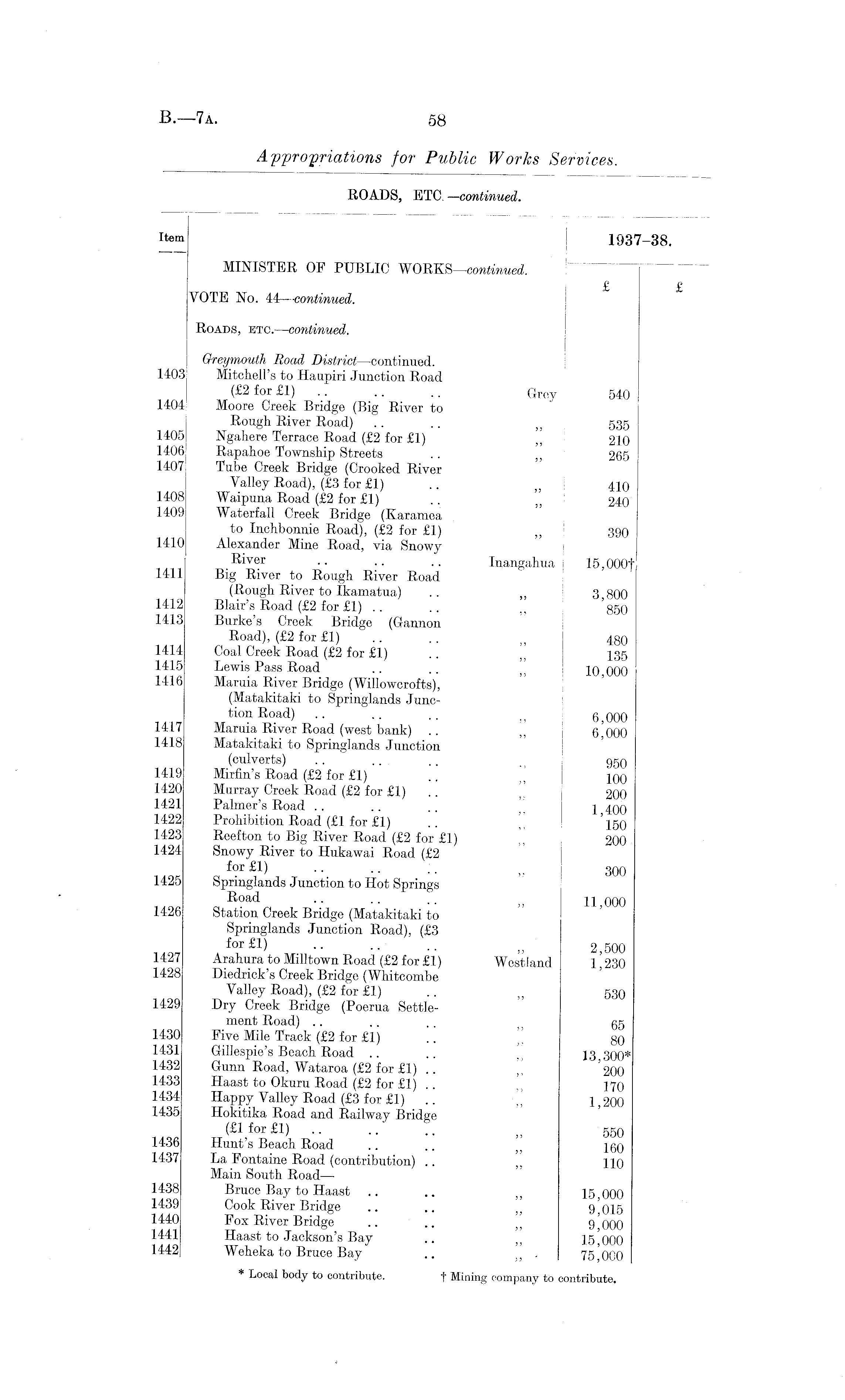 Item ! 1937-38. MINISTER OP PUBLIC WORES—continued. £ £ VOTE No. 44 —continued. Roads, etc. —continued. Greymouth Road District—continued. 1403 Mitchell's to Haupiri Junction Road (£2 for £1) .. .. .. Grey 540 1404 Moore Creek Bridge (Big River to Rough River Road) .. .. 535 1405 Ngahere Terrace Road (£2 for £1) " 210 1406 Rapahoe Township Streets .. „ 265 1407 Tube Creek Bridge (Crooked River Valley Road), (£3 for £1) .. 410 1408 Waipuna Road (£2 for £1) .. " 240 1409 Waterfall Creek Bridge (Karamea to Inchbonnie Road), (£2 for £1) „ 1 390 1410 Alexander Mine Road, via Snowy Ri ver • • • • • • Inangahua i 15,000+ 1411 Big River to Rough River Road (Rough River to Ikamatua) .. 3 800 1412 Blair's Road (£2 for £1) .. .. 'ggO 1413 Burke's Creek Bridge (Gannon Road), (£2 for £1) .. .. 4g0 1414 Coal Creek Road (£2 for £1) .. I35 1415 Lewis Pass Road .. .. jq 000 1416 Maruia River Bridge (Willowcrofts), (Matakitaki to Springlands Junction Road) .. .. . . g goo 1417 Maruia River Road (west bank) . . 6^000 1418 Matakitaki to Springlands Junction (culverts) .. .. .. . 959 1419 Mirfin's Road (£2 for £1) .. ,, 100 1420 Murray Creek Road (£2 for £1) .. 200 1421 Palmer's Road .. .. .. 1 400 1422 Prohibition Road (£1 for £1) .. 'l50 1423 Reefton to Big River Road (£2 for £1) ,, 200 1424 Snowy River to Hukawai Road (£2 f°r £1) .. .. . . 300 1425 Springlands Junction to Hot Springs Roa(i •• ■■ „ 11,000 1426 Station Creek Bridge (Matakitaki to Springlands Junction Road), (£3 for £1) .. .. . 2 500 1427 Arahura to Milltown Road (£2 for £1) Westland l'230 1428 Diedrick's Creek Bridge (Whitcombe Valley Road), (£2 for £1) .. „ 530 1429 Dry Creek Bridge (Poerua Settlement Road) .. .. .. 05 1430 Five Mile Track (£2 for £1) .. t g0 1431 Gillespie's Beach Road .. .. . J3 300* 1432 Gunn Road, Wataroa (£2 for £1) .. '200 1433 Haast to Okuru Road (£2 for £1) .. ]70 1434 Happy Valley Road (£3 for £1) .. 1,200 1435 Hokitika Road and Railway Bridge (£1 for £1) .. .. .. y) 550 1436 Hunt's Beach Road .. .. 100 1437 La Fontaine Road (contribution) .. ,, uq Main South Road— 1438 Bruce Bay to Haast .. .. 15 000 1439 Cook River Bridge .. .. 9 015 1440 Fox River Bridge .. .. ;; 9'000 1441 Haast to Jackson's Bay .. ,, ]5 000 1442 Weheka to Bruce Bay .. . 75,000 * Local body to contribute. f Mining company to contribute.