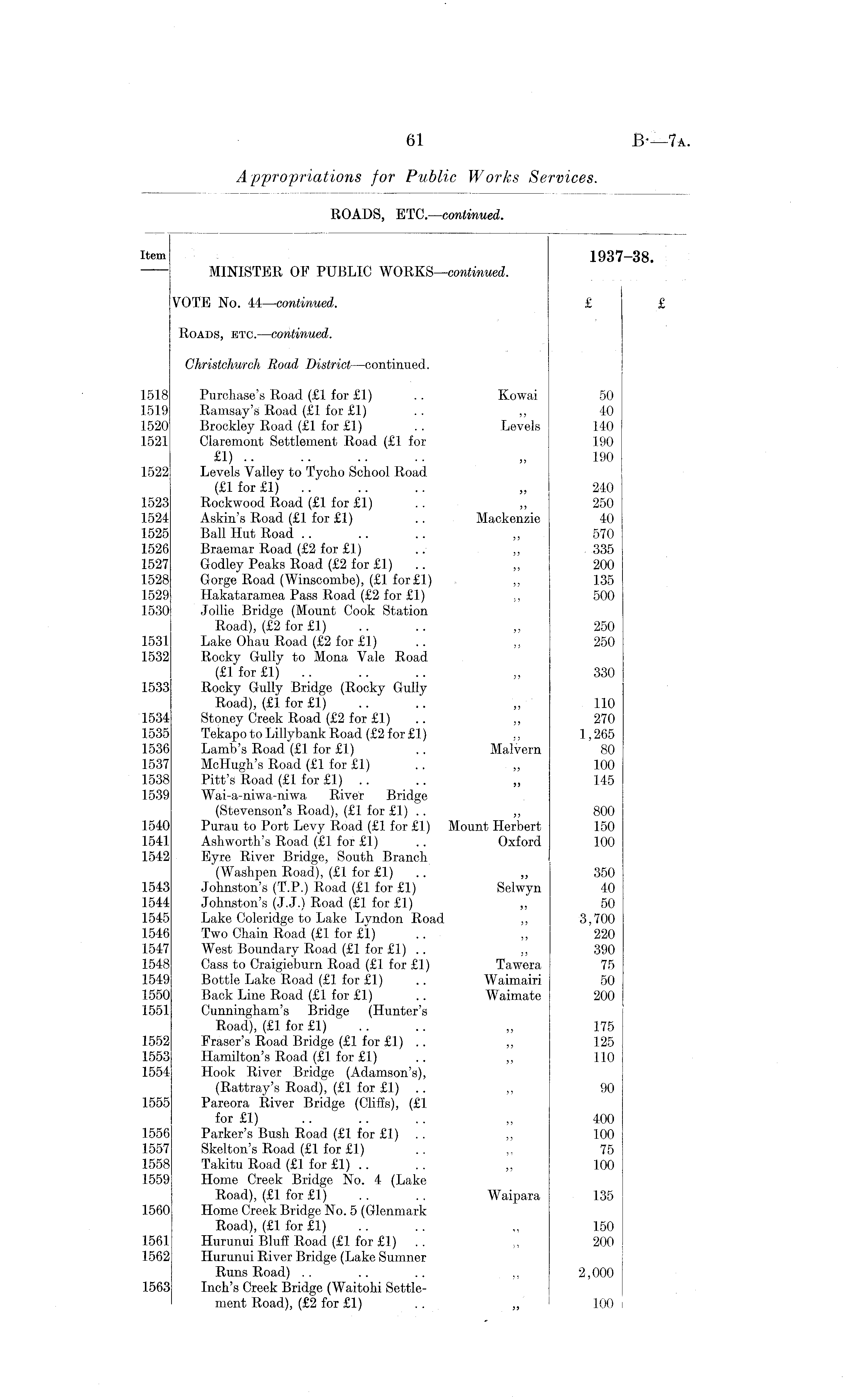 Item 1937-38. MINISTER OF PUBLIC WORKS—continued. VOTE No. 44 —continued. £ £ Roads, etc. —continued. Christchurch Road District —continued. 1518 Purchase's Road (£1 for £1) .. Kowai 50 1519 Ramsay's Road (£1 for £1) . . ,, 40 1520 Brockley Road (£1 for £1) . . Levels 140 1521 Claremont Settlement Road (£1 for 190 £1) .. .. .. .. „ 190 1522 Levels Valley to Tycho School Road (£1 for £1) .. .. .. „ 240 1523 Rockwood Road (£1 for £1) .. ,, 250 1524 Askin's Road (£1 for £1) .. Mackenzie 40 1525 Ball Hut Road .. .. .. ,, 570 1526 Braemar Road (£2 for £1) .. „ 335 1527 Godley Peaks Road (£2 for £1) .. „ 200 1528 Gorge Road (Winscombe), (£1 for£l) ,, 135 1529 Hakataramea Pass Road (£2 for £1) „ 500 1530 Jollie Bridge (Mount Cook Station Road), (£2 for £1) .. .. ,, 250 1531 Lake Ohau Road (£2 for £1) .. ,, 250 1532 Rocky Gully to Mona Vale Road (£1 for £1) .. .. .. „ 330 1533 Rocky Gully Bridge (Rocky Gully Road), (£1 for £1) .. .. ,, 110 1534 Stoney Creek Road (£2 for £1) .. ,, 270 1535 TekapotoLillybankRoad (£2for£l) ,, 1,265 1536 Lamb's Road (£1 for £1) .. Malvern 80 1537 McHugh's Road (£1 for £1) .. ,, 100 1538 Pitt's Road (£1 for £1) .. .. ,, 145 1539 Wai-a-niwa-niwa River Bridge (Stevenson's Road), (£1 for £1) .. ,, 800 1540 Purau to Port Levy Road (£1 for £1) Mount Herbert 150 1541 Ashworth's Road (£1 for £1) .. Oxford 100 1542 Eyre River Bridge, South Branch (Washpen Road), (£1 for £1) .. ,, 350 1543 Johnston's (T.P.) Road (£1 for £1) Selwyn 40 1544 Johnston's (J.J.) Road (£1 for £1) ,, 50 1545 Lake Coleridge to Lake Lyndon Road ,, 3,700 1546 Two Chain Road (£1 for £1) .. ,, 220 1547 West Boundary Road (£1 for £1) .. ,, 390 1548 Cass to Craigieburn Road (£1 for £1) Tawera 75 1549 Bottle Lake Road (£1 for £1) .. Waimairi 50 1550 Back Line Road (£1 for £1) .. Waimate 200 1551 Cunningham's Bridge (Hunter's Road), (£1 for £1) .. .. ,, 175 1552 Fraser's Road Bridge (£1 for £1) .. „ 125 1553 Hamilton's Road (£1 for £1) .. ,, 110 1554 Hook River Bridge (Adamson's), (Rattray's Road), (£1 for £1) .. ,, 90 1555 Pareora River Bridge (Cliffs), (£1 for £1) .. .. .. ,, 400 1556 Parker's Bush Road (£1 for £1) .. „ 100 1557 Skelton's Road (£1 for £1) .. ,, 75 1558 Takitu Road (£1 for £1) .. .. ,, 100 1559 Home Creek Bridge No. 4 (Lake Road), (£1 for £1) .. .. Waipara 135 1560 Home Creek Bridge No. 5 (Glenmark Road), (£1 for £1) .. .. ,, 150 1561 Hurunui Bluff Road (£1 for £1) .. „ 200 1562 Hurunui River Bridge (Lake Sumner Runs Road) .. .. .. ,, 2,000 1563 Inch's Creek Bridge (Waitohi Settlement Road), (£2 for £1) .. „ 100