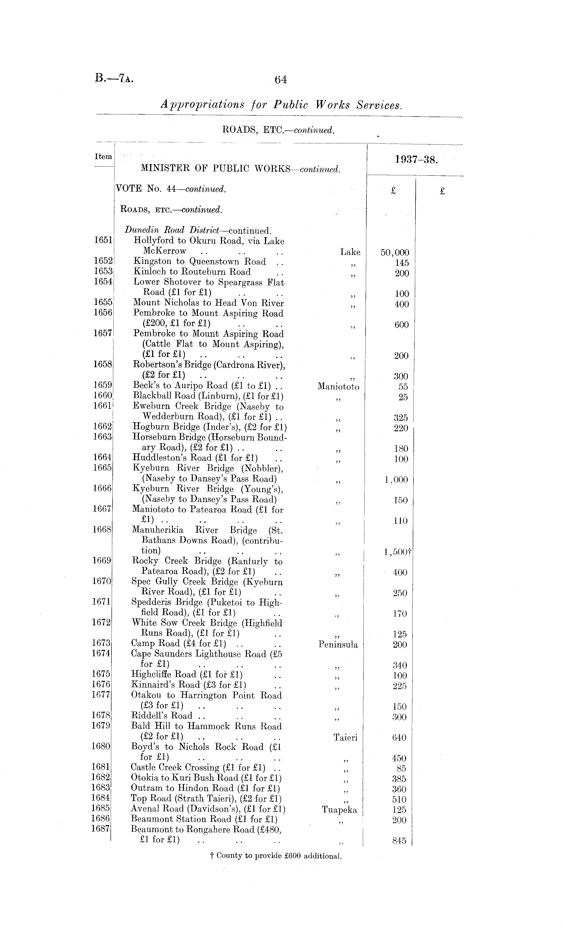 Item 1937—38 MINISTER OF.PUBLIC WORKS—continued. VOTE No. 44—continued. £ £ Roads, etc. —continued. Dunedin Road District—continued. 1651 Hollyford to Okuru Road, via Lake McKerrow .. .. .. Lake 50,000 1652 Kingston to Queenstown Road .. „ 145 1653 Kinloch to Routeburn Road .. ,, 200 1654 Lower Shotover to Speargrass Flat Road (£1 for £1) .. .. „ 100 1655 Mount Nicholas to Head Von River „ 400 1656 Pembroke to Mount Aspiring Road (£200, £1 for £1) .. „ 600 1657 Pembroke to Mount Aspiring Road (Cattle Flat to Mount Aspiring), (£1 for £1) .. .. .. 200 1658 Robertson's Bridge (Cardrona River), (£2 for £1) .. .. .. „ 300 1659 Beck's to Auripo Road (£1 to £1) .. Maniototo 55 1660 Blackball Road (Linburn), (£1 for £1) ,, 25 1661 Eweburn Creek Bridge (Naseby to Wedderburn Road), (£1 for £1) .. „ 325 1662 Hogburn Bridge (Inder's), (£2 for £1) „ 220 1663 Horseburn Bridge (Horseburn Boundary Road), (£2 for £1) .. .. ,, 180 1664 Huddleston's Road (£1 for £1) „ 100 1665 Kyeburn River Bridge (Nobbier), (Naseby to Dansey's Pass Road) „ 1,000 1666 Kyeburn River Bridge (Young's), (Naseby to Dansey's Pass Road) ,, 150 1667 Maniototo to Patearoa Road (£1 for £1) ■■ .. „ 110 1668 Manuherikia River Bridge (St. Bathans Downs Road), (contribution) .. .. .. „ 1,5001" 1669 Rocky Creek Bridge (Ranfurly to Patearoa Road), (£2 for £1) .. „ 400 1670 Spec Gully Creek Bridge (Kyeburn River Road), (£1 for £1) .. „ 250 1671 Spedderis Bridge (Puketoi to Highfield Road), (£1 for £1) .. ,, 170 1672 White Sow Creek Bridge (Highfield Runs Road), (£1 for £1) .. „ 125 1673 Camp Road (£4 for £1) .. .. Peninsula 200 1674 Cape Saunders Lighthouse Road (£5 for £1) .. .. .. „ 340 1675 HighclifEe Road (£1 for £1) .. ,, 100 1676 Kinnaird's Road (£3 for £1) .. ,, 225 1677 Otakou to Harrington Point Road (£3 for £1) „ 150 1678 Riddell's Road .. .. .. ,, 300 1679 Bald Hill to Hammock Runs Road (£2 for £1) .. .. .. Taieri 640 1680 Boyd's to Nichols Rock Road (£1 for £1) .. .. .. „ 450 1681 Castle Creek Crossing (£1 for £1) .. ,, 85 1682 Otokia to Kuri Bush Road (£1 for £1) ,, 385 1683 Outram to Hindon Road (£1 for £1) ,, 360 1684 Top Road (Strath Taieri), (£2 for £1) ,, 510 1685 Avenal Road (Davidson's), (£1 for £1) Tuapeka 125 1686 Beaumont Station Road (£1 for £1) ,, 200 1687 Beaumont to Rongahere Road (£480, £1 for £1) , „ 845 f County to provide £600 additional.