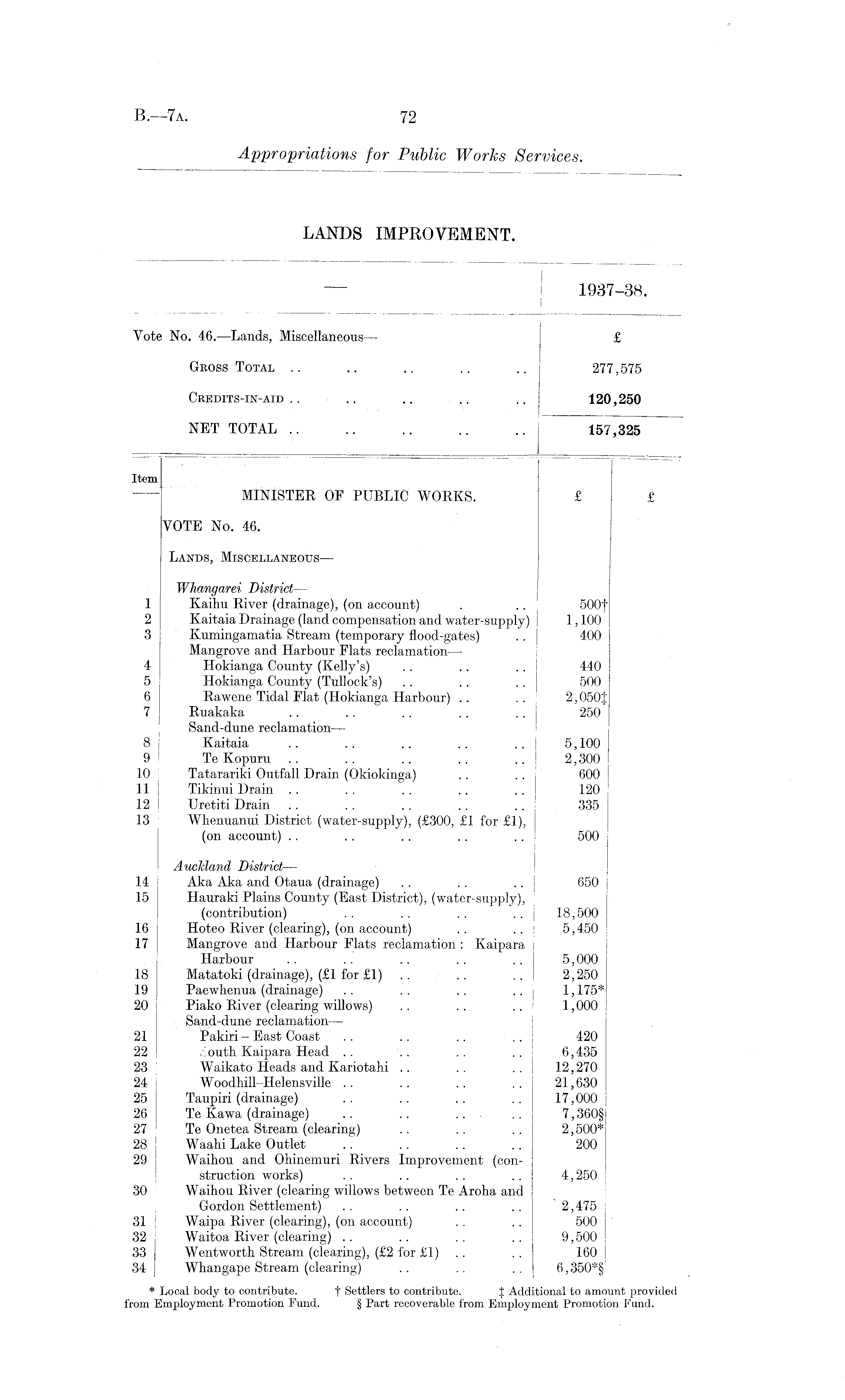 I — i 1937-38. Vote No. 46,—Lands, Miscellaneous— £ GROSS TOTAL .. .. .. .. .. 277,575 Credits-IN-AID .. .. .. .. 120,250 NET TOTAL .. .. .. .. .. 157,325 Item MINISTER OP PUBLIC WORKS. £ £ VOTE No. 46. Lands, Miscellaneous— Whangarei District— 1 Kaihu River (drainage), (on account) . .. 500f 2 Kaitaia Drainage (land compensation and water-supply) 1,100 3 Ivumingamatia Stream (temporary flood-gates) .. 400 Mangrove and Harbour Flats reclamation— 4 Hokianga County (Kelly's) .. .. .. 440 5 Hokianga County (Tullock's) . . .. . . 500 6 Rawene Tidal Fiat (Hokianga Harbour) .. . . 2,050$ 7 Ruakaka .. .. . . .. ., 250 Sand-dune reclamation— 8 Kaitaia . . .. .. .. .. 5,100 9 Te Kopuru .. . . .. . . .. 2,300 10 Tatarariki Outfall Drain (Okiokinga) .. .. 600 11 | Tikinui Drain . . .. ., .. .. 120 12 j Uretiti Drain .. . . .. .. .. 335 13 Whenuanui District (water-supply), (£300, £1 for £1), (on account) .. .. .. .. .. 500 Auckland District — 14 Aka Aka and Otaua (drainage) . . . . .. 650 15 Hauraki Plains County (East District), (water-supply), (contribution) . . .. . . .. | 18,500 16 Hoteo River (clearing), (on account) .. .. ! 5,450 17 Mangrove and Harbour Flats reclamation : Kaipara Harbour . . .. .. .. .. 5,000 18 Matatoki (drainage), (£1 for £1) .. .. .. 2,250 19 PaewLenua (drainage) .. .. .. .. j 1,175* 20 Piako River (clearing willows) .. .. ..I 1,000 Sand-dune reclamation — j 21 Pakiri - East Coast . . . . .. .. j 420 22 aouth Kaipara Head .. .. .. .. 6,435 23 | Waikato Heads and Kariotahi .. .. .. 12,270 24 Woodhill-Helensville .. .. .. .. 21,630 25 Taupiri (drainage) .. .. .. .. 17,000 26 Te Kawa (drainage) .. . . .. .. 7,360§ 27 Te Onetea Stream (clearing) .. .. .. 2,500* 28 Waahi Lake Outlet .. . . . . . . 200 29 Waihou and Ohinemuri Rivers Improvement (construction works) .. .. .. .. 4,250 30 Waihou River (clearing willows between Te Aroha and Gordon Settlement) .. .. .. .. '2,475 31 Waipa River (clearing), (on account) . . .. 500 32 Waitoa River (clearing) .. .. .. .. 9,500 33 Wentworth Stream (clearing), (£2 for £1) .. .. 160 34 Whangape Stream (clearing) .. .. .. 6,350*§ * Local body to contribute. t Settlers to contribute. J Additional to amount provided from Employment Promotion Fund. § Part recoverable from Employment Promotion Fund.