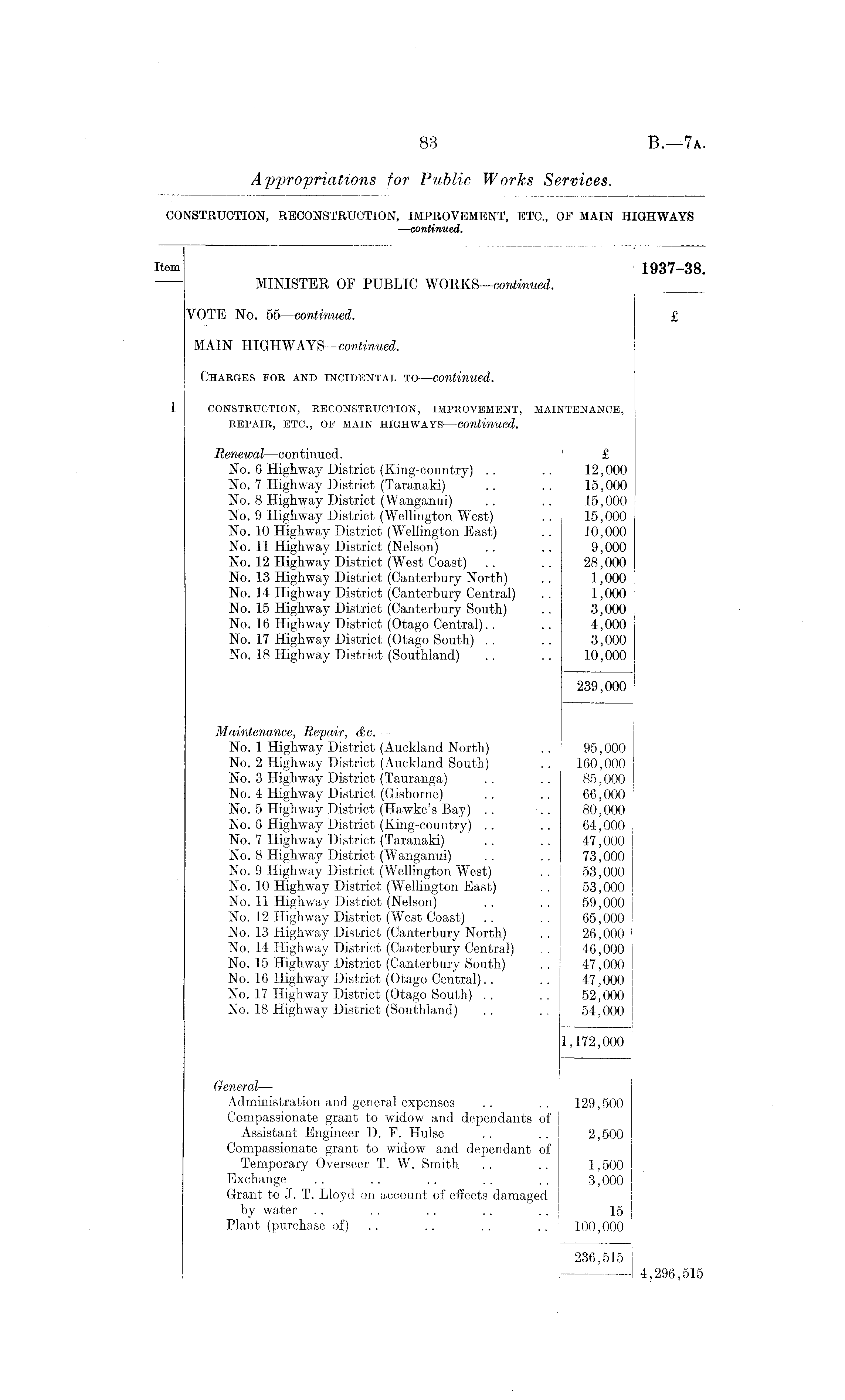 Item 1937-38. MINISTER OF PUBLIC WORKS—continued. _____ VOTE No. 55 —continued. £ MAIN HIGHWAYS—continued. Charges foe and incidental to —continued. 1 CONSTRUCTION, RECONSTRUCTION, IMPROVEMENT, MAINTENANCE, repair, etc., op main highways—continued. Renewal —continued. £ No. 6 Highway District (King-country) .. .. 12,000 No. 7 Highway District (Taranaki) .. .. 15,000 No. 8 Highway District (Wanganui) .. .. 15,000 No. 9 Highway District (Wellington West) . . 15,000 No. 10 Highway District (Wellington East) .. 10,000 No. 11 Highway District (Nelson) .. .. 9,000 No. 12 Highway District (West Coast) .. .. 28,000 No. 13 Highway District (Canterbury North) .. 1,000 No. 14 Highway District (Canterbury Central) .. 1,000 No. 15 Highway District (Canterbury South) .. 3,000 No. 16 Highway District (Otago Central).. .. 4,000 No. 17 Highway District (Otago South) .. .. 3,000 No. 18 Highway District (Southland) .. .. 10,000 239,000 Maintenance, Repair, &c. — No. 1 Highway District (Auckland North) . . 95,000 No. 2 Highway District (Auckland South) .. 160,000 No. 3 Highway District (Tauranga) .. .. 85,000 No. 4 Highway District (Gisborne) .. .. 66,000 No. 5 Highway District (Hawke's Bay) .. .. 80,000 No. 6 Highway District (King-country) .. .. 64,000 No. 7 Highway District (Taranaki) . . . . 47,000 No. 8 Highway District (Wanganui) . . . . 73,000 No. 9 Highway District (Wellington West) .. 53,000 No. 10 Highway District (Wellington East) . . 53,000 No. 11 Highway District (Nelson) .. .. 59,000 No. 12 Highway District (West Coast) . . . . 65,000 No. 13 Highway District (Canterbury North) . . 26,000 No. 14 Highway District (Canterbury Central) .. 46,000 No. 15 Highway District (Canterbury South) .. 47,000 No. 16 Highway District (Otago Central).. . . 47,000 No. 17 Highway District (Otago South) .. .. 52,000 No. 18 Highway District (Southland) .. .. 54,000 1,172,000 General — Administration and general expenses .. .. 129,500 Compassionate grant to widow and dependants of Assistant Engineer D. F. Hulse .. .. 2,500 Compassionate grant to widow and dependant of Temporary Overseer T. W. Smith .. .. 1,500 Exchange .. .. .. .. .. 3,000 Grant to J. T. Lloyd on account of effects damaged by water .. . . .. . . .. 15 Plant (purchase of) .. . . .. 100,000 236,515 4,296,515