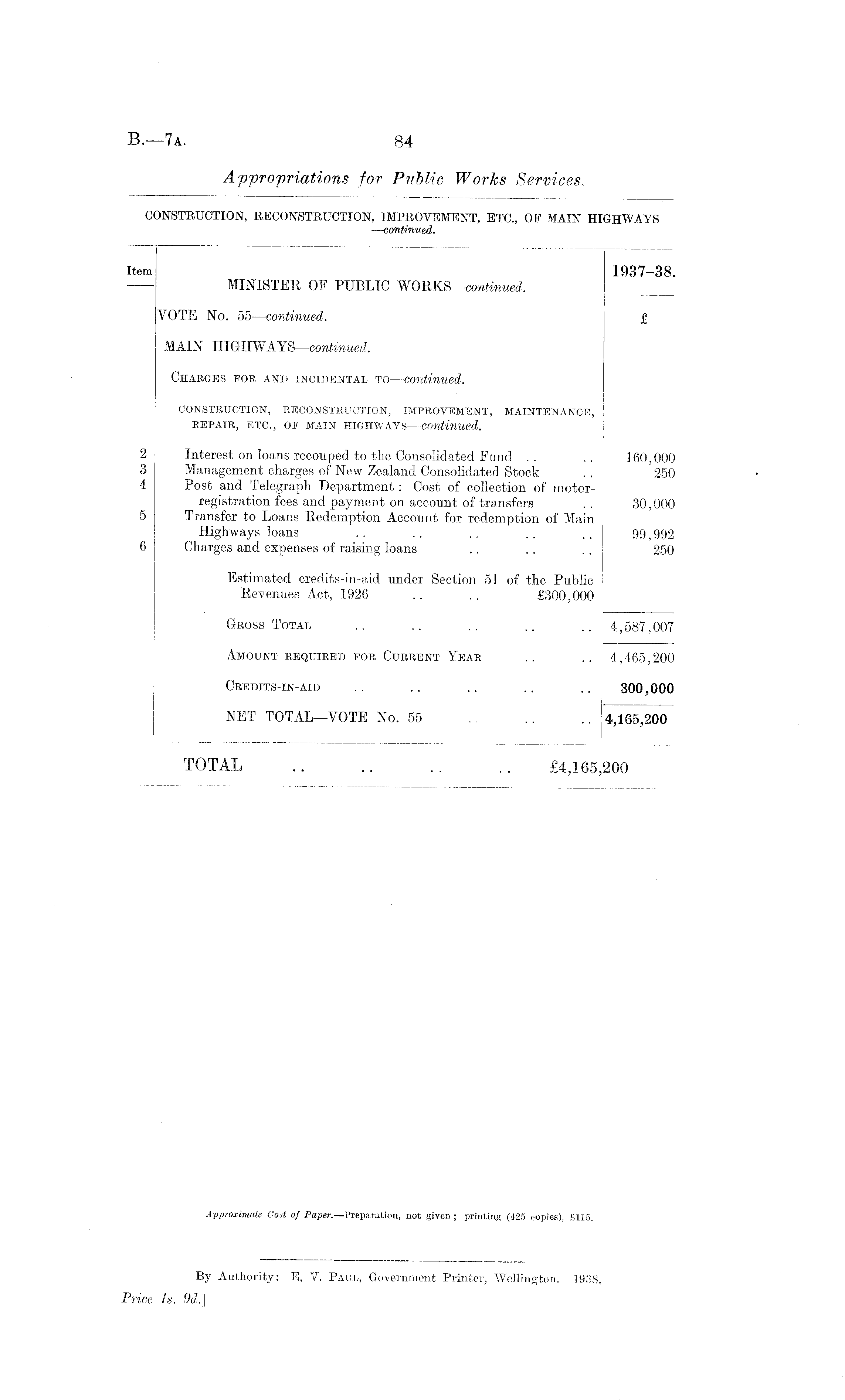 Item 1937-38. MINISTER OF PUBLIC WORKS—continued. VOTE No. 55 —continued. £ MAIN HIGHWAYS—continued. Charges for and incidental to —continued. CONSTRUCTION, RECONSTRUCTION, IMPROVEMENT, MAINTENANCE, repair, etc., op main highways—continued. 2 Interest on loans recouped to the Consolidated Fund .. .. 160,000 3 Management charges of New Zealand Consolidated Stock . . 250 4 Post and Telegraph Department: Cost of collection of motorregistration fees and payment on account of transfers . . 30,000 5 Transfer to Loans Redemption Account for redemption of Main Highways loans .. .. .. .. .. 99,992 6 Charges and expenses of raising loans .. . . .. 250 Estimated credits-in-aid under Section 51 of the Public Revenues Act, 1926 .. .. £300,000 GROSS Total .. .. .. .. .. 4,587,007 Amount required por Current Year .. .. 4,465,200 Credits-in-aid .. .. .. .. .. 300,000 NET TOTAL—VOTE No. 55 4,165,200 TOTAL . . . . . . . . £4,165,200