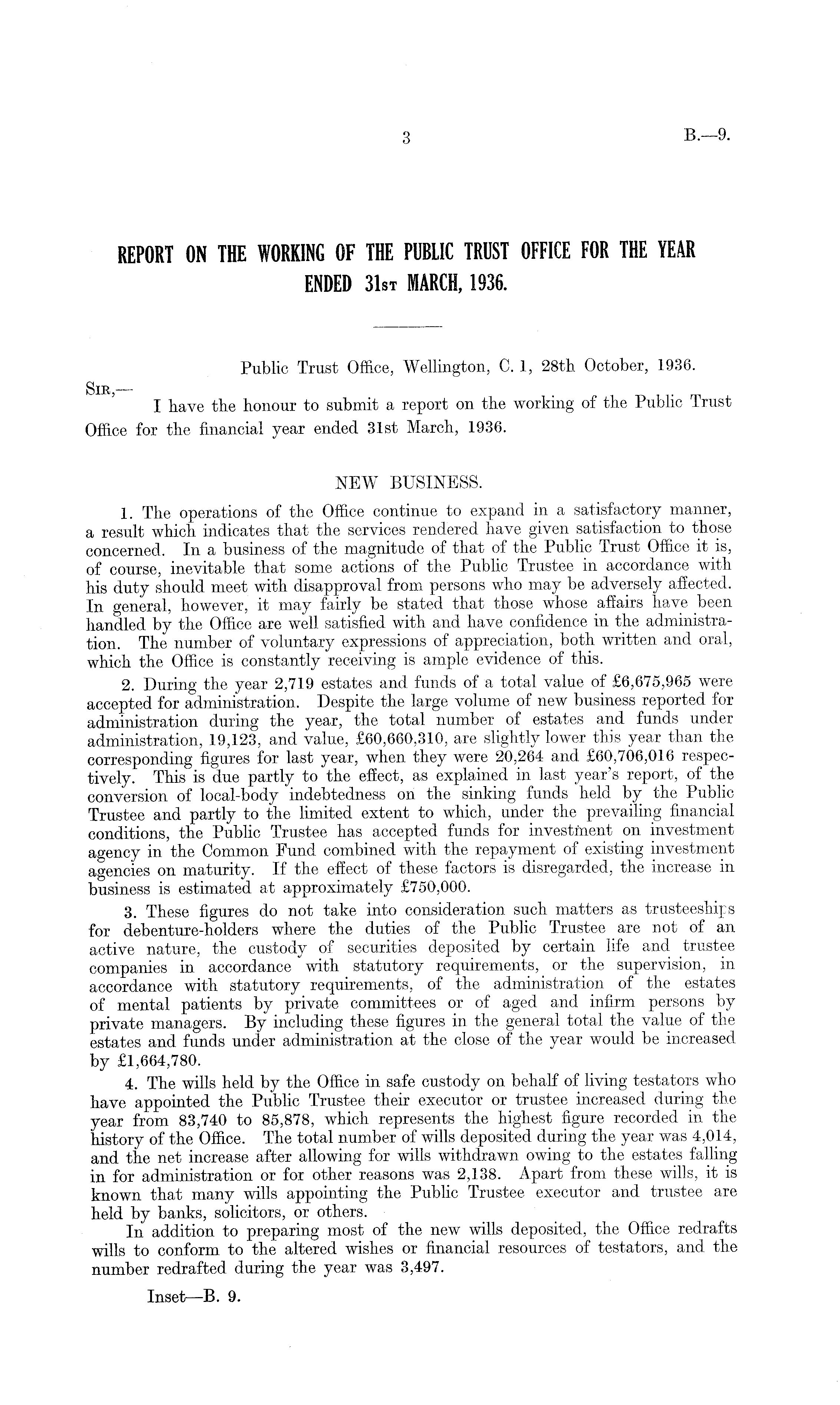 Public Trust Office, Wellington, C. 1, 28th October, 1936. I have the honour to submit a report on the working of the Public Trust Office for the financial year ended 31st March, 1936. NEW BUSINESS. 1. The operations of the Office continue to expand in a satisfactory manner, a result which indicates that the services rendered have given satisfaction to those concerned. In a business of the magnitude of that of the Public Trust Office it is, of course, inevitable that some actions of the Public Trustee in accordance with his duty should meet with disapproval from persons who may be adversely affected. In general, however, it may fairly be stated that those whose affairs have been handled by the Office are well satisfied with and have confidence in the administration. The number of voluntary expressions of appreciation, both written and oral, which the Office is constantly receiving is ample evidence of this. 2. During the year 2,719 estates and funds of a total value of £6,675,965 were accepted for administration. Despite the large volume of new business reported for administration during the year, the total number of estates and funds under administration, 19,123, and value, £60,660,310, are slightly lower this year than the corresponding figures for last year, when they were 20,264 and £60,706,016 respectively. This is due partly to the effect, as explained in last year's report, of the conversion of local-body indebtedness on the sinking funds held by the Public Trustee and partly to the limited extent to which, under the prevailing financial conditions, the Public Trustee has accepted funds for investment on investment agency in the Common Fund combined with the repayment of existing investment agencies on maturity. If the effect of these factors is disregarded, the increase in business is estimated at approximately £750,000. 3. These figures do not take into consideration such matters as trusteeships for debenture-holders where the duties of the Public Trustee are not of an active nature, the custody of securities deposited by certain life and trustee companies in accordance with statutory requirements, or the supervision, in accordance with statutory requirements, of the administration of the estates of mental patients by private committees or of aged and infirm persons by private managers. By including these figures in the general total the value of the estates and funds under administration at the close of the year would be increased by £1,664,780. 4. The wills held by the Office in safe custody on behalf of living testators who have appointed the Public Trustee their executor or trustee increased during the year from 83,740 to 85,878, which represents the highest figure recorded in the history of the Office. The total number of wills deposited during the year was 4,014, and the net increase after allowing for wills withdrawn owing to the estates falling in for administration or for other reasons was 2,138. Apart from these wills, it is known that many wills appointing the Public Trustee executor and trustee are held by banks, solicitors, or others. In addition to preparing most of the new wills deposited, the Office redrafts wills to conform to the altered wishes or financial resources of testators, and the number redrafted during the year was 3,497.