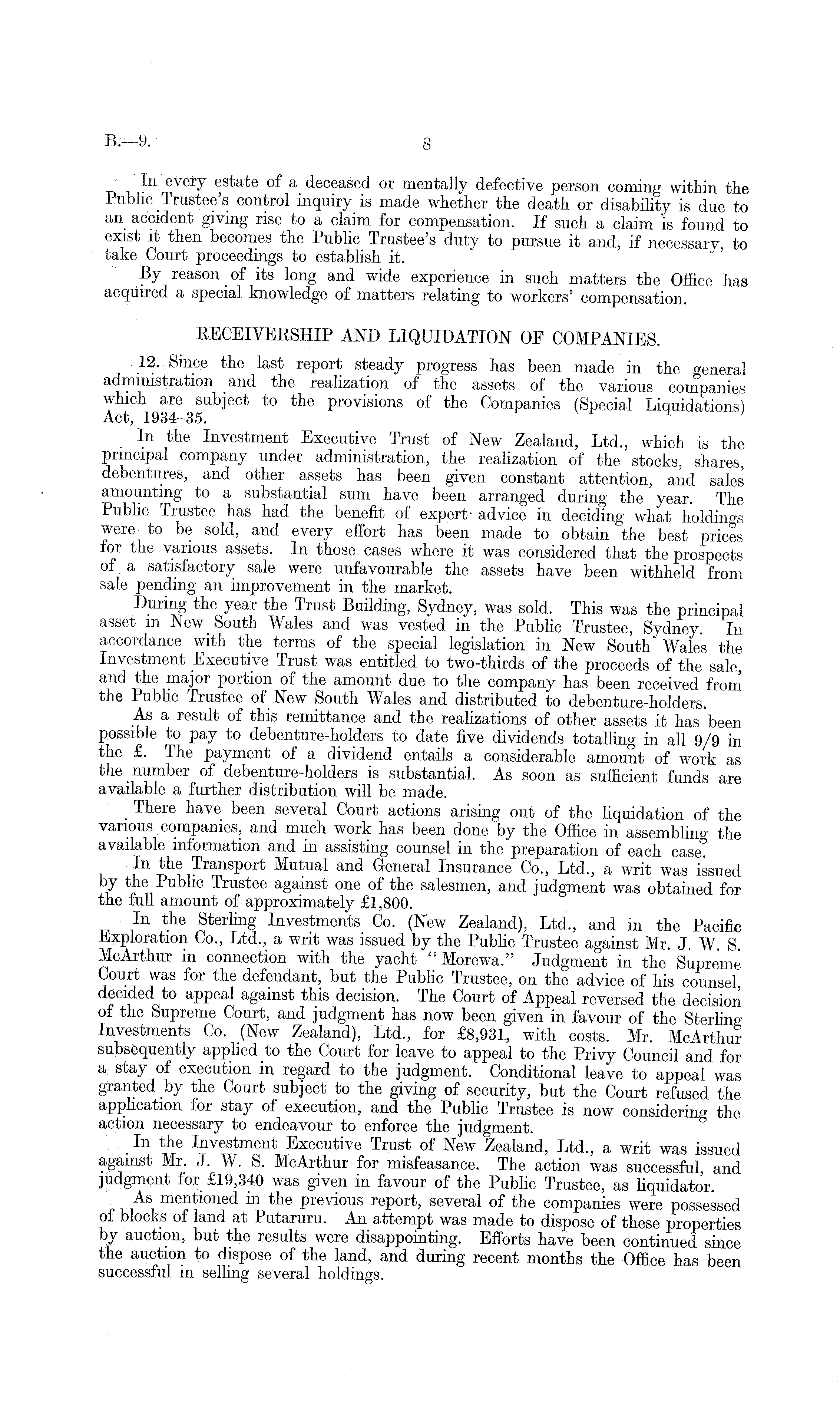 In every estate of a deceased or mentally defective person coming within the Public Trustee's control inquiry is made whether the death or disability is due to an accident giving rise to a claim for compensation. If such a claim is found to exist it then becomes the Public Irustee s duty to pursue it and, if necessary to take Court proceedings to establish it. By reason of its long and wide experience in such matters the Office has acqiined a special knowledge of matters relating to workers' compensation. RECEIVERSHIP AND LIQUIDATION OF COMPANIES. 12. Since the last report steady progress has been made in the general administration and the realization of the assets of the various companies which are subject to the provisions of the Companies (Special Liquidations) Act, 1934—35. In the Investment Executive Trust of New Zealand, Ltd., which is the principal company under administration, the realization of the stocks, shares, debentures, and other assets has been given constant attention, and sales amounting to a substantial sum have been arranged during the year. The Public Trustee has had the benefit of expert' advice in deciding what holdings were to be sold, and every effort has been made to obtain the best prices for the various assets. In those cases where it was considered that the prospects of a satisfactory sale were unfavourable the assets have been withheld from sale pending an improvement in the market. During the year the Trust Building, Sydney, was sold. This was the principal asset 111 New South Wales and was vested in the Public Trustee, Sydney. In accordance with the terms of the special legislation in New South Wales the Investment Executive Trust was entitled to two-thirds of the proceeds of the sale, and the majoi portion of the amount due to the company has been received from the Public Trustee of New South Wales and distributed to debenture-holders. As a result of this remittance and the realizations of other assets it has been possible to pay to debenture-holders to date five dividends totalling in all 9/9 in the £. The payment of a dividend entails a considerable amount of work as the number of debenture-holders is substantial. As soon as sufficient funds are available a further distribution will be made. There have been several Court actions arising out of the liquidation of the various companies, and much work has been done by the Office in assembling the available information and in assisting counsel in the preparation of each case° In the Transport Mutual and General Insurance Co., Ltd., a writ was issued by the Public Trustee against one of the salesmen, and judgment was obtained for the full amount of approximately £1,800. In the Sterling Investments Co. (New Zealand), Ltd., and in the Pacific Exploration Co., Ltd., a writ was issued by the Public Trustee against Mr. J. W. S. McArthur in connection with the yacht " Morewa." Judgment in the' Supreme Court was for the defendant, but the Public Trustee, on the advice of his counsel decided to appeal against this decision. The Court of Appeal reversed the decision of the Supreme Court, and judgment has now been given in favour of the Sterling Investments Co. (New Zealand), Ltd., for £8,931, with costs. Mr. McArthur subsequently applied to the Court for leave to appeal to the Privy Council and for a stay of execution in regard to the judgment. Conditional leave to appeal was granted by the Court subject to the giving of security, but the Court refused the application for stay of execution, and the Public Trustee is now considering the action necessary to endeavour to enforce the judgment. In the Investment Executive Trust of New Zealand, Ltd., a writ was issued against Mr. J. W. S. McArthur for misfeasance. The action was successful and judgment for £19,340 was given in favour of the Public Trustee, as liquidator. As mentioned in the previous report, several of the companies were possessed of blocks of land at Putaruru. An attempt was made to dispose of these properties by auction, but the results were disappointing. Efforts have been continued since the auction to dispose of the land, and during recent months the Office has been successful in selling several holdings.