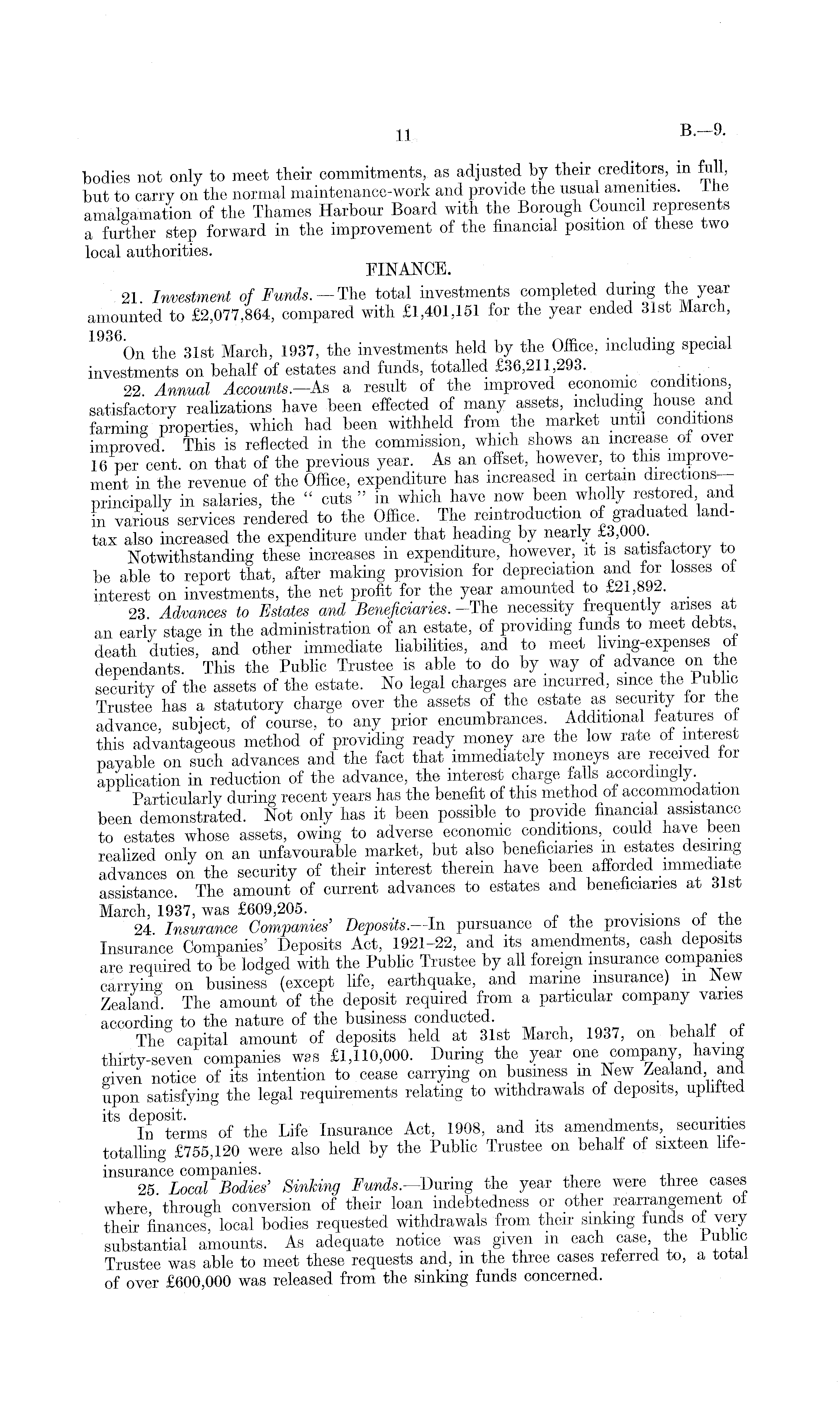 bodies not only to meet their commitments, as adjusted by their creditors, in full, but to carry on the normal maintenance-work and provide the usual amenities, lne amalgamation of the Thames Harbour Board with the Borough Council represents a further step forward in the improvement of the financial position of these two local authorities. FINANCE. 21. Investment of Funds.— The total investments completed during the year amounted to £2,077,864, compared with £1,401,151 for the year ended 31st March, X 9 30 On the 31st March, 1937, the investments held by the Office, including special investments on behalf of estates and funds, totalled £36,211,293. 22. Annual Accounts.—As a result of the improved economic conditions satisfactory realizations have been effected of many assets, including house and farming properties, which had been withheld from the market until conditions improved. This is reflected in the commission, which shows an increase of over 16 per cent, on that of the previous year. As an offset, however, to this improvement in the revenue of the Office, expenditure has increased m certain directionsprincipally in salaries, the " cuts " in which have now been wholly re«tored and in various services rendered to the Office. The remtroduction of graduated landtax also increased the expenditure under that heading by nearly £3,000. Notwithstanding these increases in expenditure, however, it is satisiactory to be able to report that, after making provision for depreciation and for losses ot interest on investments, the net profit for the year amounted to £21,892. 23 Advances to Estates and Beneficiaries. —The necessity frequently arises at an early stage in the administration of an estate, of providing funds to meet debts death duties, and other immediate liabilities, and to meet living-expenses of dependants. This the Public Trustee is able to do by way of advance on the security of the assets of the estate. No legal charges are incurred, since the Public Trustee has a statutory charge over the assets of the estate as security for the advance, subject, of course, to any prior encumbrances. Additional features ot this advantageous method of providing ready money are the low rate of interest payable on such advances and the fact that immediately moneys are received for application in reduction of the advance, the interest charge falls according 7Particularly during recent years has the benefit of this method of accommodation been demonstrated. Not only has it been possible to provide financial assistance to estates whose assets, owing to adverse economic conditions, _ could have been realized only on an unfavourable market, but also beneficiaries m estates desiring advances on the security of their interest therein have been afforded immediate assistance. The amount of current advances to estates and beneficiaries at 31st March, 1937, was £609,205. , 24 Insurance Companies' Deposits. —In pursuance of the provisions of t Insurance Companies' Deposits Act, 1921-22, and its amendments, cash deposits are required to be lodged with the Public Trustee by all foreign insurance companies carrying on business (except life, earthquake, and marine insurance) m New Zealand. The amount of the deposit required from a particular company varies according to the nature of the business conducted. The capital amount of deposits held at 31st March, 1937, on behalf of thirty-seven companies was £1,110,000. During the year one company, avm S given notice of its intention to cease carrying on business m New Zealand and upon satisfying the legal requirements relating to withdrawals of deposits, uplifted its d ®P°^ rmg of the Life Insurance Act, 1908, and its amendments,, securities totalling £755,120 were also held by the Public Trustee on behalf of sixteen lifeinsurance companies. 25 Local Bodies' Sinking Funds.—During the year there were three cases where 'through conversion of their loan indebtedness or other rearrangement of their finances, local bodies requested withdrawals from their sinking funds of very substantial amounts. As adequate notice was given m each case, the Public Trustee was able to meet these requests and, in the three cases referred to, a total of over £600,000 was released from the sinking funds concerned.
