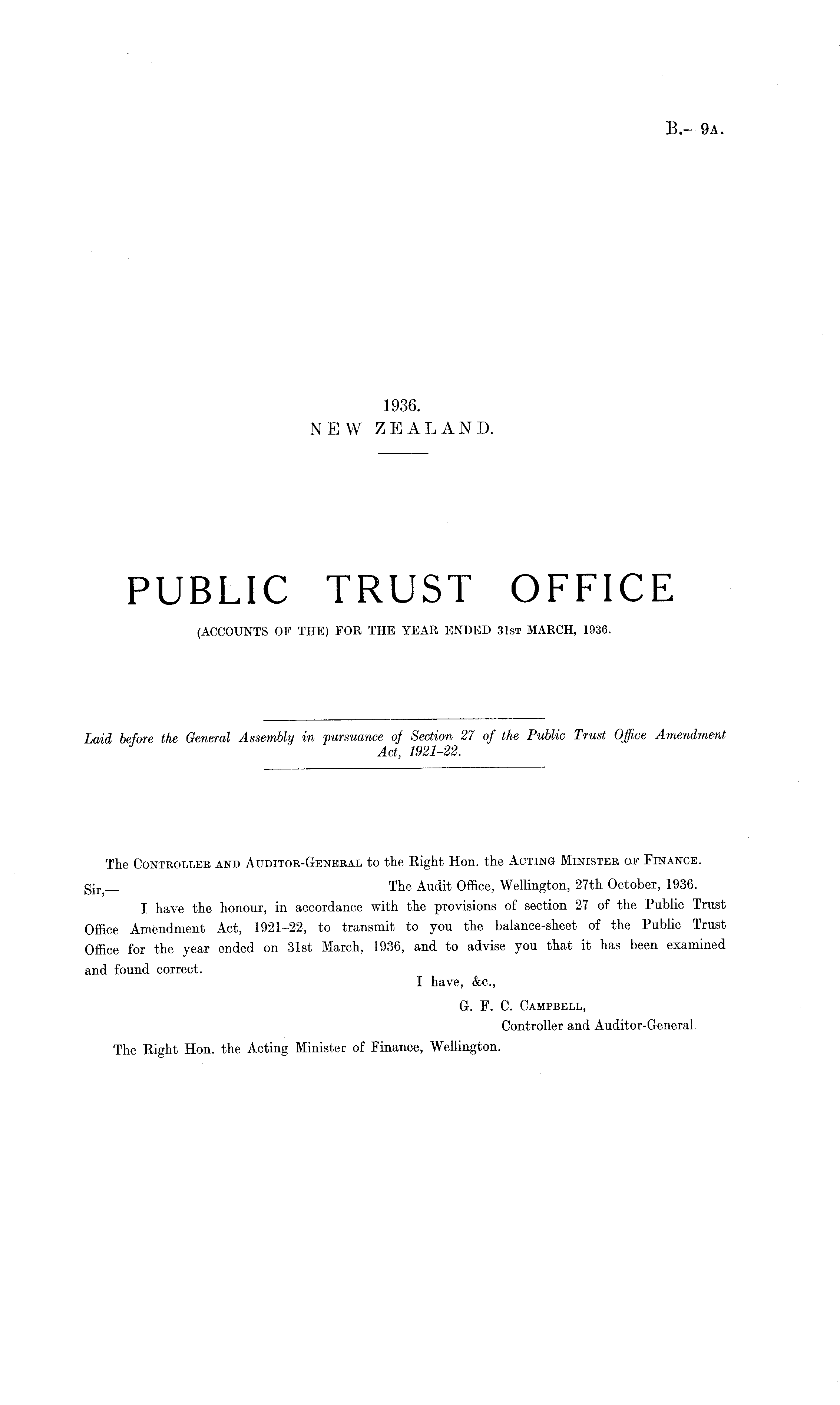 The Controller and Auditor-General to the Right Hon. the Acting Minister of Finance. gj r> The Audit Office, Wellington, 27th October, 1936. I have the honour, in accordance with the provisions of section 27 of the Public Trust Office Amendment Act, 1921-22, to transmit to you the balance-sheet of the Public Trust Office for the year ended on 31st March, 1936, and to advise you that it has been examined and found correct. I have, &c., G. F. C. Campbell, Controller and Auditor-General The Right Hon. the Acting Minister of Finance, Wellington.