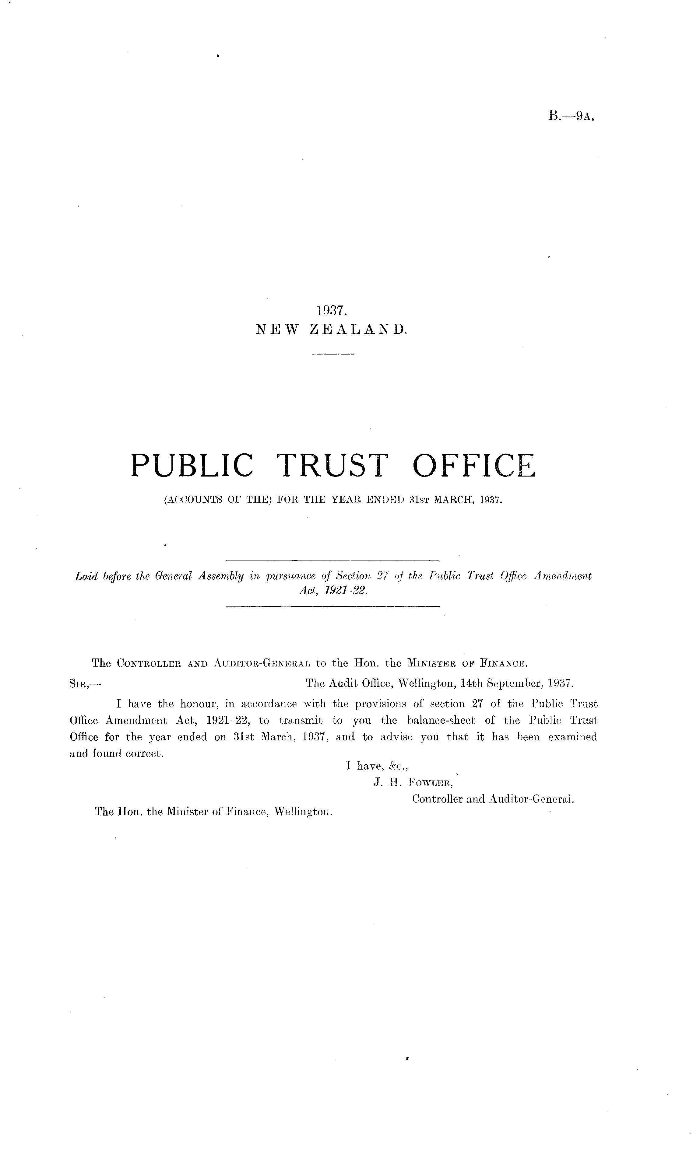 The Controller and Auditor-General to the Hon. the Minister of Finance. Sir, — The Audit Office, Wellington, 14th September, 1937. I have the honour, in accordance with the provisions of section 27 of the Public Trust Office Amendment Act, 1921-22, to transmit to you the balance-sheet of the Public Trust Office for the year ended on 31st March, 1937, and to advise you that it has been examined and found correct. I have, &c., J. H. Fowler, Controller and Auditor-General. The Hon. the Minister of Finance, Wellington.