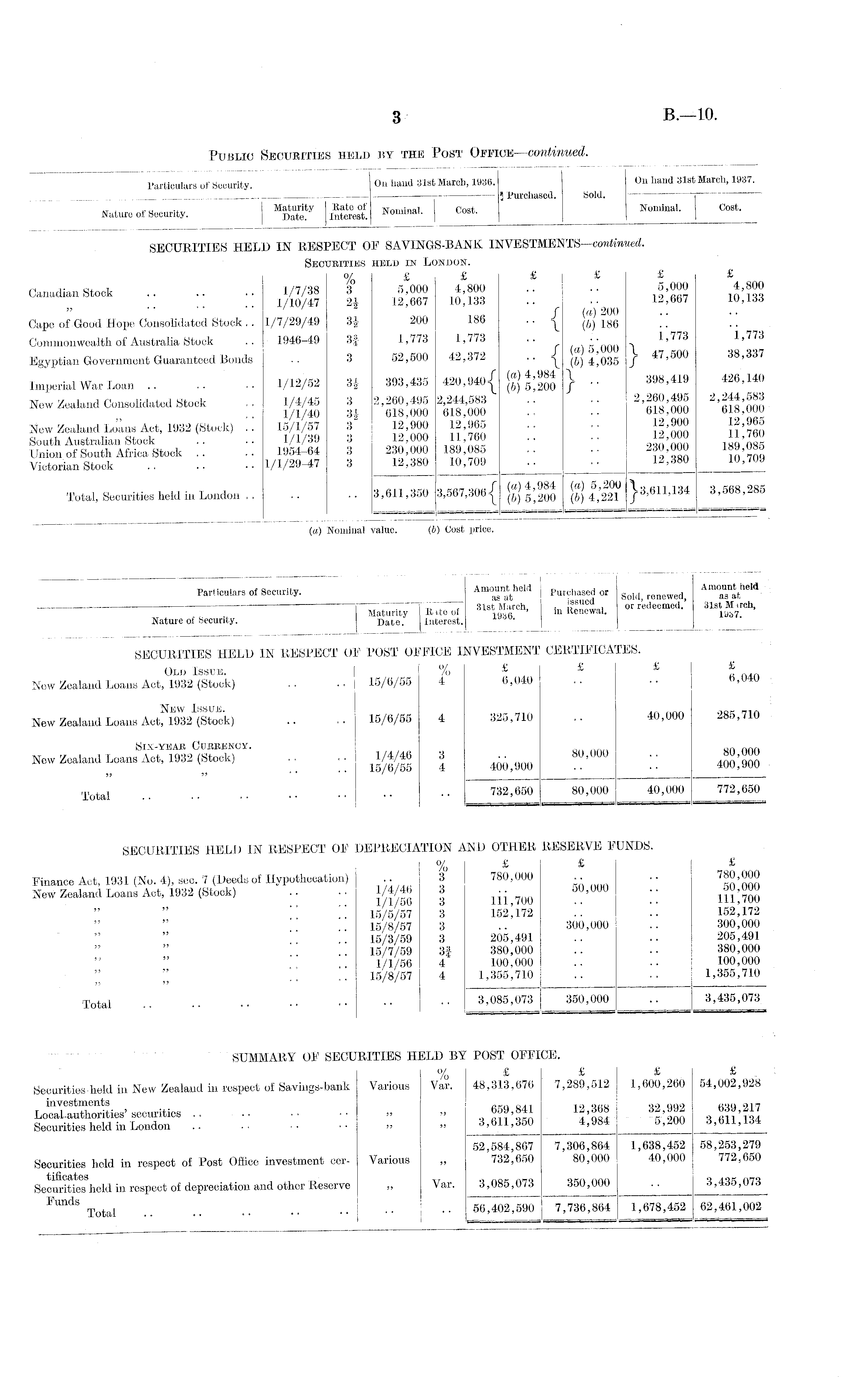 Particulars of Security. On hand 31st March, 1936. On hand 31st March, 1937. — J Purchased. Sold. „ , .. „ .. Maturity Rate of TsrnmiTial Cost Nominal. Cost. Nature of Security. Date / interest. | JNommal - ost ' SECURITIES HELD IN RESPECT OF SAVINGS-BANK INVESTMENTS —continued. Securities held in London. Canadian Stock 1/7/38 3° j?000 4,800 .. .. 5,000 4,800 1/10/47 2J 12,667 10,133 .. •• 12,667 10,133 Cape of Good Hope Consolidated Stock.. 1/7/29/49 3|- 200 186 .. (6)186 Commonwealth of Australia Stock .. 1946-49 3| 1,773 1,773 .. g 000 "1 1,773 Egyptian Government Guaranteed Bonds 3 52,500 42,372 .. (6)4,035 J 38,337 Imperial War Loan 1/12/52 3| 393,435 420,940{ |g } .. 398,419 426,140 New Zealand Consolidated Stock .. 1/4/45 3 2,260,495 2,244,583 ■■ •• J '«?o'nnn "'fits'000 1/1/40 3J 618,000 618,000 .. •• 618,000 618,000 New Zealand Loans Act, 1932 (Stock) .. 15/1/57 3 12,900 12,965 .. •• 19'nno i?'760 South Australian Stock .. .. 1/1/39 3 12,000 11,760 .. .. 12,000 11,760 Union of South Africa Stock .. .. 1954-64 3 *89,085 .. •• io'qso lo'709 Victorian Stock 1/1/29-47 3 12,380 10,709 12 ' 380 10 ' 709 Total, Securities held in London 3,611,350 3,567,30 6 { |> g g foil, 184 3,568,285 (a) Nominal value. (b) Cost price. Particulars of Security. Amountheld p at „ haae d or gol(lj renêwed _ Am ° a TL held — B.ite of 3l8t 19 t 6 rCh ' in Renewal. or redeemed. 31.st M.rch, Nature of Security. Date. Interest. SECURITIES HELD IN RESPECT OP POST OFFICE INVESTMENT CERTIFICATES. Old Issue. % £ £ £ f, New Zealand Loans Act, 1932 (Stock) .. .. 15/6/55 4 6,040 .. b,U4U New Zealand Loans Aotfl932 (Stock) .. .. 15/6/55 4 325,710 .. 40,000 285,710 Six-year Currency. fiA New Zealand Loans Act, 1932 (Stock) .. .. \ 400,900 " 400^900 Total .. .. .. .. .. 732,650 80,000 40,000 772,650 SECURITIES HELD IN RESPECT OF DEPRECIATION AND OTHER RESERVE FUNDS. % £ £ £ Finance Act, 1931 (No. 4), sec. 7 (Deeds of Hypothecation) .. 3 780,000 .. . - 780,000 New Zealand Loans Act, 1932 (Stock) .. jyj/gg 3 lil 700 ' 111^700 !! 15/5/57 3 152472 .. .. 152,172 " 15/8/57 3 .. 300,000 .. 300,000 " " .. 15/3/59 3 205,491 .. .. 205,491 .. 15/7/59 3J 380,000 .. .. 380,000 1/1/56 4 100,000 .. .. 100,000 " " n .. .. 15/8/57 4 1,355,710 .. .. 1,355,710 Total .. .. .. .. .. .. 3,085,073 350,000 .. 3,435,073 SUMMARY OF SECURITIES HELD BY POST OFFICE. % £ £ £ £ Securities held in New Zealand in respect of Savings-bank Various Var. 48,313,676 7,289,512 1,600,260 54,002,928 ,gMg «« z fZ a SHE Securities held in London - » 3,611,350 4,984 5,200 3,611,134 52,584,867 7,306,864 1,638,452 58,253,279 Securities held in respect of Post Office investment cer- Various „ 732,650 80,000 40,000 772,650 Securities held in respect of depreciation and other Reserve „ Var. 3,085,073 350,000 3,435,073 FUndS Total .. .. •• •• •• •• •• 56,402,590 7,736,864 1,678,452 62,461,002