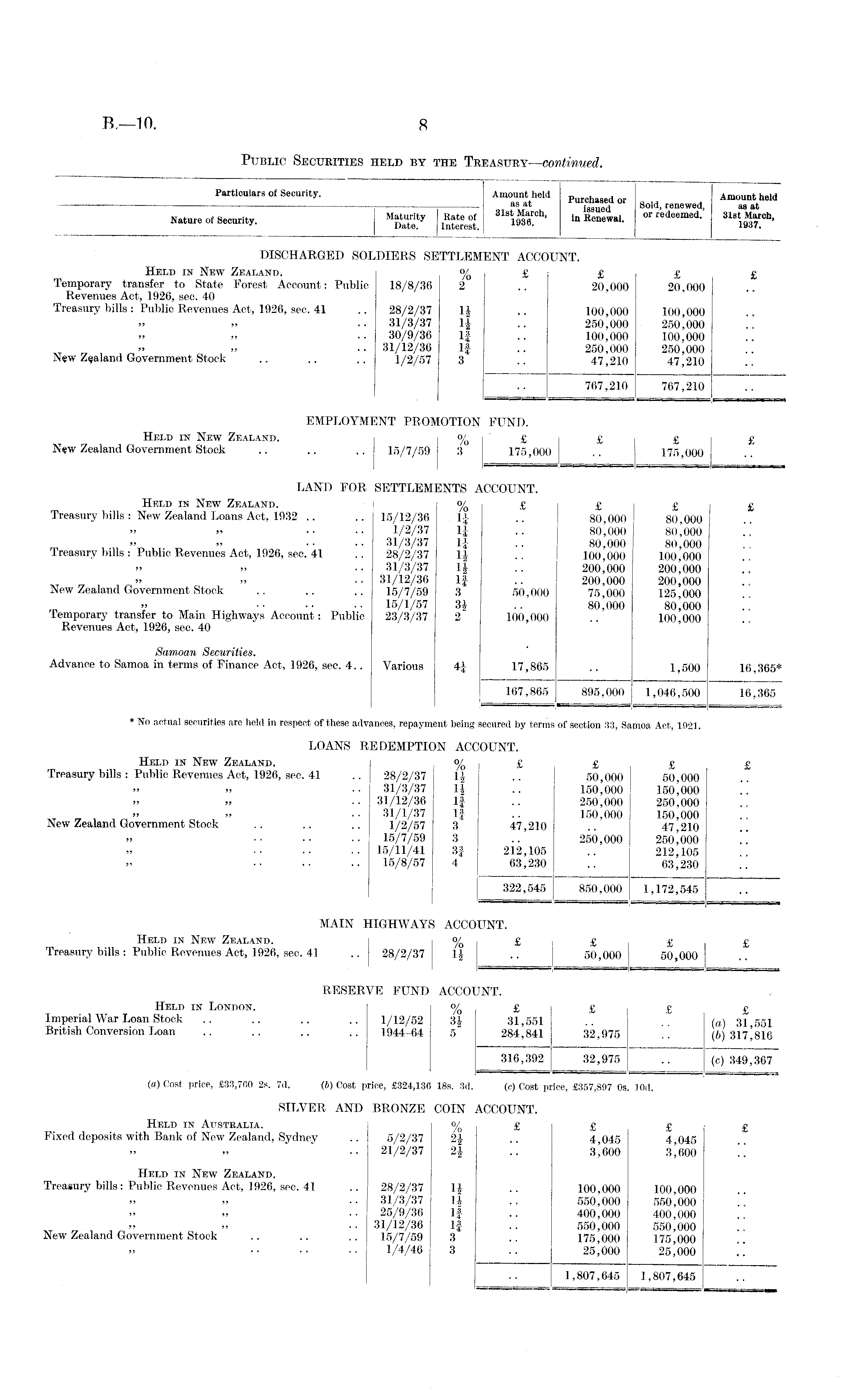 Particulars of Security. Amount held Purchl . aed or Amount held o, ? s „ at „ issued 8old - renewed, as at Nature of Security. j ,^ e °[ 1938 ' i" Renewal. or redeemed. 31st March, DISCHARGED SOLDIERS SETTLEMENT ACCOUNT. Held in New Zealand. % £ £ £ £ Temporary transfer to State Forest Account: Public 18/8/36 2 .. 20,000 20 000 Revenues Act, 1926, sec. 40 Treasury bills: Public Revenues Act, 1926, sec. 41 .. 28/2/37 1J .. 100,000 100,000 31/3/37 1£ .. 250'000 250'000 30/9/36 If .. 100,000 100,000 XT „ , » •• 31/12/36 If .. 250,000 250,000 New Zealand Government Stock .. .. .. 1/2/57 3 .. 47,210 47,210 767,210 767,210 EMPLOYMENT PROMOTION FUND. Held in New Zealand. % ' £ i £ £ £ New Zealand Government Stock .. .. .. 15/7/59 3 175,000 I .. 175,000 LAND FOR SETTLEMENTS ACCOUNT. Held in New Zealand. ! % £ £ £ £ Treasury bills: New Zealand Loans Act, 1932 .. .. 15/12/36 1| .. 80,000 80.000 •• 1/2/37 lj .. 80,000 80,'000 , •• 31/3/37 1J .. 80,000 80,000 Treasury bills: Public Revenues Act, 1926, sec. 41 .. 28/2/37 lj .. 100,000 100,000 31/3/37 lj .. 200000 ! , T „ . >> 31/12/36 lj .. 200,000 200,000 New Zealand Government Stock .. .. .. 15/7/59 3 50,000 75,000 125,000 15/1/57 3f .. 80,000 80',000 Temporary transfer to Main Highways Account: Public 23/3/37 2 100,000 .. 100 000 Revenues Act, 1926, sec. 40 Samoan Securities. Advance to Samoa in terms of Finance Act, 1926, sec. 4.. Various 4-J; 17,865 .. 1,500 16,365* 167,865 895,000 1,046,500 16,365 * No actual securities are held in respect of these advances, repayment being secured by terms of section 33, Samoa Act, 1921. LOANS REDEMPTION ACCOUNT. Held in New Zealand. % £ £ £ £ Treasury bills: Public Revenues Act, 1926, sec. 41 .. 28/2/37 14 .. 50,000 50,000 31/3/37 1J .. iso'ooo 150'000 !. •• 31/12/36 If .. 250,000 250,000 XT _ . , » , " •• 31/1/37 If .. 150,000 150,000 New Zealand Government Stock .. .. .. 1/2/57 3 47,210 .. 47 210 15/7/59 3 ..' 250,000 250'000 15/11/41 3f 212,105 .. 212,105 15/8/57 4 63,230 .. 63,230 322,545 850,000 1,172,545 MAIN HIGHWAYS ACCOUNT. Held in New Zealand. t % £ i £ £ £ Treasury bills: Public Revenues Act, 1926, sec. 41 .. I 28/2/37 lj .. j 50,000 50,000 RESERVE FUND ACCOUNT. Held in London. % £ £ £ £ Imperial War Loan Stock .. .. .. .. 1/12/52 3| 31,551 .. (a) 31551 British Conversion Loan .. .. .. .. 1944-64 5 284,841 32,975 .. (6)317^816 316,392 32,975 .. (c) 349,367 (a) Cost price, £33,700 2s. 7d. (4) Cost price, £324,136 18s. 3d. (c) Cost price, £357,897 0s. lOd. SILVER AND BRONZE COIN ACCOUNT. Held in Australia. % £ £ £ £ Fixed deposits with Bank of New Zealand, Sydney .. 5/2/37 2| .. 4,045 4,045 21/2/37 2| .. 3'600 3 | 600 !! Held in New Zealand, Treasury bills: Public Revenues Act, 1926, sec. 41 .. 28/2/37 lj .. 100,000 100,000 31/3/37 U .. 550'000 " 25/9/36 If .. 400,000 400,000 XT „ , >> „ , » •' 31/12/36 If .. 550,000 550,000 New Zealand Government Stock .. .. .. 15/7/59 3 .. 175,000 175,000 1/4/46 3 .. 25,000 !! 1,807,645 1,807,645