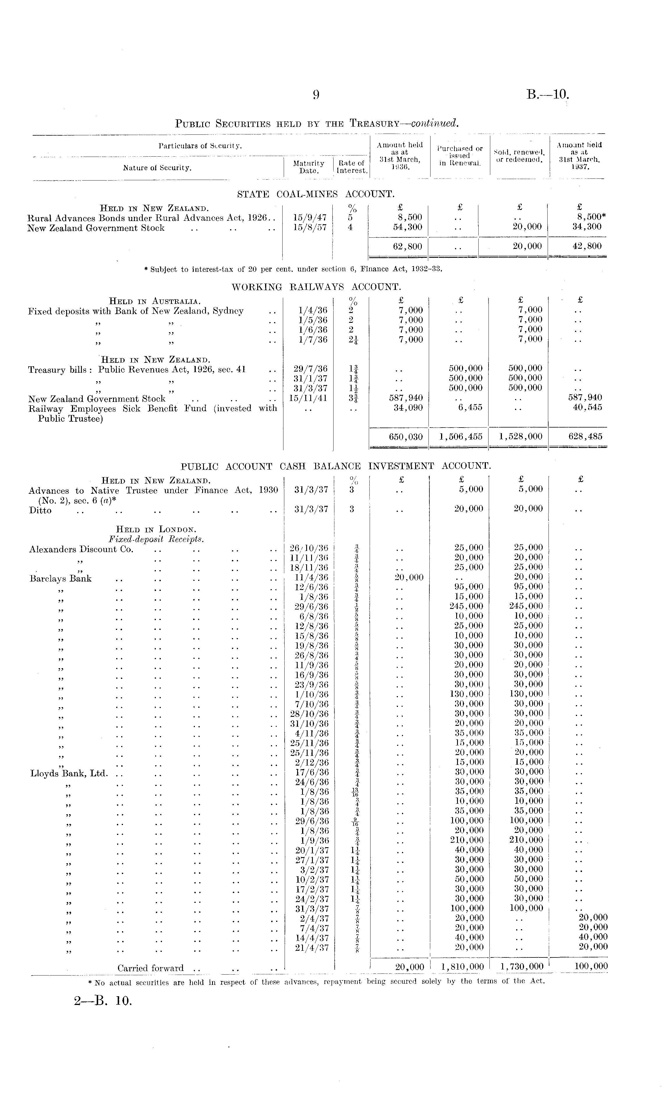 Particulars of Security. Amount hold p 11P » hll ,.j nr Amount held ■ as at ' u or Sold, renewed, as at I *r <- I 31st March, • or redeemed. 31st March. t f c Maturity Rate of 1(1 o« ' in Itenewal. 1(V ,„ Nature ol Security. | Date / interest. 1936 ' lW7 ' STATE COAL-MINES ACCOUNT. Held in New Zealand. % £ £ £ £ Rural Advances Bonds under Rural Advances Act. 1926.. 15/9/47 5 8,500 .. .. 8,500* New Zealand Government Stock .. .. .. 15/8/57 4 54,300 .. 20,000 34,300 62,800 .. 20,000 42,800 * Subject to interest-tax of 20 per cent, under section 6, Finance Act, 1932-33. WORKING RAILWAYS ACCOUNT. Held in Australia. % £ £ £ £ Fixed deposits with Bank of New Zealand, Sydney .. 1/4/36 2 7,000 .. 7,000 1/5/36 2 7,000 .. 7,000 1/6/36 2 7,000 .. 7,000 1/7/36 2J 7,000 .. 7,000 Held in New Zealand. Treasury bills : Public Revenues Act, 1926, sec. 41 .. 29/7/36 If .. 500,000 500,000 31/1/37 If .. 500.000 500,000 31/3/37 11 .. 500,000 500,000 New Zealand Government Stock .. .. .. 15/11/41 3f 587,940 .. •• 587,940 Railway Employees Sick Benefit Fund (invested with .. .. 34,090 6,455 .. 40,545 Public Trustee) 650,030 1,506,455 1,528,000 628,485 PUBLIC ACCOUNT CASH BALANCE INVESTMENT ACCOUNT. Held in New Zealand. % £ £ £ £ Advances to Native Trustee under Finance Act, 1930 31/3/37 3 .. 5,000 5,000 (No. 2), sec. 6 (a)* Ditto 31/3/37 3 .. 20,000 20,000 Held in London. Fixed-deposit Beceipts. Alexanders Discount Co. .. .. .. .. 26/10/36 f .. 25,000 25,000 .. 11/11/36 f .. 20,000 20,000 „ .. .. .. .. 18/11/36 f .. 25,000 25,000 Barclays Bank .. .. .. 11/4/36 f 20,000 20,000 12/6/36 f .. 95,000 95,000 ' .. .. .. .. .. 1/8/36 f .. 15,000 15,000 29/6/36 i .. 245,000 245,000 6/8/36 I .. 10,000 10,000 12/8/36 | .. 25,000 25,000 15/8/36 | .. 10,000 10,000 19/8/36 f .. 30,000 30,000 26/8/36 f .. 30,000 30,000 11/9/36 I .. 20,000 20,000 16/9/36 f .. 30,000 30,000 23/9/36 f .. 30,000 30,000 1/10/36 f .. 130,000 130,000 7/10/36 I .. 30.000 30.000 .. 28/10/36 f .. 30,000 30,000 .. .. .. .. .. 31/10/36 f .. 20,000 20,000 4/11/36 f .. 35,000 35,000 ...... 25/11/36 f .. 15,000 15,000 .. 25/11/36 J .. 20,000 20,000 „ .. .. .. .. .. 2/12/36 f .. 15,000 15,000 Lloyds'Bank, Ltd. .. .. .. .. .. 17/6/36 | .. 30,000 30,000 24/6/36 f .. 30,000 30,000 1/8/36 ■§ .. 35,000 35,000 1/8/36 f .. 10,000 10,000 1/8/36 f .. 35,000 35,000 29/6/36 .. 100,000 100,000 1/8/36 f .. 20,000 20,000 1/9/36 f .. 210,000 210,000 20/1/37 1| .. 40,000 40,000 27/1/37 lj .. 30,000 30,000 " . .. .. .. .. 3/2/37 lj .. 30,000 30,000 10/2/37 1-i- .. 50,000 50,000 ...... 17/2/37 1J .. 30,000 30,000 24/2/37 1J .. 30,000 30,000 31/3/37 J .. 100,000 100,000 ...... 2/4/37 | .. 20,000 .. 20,000 7/4/37 -} .. 20,000 .. 20,000 14/4/37 I .. 40,000 .. 40,000 " .'. .. .. .. .. 21/4/37 I- .. 20,000 .. 20,000 Carried forward .. .. .. 20,000 1 1,810,000 1,730,000 100,000 * No actual securities are held in respect of these advances, repayment being secured solely by the terms of the Act.
