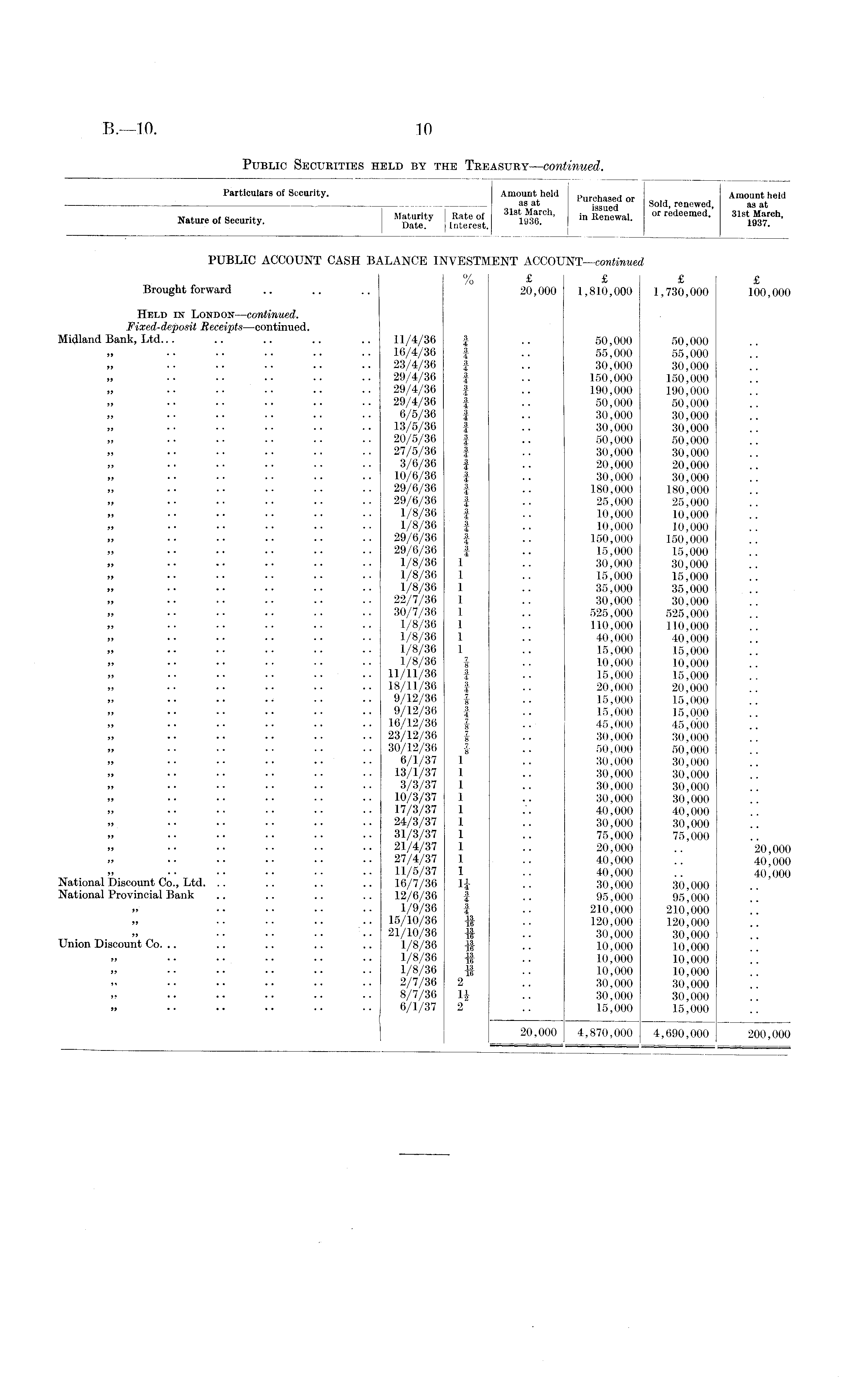 Particulars of Security. Amount held Pllr( . h ., pl , „ P Amount held S : ; as at Suld Sold . renewed, as at M;i111ritv I Rate of March, ■ , or redeemed. 31st March, Nature of Security. Date [Interest. 1936 - m lienewal. lg37 _ PUBLIC ACCOUNT CASH BALANCE INVESTMENT ACCOUNT—continued % £ £ £ £ Brought forward .. .. .. 20,000 1,810,000 1,730,000 100,000 Held in London—continued. Fixed-deposit Receipts—continued. Midland Bank, Ltd... .. .. .. .. 11/4/36 J .. 50,000 50,000 16/4/36 J .. 55,000 55,000 23/4/36 | .. 30,000 30,000 29/4/36 J .. 150,000 150,000 29/4/36 | .. 190,000 190,000 29/4/36 f .. 50,000 50,000 6/5/36 J .. 30,000 30,000 13/5/36 f .. 30,000 30,000 20/5/36 f .. 50,000 50,000 27/5/36 § .. 30,000 30,000 3/6/36 | .. 20,000 20,000 10/6/36 f .. 30,000 30,000 29/6/36 f .. 180,000 180,000 29/6/36 | .. 25,000 25,000 1/8/36 | .. 10,000 10,000 „ ■■ ■■ ■■ ■■ • ■ 1/8/36 f .. 10,000 10,000 29/6/36 | .. 150,000 150,000 29/6/36 | .. 15,000 15,000 1/8/36 1 .. 30,000 30,000 1/8/36 1 .. 15,000 15,000 1/8/36 1 .. 35,000 35,000 22/7/36 1 .. 30,000 30,000 30/7/36 1 .. 525,000 525,000 1/8/36 1 .. 110,000 110,000 1/8/36 1 .. 40,000 40,000 1/8/36 1 .. 15,000 15,000 1/8/36 I .. 10,000 10,000 •• 11/11/36 J .. 15,000 15,000 •• 18/11/36 | .. 20,000 20,000 9/12/36 | .. 15,000 15,000 9/12/36 | .. 15,000 15,000 •• 16/12/36 | .. 45,000 45,000 23/12/36 | .. 30,000 30,000 •• 30/12/36 I .. 50,000 50,000 6/1/37 1 .. 30,000 30,000 13/1/37 I .. 30,000 30,000 3/3/37 1 .. 30,000 30,000 10/3/37 1 .. 30,000 30,000 17/3/37 1 :. 40,000 40,000 24/3/37 1 .. 30,000 30,000 31/3/37 I .. 75,000 75,000 21/4/37 1 .. 20,000 .. 20,000 >> •• •• •• 27/4/37 1 .. 40,000 .. 40,000 » •• •• •• •• 11/5/37 I .. 40,000 .. 40,000 National Discount Co., Ltd. .. .. .. .. 16/7/36 1| .. 30,000 30,000 National Provincial Bank .. .. .. .. 12/6/36 | .. 95,000 !! 1/9/36 f .. 210,000 210|000 !! •• 15/10/36 ■§ .. 120,000 120,000 21/10/36 # .. 30,000 30,000 Union Discount Co. .. .. .. .. .. 1/8/36 $ .. 10,000 10,000 1/8/36 ■§ .. 10,000 10,000 1/8/36 § .. 10,000 10,000 2/7/36 2 .. 30,000 30,000 8/7/36 If .. 30,000 30,000 6/1/37 2 .. 15,000 15,000 20,000 4,870,000 4,690,000 200,000
