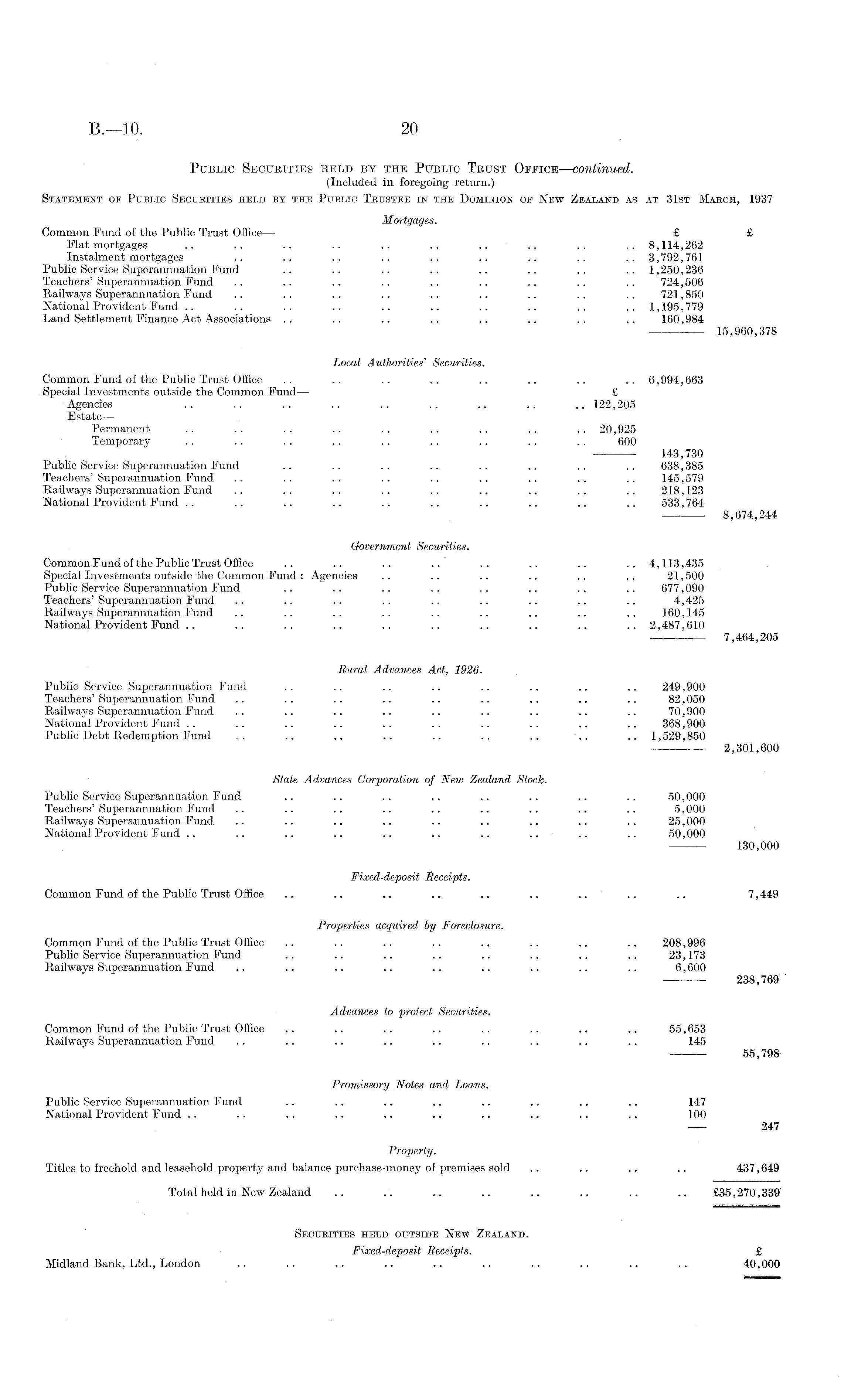 Public Securities held by the Public Trust Office—continued. (Included in foregoing return.) Statement of Public Securities held by the Public Trustee in the Dominion of New Zealand as at 31st March, 1937 Mortgages. Common Fund of the Public Trust Office — £ £ Flat mortgages .. .. .. .. .. .. .. .. .. .. 8,114,262 Instalment mortgages .. .. .. .. .. .. .. .. .. 3,792,761 Public Service Superannuation Fund .. .. .. .. .. .. .. .. 1,250,236 Teachers' Superannuation Fund .. .. .. .. .. .. .. .. .. 724,506 Railways Superannuation Fund .. .. .. .. .. .. .. .. .. 721,850 National Provident Fund .. .. .. .. .. .. .. .. .. .. 1,195,779 Land Settlement Finance Act Associations .. .. .. .. .. .. .. .. 160,984 15,960,378 Local Authorities'' Securities. Common Fund of the Public Trust Office .. .. .. .. .. .. .. .. 6,994,663 Special Investments outside the Common Fund — £ Agencies .. .. .. .. .. .. .. .. .. 122,205 Estate — Permanent .. .. .. .. .. .. .. .. .. 20,925 Temporary .. .. .. .. .. .. .. .. .. 600 143,730 Public Service Superannuation Fund .. .. .. .. .. .. .. .. 638,385 Teachers' Superannuation Fund .. .. .. .. .. .. .. .. .. 145,579 Railways Superannuation Fund .. .. .. .. .. .. .. .. .. 218,123 National Provident Fund .. .. .. .. .. .. .. .. .. .. 533,764 8,674,244 Government Securities. Common Fund of the Public Trust Office .. .. .. .. .. .. .. .. 4,113,435 Special Investments outside the Common Fund: Agencies .. .. .. .. .. .. 21,500 Public Service Superannuation Fund .. .. .. .. .. .. .. .. 677,090 Teachers' Superannuation Fund .. .. .. .. .. .. .. .. .. 4,425 Railways Superannuation Fund .. .. .. .. .. .. .. .. .. 160,145 National Provident Fund .. .. .. .. .. .. .. .. .. .. 2,487,610 7,464,205 Rural Advances Act, 1926. Public Service Superannuation Fund .. .. .. .. .. .. .. .. 249,900 Teachers' Superannuation Fund .. .. .. .. .. .. .. .. .. 82,050 Railways Superannuation Fund .. .. .. .. .. .. .. .. .. 70,900 National Provident Fund .. .. .. .. .. .. .. .. .. .. 368,900 Public Debt Redemption Fund .. .. .. .. .. .. .. .. 1,529,850 2,301,600 State Advances Corporation of New Zealand Stock. Public Service Superannuation Fund .. .. .. .. .. .. .. .. 50,000 Teachers' Superannuation Fund .. .. .. .. .. .. .. .. .. 5,000 Railways Superannuation Fund .. .. .. .. .. .. .. .. .. 25,000 National Provident Fund .. .. .. .. .. .. .. .. .. .. 50,000 130,000 Fixed-deposit Receipts. Common Fund of the Public Trust Office .. .. .. .. .. .. .. .. .. 7,449 Properties acquired by Foreclosure. Common Fund of the Public Trust Office .. .. .. .. .. .. .. .. 208,996 Public Service Superannuation Fund .. .. .. .. .. .. .. .. 23,173 Railways Superannuation Fund .. .. .. .. .. .. .. .. .. 6,600 238,769 Advances to protect Securities. Common Fund of the Public Trust Office .. .. .. .. .. .. .. .. 55,653 Railways Superannuation Fund .. .. .. .. .. .. .. .. .. 145 55,798 Promissory Notes and Loans. Public Service Superannuation Fund .. .. .. .. .. .. .. .. 147 National Provident Fund .. .. .. .. .. .. .. .. .. .. 100 247 Property. Titles to freehold and leasehold property and balance purchase-money of premises sold .. .. .. .. 437,649 Total held in New Zealand .. .. .. .. .. .. .. .. £35,270,339 Securities held outside New Zealand. Fixed-deposit Receipts. £ Midland Bank, Ltd., London .. .. .. .. .. .. .. .. .. .. 40,000