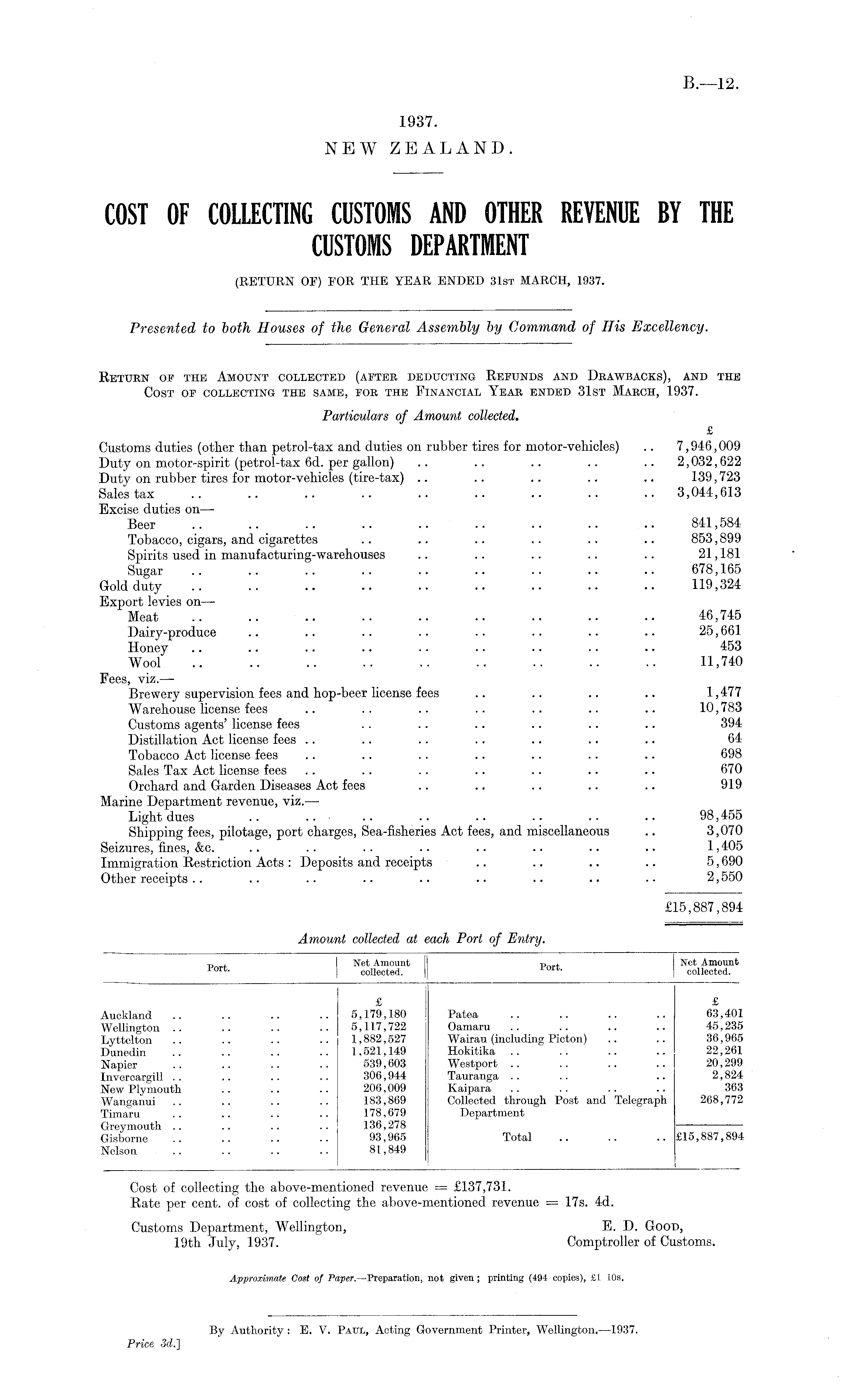 Cost of collecting the above-mentioned revenue = £137,731. Rate per cent, of cost of collecting the above-mentioned revenue = 17s. 4d. Customs Department, Wellington, E. D. Good, 19th July, 1937. Comptroller of Customs. Approximate Cost of Paper.—Preparation, not given; printing (494 copies), £1 10s.