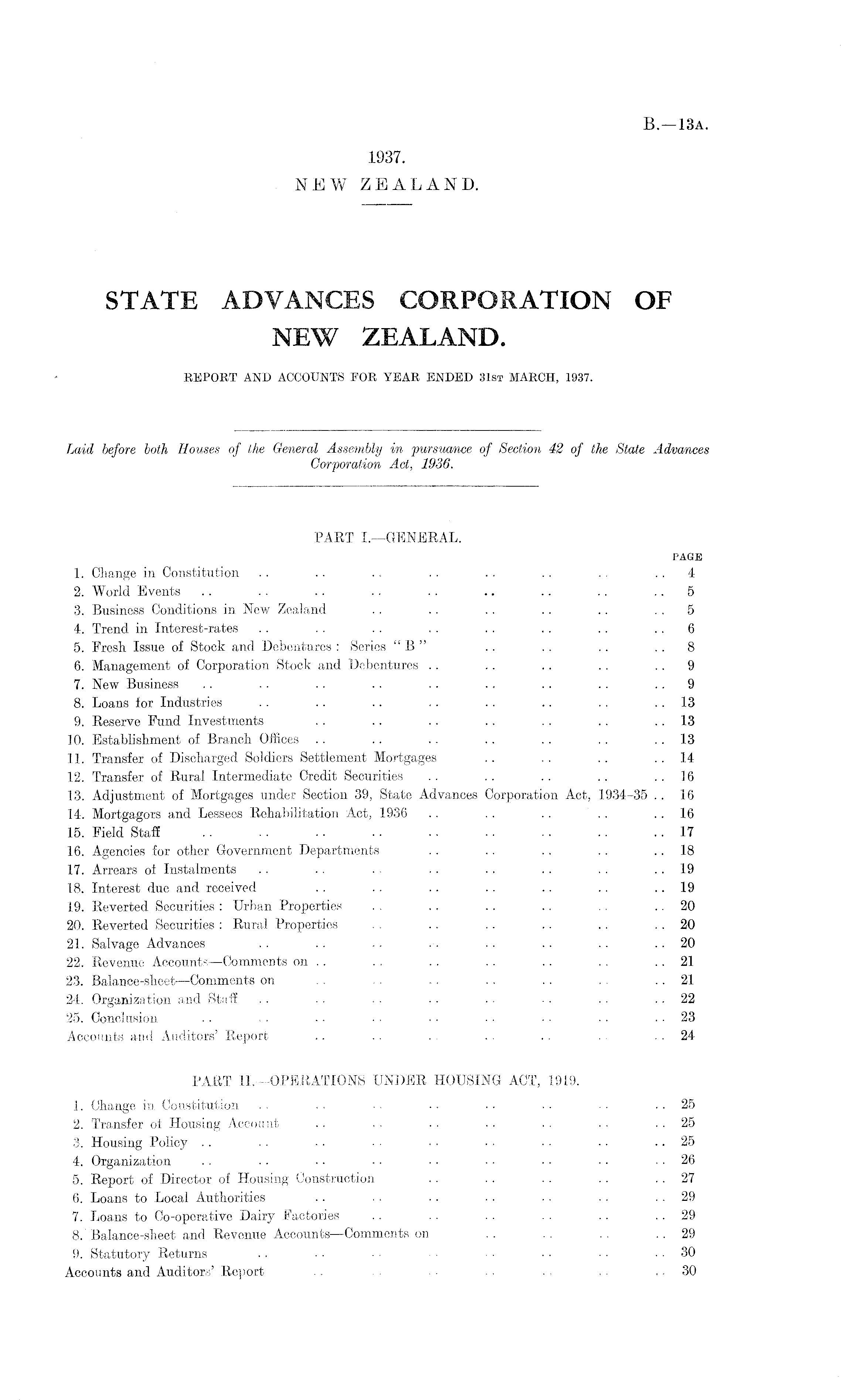 PART I. —GENERAL. PAGE 1. Change in Constitution . . .. .. .. .. .. .. 4 2. World Events .. . . .. . . . . .. .. .. 5 3. Business Conditions in New Zealand . . . . .. .. .. 5 4. Trend in Interest-rates . . . . .. .. .. .. . . 6 5. Fresh Issue of Stock and Debentures : Series "B " .. .. .. 8 6. Management of Corporation Stock and Debentures .. . . . . .. 9 7. New Business ~ .. .. .. .. .. .. .. 9 8. Loans for Industries .. .. .. .. . . .. .. .. 13 9. Reserve Fund Investments .. .. .. . . . . . . .. 13 10. Establishment of Branch Offices .. .. . . .. .. . . . . 13 11. Transfer of Discharged Soldiers Settlement Mortgages .. .. .. ..14 12. Transfer of Rural Intermediate Credit Securities .. .. . . . . 16 13. Adjustment of Mortgages under Section 39, State Advances Corporation Act, 1934-35 . . 16 14. Mortgagors and Lessees Rehabilitation Act, 1936 .. .. .. .. .. 16 15. Field Staff .. .. 17 16. Agencies for other Government Departments . . .. . . . . .. 18 17. Arrears of Instalments .. .. . . . . . . .. . . . . 19 18. Interest due and received .. . . .. .. .. .. .. 19 19. Reverted Securities : Urban Properties . . .. .. .. .. .. 20 20. Reverted Securities : Rural Properties . . . . .. .. . . .. 20 21. Salvage Advances .. ... .. •• .. .. ..20 22. Revenue Accounts —Comments on .. . . . . . . .. . . . . 21 23. Balance-sheet—Comments on . . . . . . . . . . . . . . 21 24. Organization and Staff . . .. . . . . . . .. . . 22 25. Conclusion .. . • • ■ ■ ■ • ■ • • • ■ ■. . . 23 Accounts and Auditors' Report .. . . . . . . ... . . . 24 PART lI,— OPERATIONS UNDER HOUSING ACT, 1919. 1. Change in Constitution . . . . . . .. .. .. •. .. 25 2. Transfer of Housing Account . . . . .. .. . . . . 25 3. Housing Policy .. .. • • •. • • • • • ■ • • .. 25 4. Organization . . • • ■ • ■ ■ ■ • • • • • • • . . 26 5. Report of Director of Housing Construction . . .. . . . . . . 27 6. Loans to Local Authorities .. . . .. .. . . . . . . 29 7. Loans to Co-operative Dairy Factories . . . . . . . . . . . . 29 8. Balance-sheet and Revenue Accounts—Comments on .. .. .. ..29 9. Statutory Returns .. • ■ • ■ • ■ ■ ■ • 30 Accounts and Auditors' Report . . . . 30