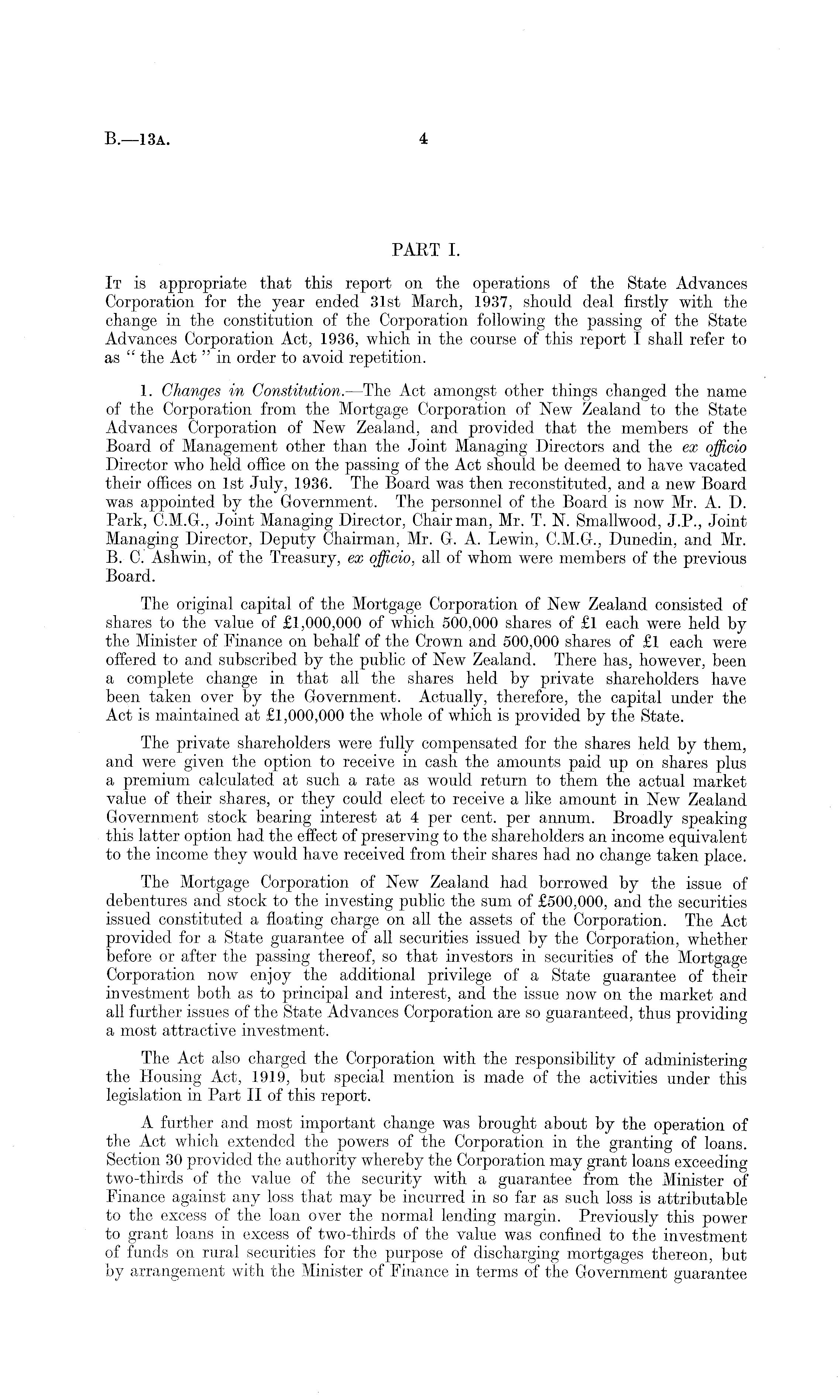 PART I. It is appropriate that this report on the operations of the State Advances Corporation for the year ended 31st March, 1937, should deal firstly with the change in the constitution of the Corporation following the passing of the State Advances Corporation Act, 1936, which in the course of this report I shall refer to as " the Act " in order to avoid repetition. 1. Changes in Constitution. —The Act amongst other things changed the name of the Corporation from the Mortgage Corporation of New Zealand to the State Advances Corporation of New Zealand, and provided that the members of the Board of Management other than the Joint Managing Directors and the ex officio Director who held office on the passing of the Act should be deemed to have vacated their offices on Ist July, 1936. The Board was then reconstituted, and a new Board was appointed by the Government. The personnel of the Board is now Mr. A. D. Park, C.M.G., Joint Managing Director, Chairman, Mr. T. N. Smallwood, J.P., Joint Managing Director, Deputy Chairman, Mr. 0. A. Lewin, C.M.G., Dunedin, and Mr. B. C. Asliwin, of the Treasury, ex officio, all of whom were members of the previous Board. The original capital of the Mortgage Corporation of New Zealand consisted of shares to the value of £1,000,000 of which 500,000 shares of £l each were held by the Minister of Finance on behalf of the Crown and 500,000 shares of £l each were offered to and subscribed by the public of New Zealand. There has, however, been a complete change in that all the shares held by private shareholders have been taken over by the Government. Actually, therefore, the capital under the Act is maintained at £1,000,000 the whole of which is provided by the State. The private shareholders were fully compensated for the shares held by them, and were given the option to receive in cash the amounts paid up on shares plus a premium calculated at such a rate as would return to them the actual market value of their shares, or they could elect to receive a like amount in New Zealand Government stock bearing interest at 4 per cent, per annum. Broadly speaking this latter option had the effect of preserving to the shareholders an income equivalent to the income they would have received from their shares had no change taken place. The Mortgage Corporation of New Zealand had borrowed by the issue of debentures and stock to the investing public the sum of £500,000, and the securities issued constituted a floating charge on all the assets of the Corporation. The Act provided for a State guarantee of all securities issued by the Corporation, whether before or after the passing thereof, so that investors in securities of the Mortgage Corporation now enjoy the additional privilege of a State guarantee of their investment both as to principal and interest, and the issue now on the market and all further issues of the State Advances Corporation are so guaranteed, thus providing a most attractive investment. The Act also charged the Corporation with the responsibility of administering the Housing Act, 1919, but special mention is made of the activities under this legislation in Part II of this report. A further and most important change was brought about by the operation of the Act which extended the powers of the Corporation in the granting of loans. Section 30 provided the authority whereby the Corporation may grant loans exceeding two-thirds of the value of the security with a guarantee from the Minister of Finance against any loss that may be incurred in so far as such loss is attributable to the excess of the loan over the normal lending margin. Previously this power to grant loans in excess of two-thirds of the value was confined to the investment of funds on rural securities for the purpose of discharging mortgages thereon, bat by arrangement with the Minister of Finance in terms of the Government guarantee
