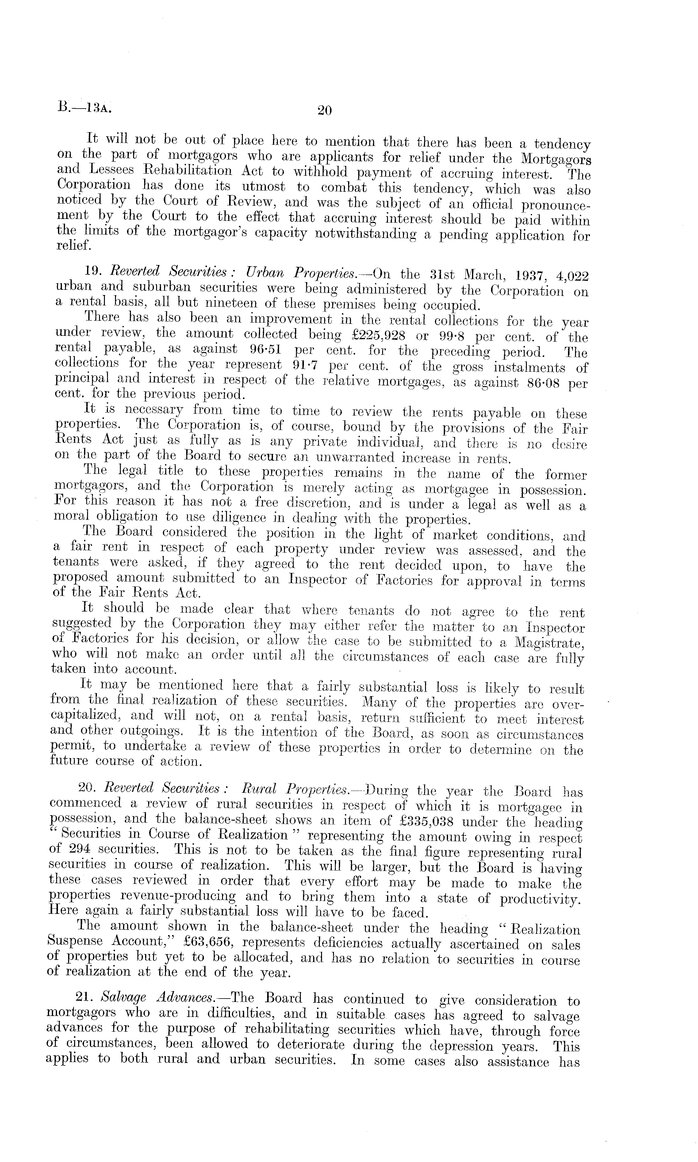 It will not be out of place here to mention that there has been a tendency on the part of mortgagors who are applicants for relief under the Mortgagors and Lessees Rehabilitation Act to withhold payment of accruing interest. The Corporation has done its utmost to combat this tendency, which was also noticed by the Court of Review, and was the subject of an official pronouncement by the Court to the effect that accruing interest should be paid within the limits of the mortgagor's capacity notwithstanding a pending application for relief. 19. Reverted Securities: Urban Properties.—On the 31st March, 1937, 4,022 urban and suburban securities were being administered by the Corporation on a rental basis, all but nineteen of these premises being occupied. There has also been an improvement in the rental collections for the year under review, the amount collected being £225,928 or 99-8 per cent, of the rental payable, as against 96*51 per cent, for the preceding period. The collections for_ the year represent 91-7 per cent, of the gross instalments of principal and interest in respect of the relative mortgages, as against 86-08 per cent, for the previous period. It is necessary from time to time to review the rents payable on these properties. The Corporation is, of course, bound by the provisions of the Fair Rents Act just as fully as is any private individual, and there is no desire on the part of the Board to secure an unwarranted increase in rents. The legal title to these properties remains in the name of the former mortgagors, and the Corporation is merely acting as mortgagee in possession. For this reason it has not a free discretion, and is under a legal as well as a moral obligation to use diligence in dealing with the properties. The Board considered the position in the light of market conditions, and a fair rent in respect of each property under review was assessed, and the tenants were asked, if they agreed to the rent decided upon, to have the proposed amount submitted to an Inspector of Factories for approval in terms of the Fair Rents Act. It should be made clear that where tenants do not agree to the rent suggested by the Corporation they may either refer the matter to an Inspector of Factories for his decision, or allow the case to be submitted to a Magistrate, who will not make an order until all the circumstances of each case are fully taken into account. It may be mentioned here that a fairly substantial loss is likely to result from the final realization of these securities. Many of the properties are overcapitalized, and will not, on a rental basis, return sufficient to meet interest and other outgoings. It is the intention of the Board, as soon as circumstances permit, to undertake a review of these properties in order to determine on the future course of action. 20. Reverted Securities: Rural Properties.- During the year the Board has commenced a review of rural securities in respect of which it is mortgagee in possession, and the balance-sheet shows an item of £335,038 under the "heading " Securities in Course of Realization " representing the amount owing in respect of 294 securities. This is not to be taken as the final figure representing rural securities in course of realization. This will be larger, but the Board is having these cases reviewed in order that every effort may be made to make the properties revenue-producing and to bring them into a state of productivity. Here again a fairly substantial loss will have to be faced. The amount shown in the balance-sheet under the heading "Realization Suspense Account," £63,656, represents deficiencies actually ascertained on sales of properties but yet to be allocated, and has no relation to securities in course of realization at the end of the year. 21. Salvage Advances. The Board has continued to give consideration to mortgagors who are in difficulties, and in suitable cases has agreed to salvage advances for the purpose of rehabilitating securities which have, through force of circumstances, been allowed to deteriorate during the depression years. This applies to both rural and urban securities. In some cases also assistance has
