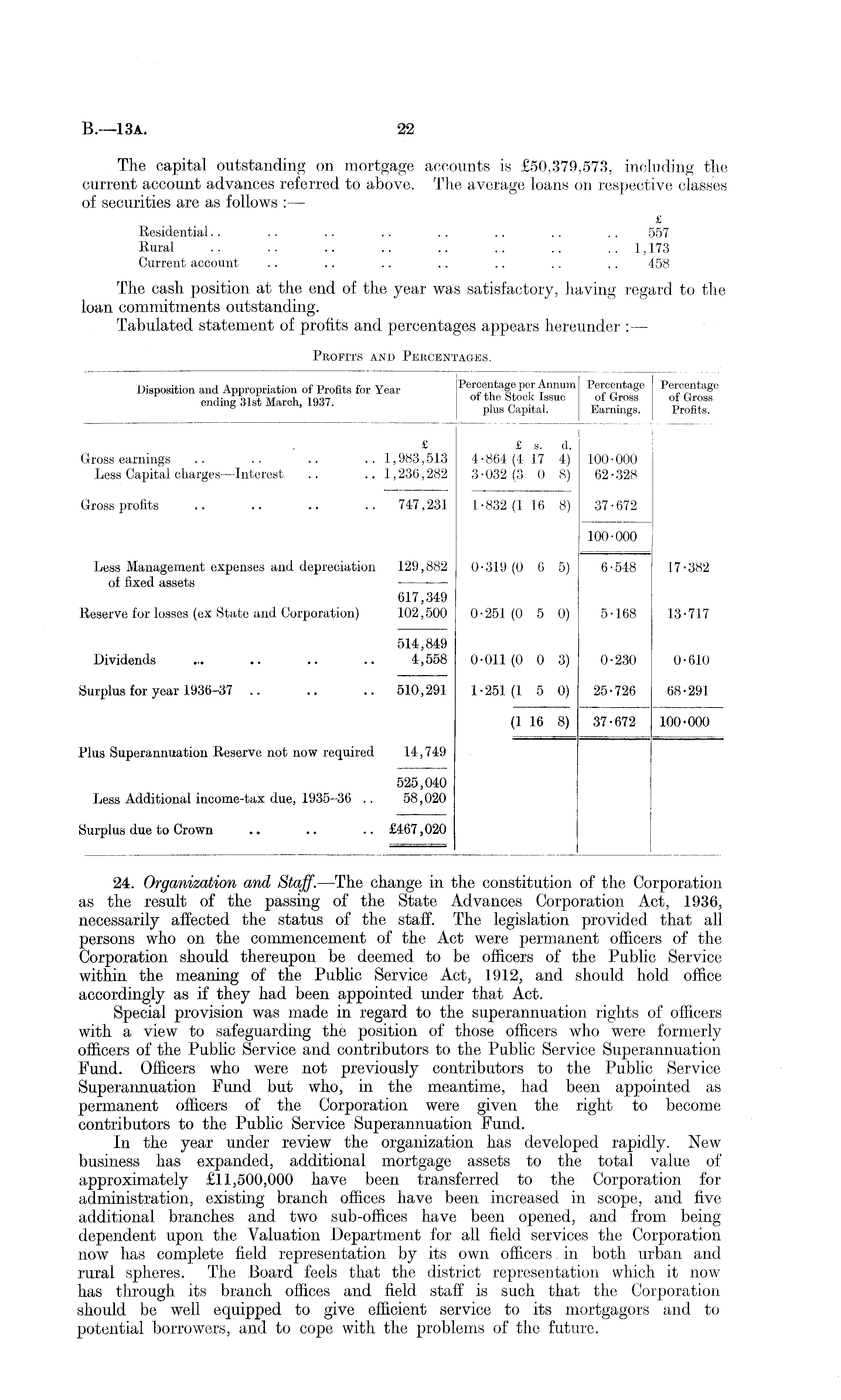 24. Organization and Staff. —-The change in the constitution of the Corporation as the result of the passing of the State Advances Corporation Act, 1936, necessarily affected the status of the staff. The legislation provided that all persons who on the commencement of the Act were permanent officers of the Corporation should thereupon be deemed to be officers of the Public Service within the meaning of the Public Service Act, 1912, and should hold office accordingly as if they had been appointed under that Act. Special provision was made in regard to the superannuation rights of officers with a view to safeguarding the position of those officers who were formerly officers of the Public Service and contributors to the Public Service Superannuation Fund. Officers who were not previously contributors to the Public Service Superannuation Fund but who, in the meantime, had been appointed as permanent officers of the Corporation were given the right to become contributors to the Public Service Superannuation Fund. In the year under review the organization has developed rapidly. New business has expanded, additional mortgage assets to the total value of approximately £11,500,000 have been transferred to the Corporation for administration, existing branch offices have been increased in scope, and five additional branches and two sub-offices have been opened, and from being dependent upon the Valuation Department for all field services the Corporation now has complete field representation by its own officers, in both urban and rural spheres. The Board feels that the district representation which it now has through its branch offices and field staff is such that the Corporation should be well equipped to give efficient service to its mortgagors and to potential borrowers, and to cope with the problems of the future.