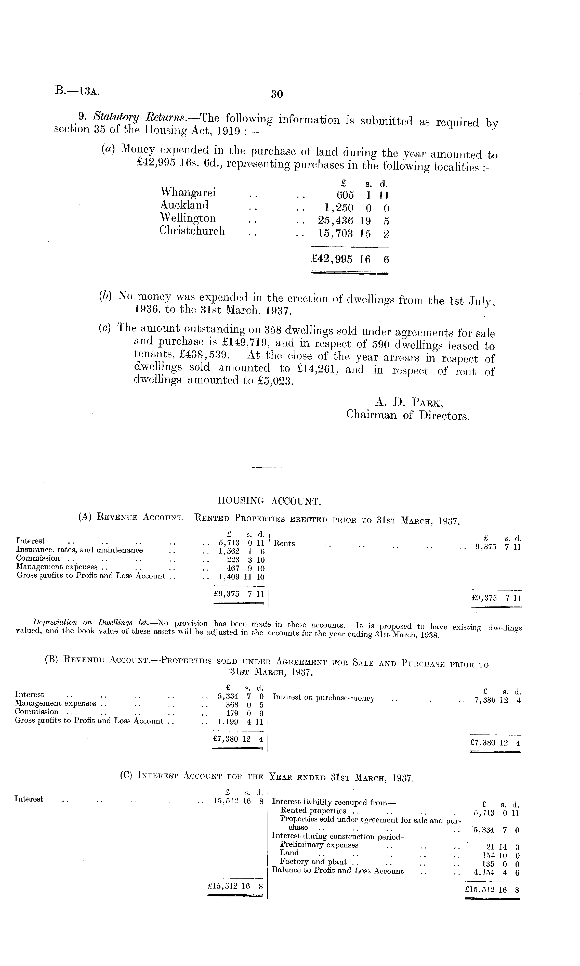 9. Statutory Returns,—The following information is submitted as required by section 35 of the Housing Act, 1919 : — (а) Money expended in the purchase of land during the year amounted to £42,995 16s. 6d., representing purchases in the following localities £ s. d. Whangarei .. . . 605 1 II Auckland . . . . 1 ,'250 0 0 Wellington . . . . 25,436 19 5 Chnstchurch .. .. 15,703 15 2 £42,995 16 6 (б) No money was expended in the erection of dwellings from the Ist Jul v 1936, to the 31st March, 1937. ' ' (c) The amount outstanding on 358 dwellings sold under agreements for sale and purchase is £149,719, and in respect of 590 dwellings leased to tenants, £438,539. At the close of the year arrears in respect of dwellings sold amounted to £14,261, and in respect of rent of dwellings amounted to £5,023. A. D. Park, Chairman of Directors.