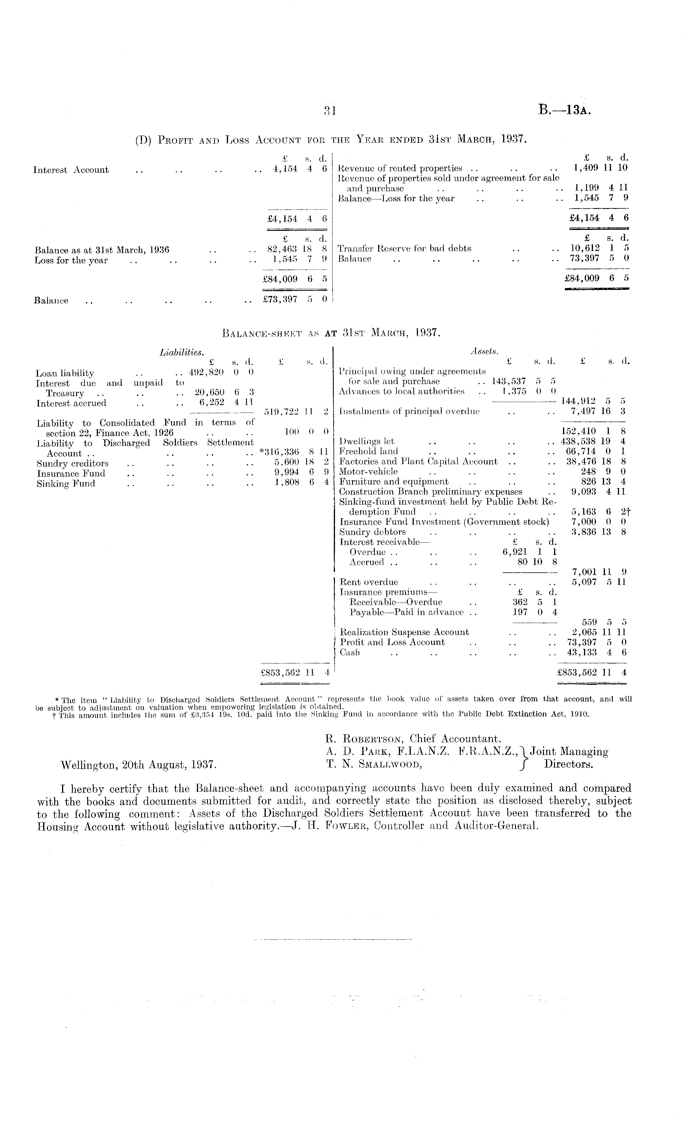 (D) Profit and Loss Account for the Year ended 31st March, 1937. £ s. d. £ s. d. Interest Account .. .. •• .. 4,154 4 6 Revenue of rented properties .. .. .. 1,409 11 10 Revenue of properties sold under agreement for sale and purchase .. .. •• 1,199 411 Balance —Loss for the year .. .. 1,545 7 9 £4,154 4 6 £4,154 4 6 £ s. d. £ s. d. Balance as at 31st March, 1936 .. .. 82,463 18 8 Transfer Reserve for bad debts .. .. 10,612 1 5 Loss for the year .. .. .. .. 1,545 7 9 Balance .. .. .. .. .. 73,397 5 0 £84,009 6 5 £84,009 6 5 Balance .. .. .. • ■ £73,397 5 0 Balance-sheet as at 31st March, 1937. Liabilities. Assets. £ s. d. £ s. d. £ s. d. £ s. d. Loan liability .. .. 492,820 0 0 Principal owing under agreements Interest due and unpaid to tor sale and purchase .. 143,537 5 5 Treasury .. .. .. 20,650 6 3 Advances to local authorities .. 1,375 0 0 Interest accrued .. .. 6,252 411 144,912 5 5 519,722 11 2 Instalments of principal overdue .. .. 7,497 16 3 Liability to Consolidated Fund in terms of section 22, Finance Act, 1926 .. 100 0 0 152,410 1 8 Liability to Discharged Soldiers Settlement Dwellings Jet .. .. .. .. 438,538 19 4 Account .. .. .. •• *316,336 8 11 Freehold land .. .. .. .. 66,714 0 1 Sundry creditors .. .. •• 5,600 18 2 Factories and Plant Capital Account .. .. 38,476 18 8 Insurance Fund .. .. .. .. 9,994 6 9 Motor-vehicle .. .. .. .. 248 9 0 Sinking Fund .. . ■ .. •• 1,808 6 4 Furniture and equipment .. .. .. 826 13 4 Construction Branch preliminary expenses .. 9,093 411 Sinking-fund investment held by Public Debt Redemption Fund .. .. .. .. 5,163 6 2f Insurance Fund Investment (Government stock) 7,000 0 0 Sundry debtors .. .. .. .. 3,836 13 8 Interest receivable— £ s. d. Overdue .. .. .. 6,921 1 1 Accrued .. .. .. 80 10 8 7,001 11 9 Rent overdue .. .. .. .. 5,097 511 Insurance premiums— £ s. d. Receivable—Overdue .. 362 5 1 Payable—Paid in advance .. 197 0 4 | 559 5 5 | Realization Suspense Account .. .. 2,065 11 11 Profit and Loss Account .. .. .. 73,397 5 0 Cash .. .. .. .. .. 43,133 4 6 £853,562 11 4 1 £853,562 11 4 * The item "Liability to Discharged Soldiers Settlement Account" represents the book value of assets taken over from that account, and will be subject to adjustment on valuation when empowering legislation is obtained. t This amount includes the sum of £3,354 10s. 10d. paid into the Sinking Fund in accordance with the Public Debt Extinction Act, 1910. R. Robertson, Chief Accountant. A. D. Park, F.I.A.N.Z. F.R.A.N.Z.,\Joint Managing Wellington, 20th August, 1937. T. N. Smallwood, / Directors. I hereby certify that the Balance-sheet and accompanying accounts have been duly examined and compared with the books and documents submitted for audit, and correctly state the position as disclosed thereby, subject to the following comment: Assets of the Discharged Soldiers Settlement Account have been transferred to the Housing Account, without legislative authority. —J. H. Fowler, Controller and Auditor-General.