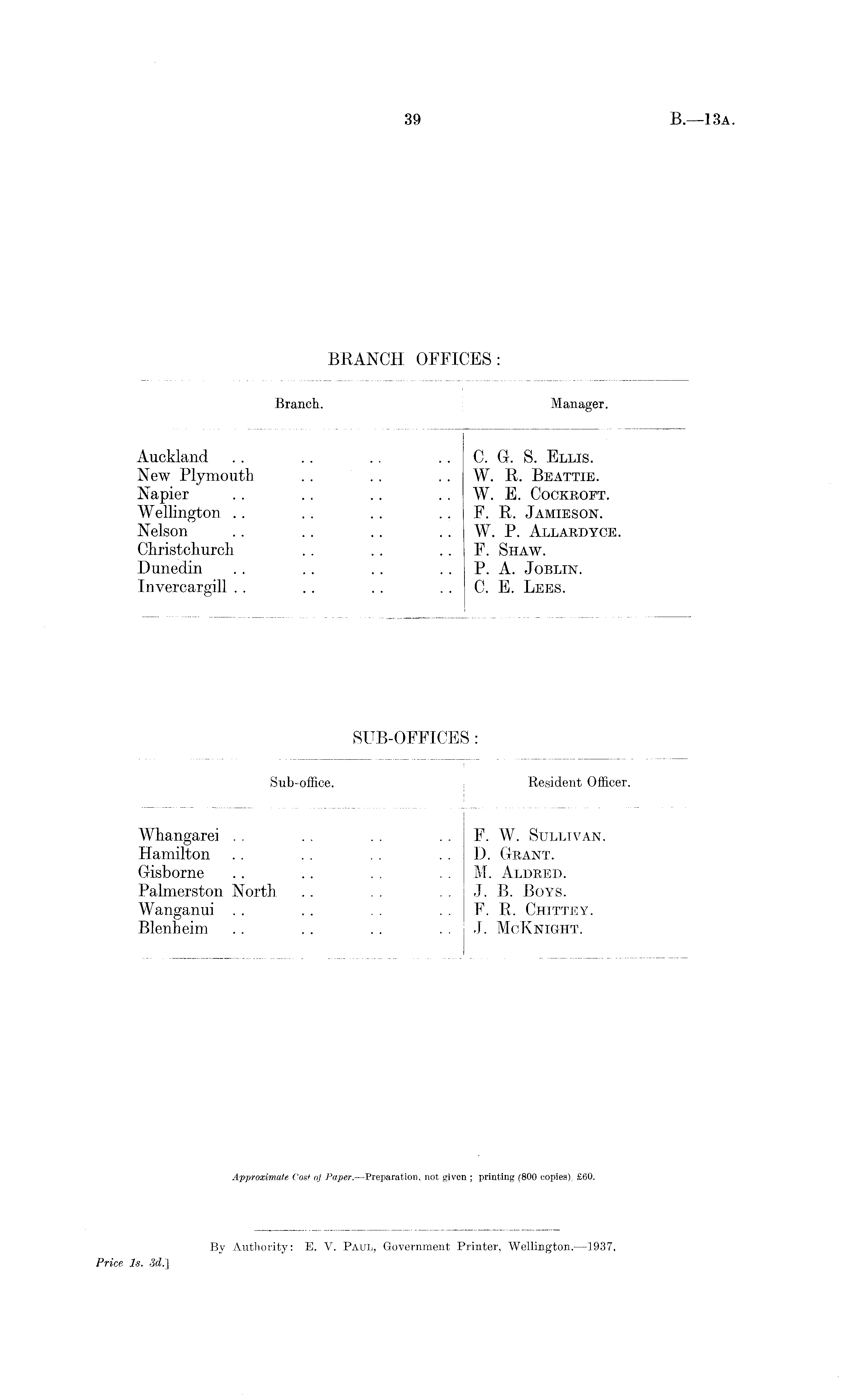Sub-office. Resident Officer. Whangarei . . .. . . F. W. Sullivan. Hamilton .. . . . . D. Grant. Gisborne .. .. . . M. Aldred. Palmerston North .. . . J. B. Boys. Wanganui . . . . . . F. R. Chittey. Blenheim .. . . .. J. McKnight.