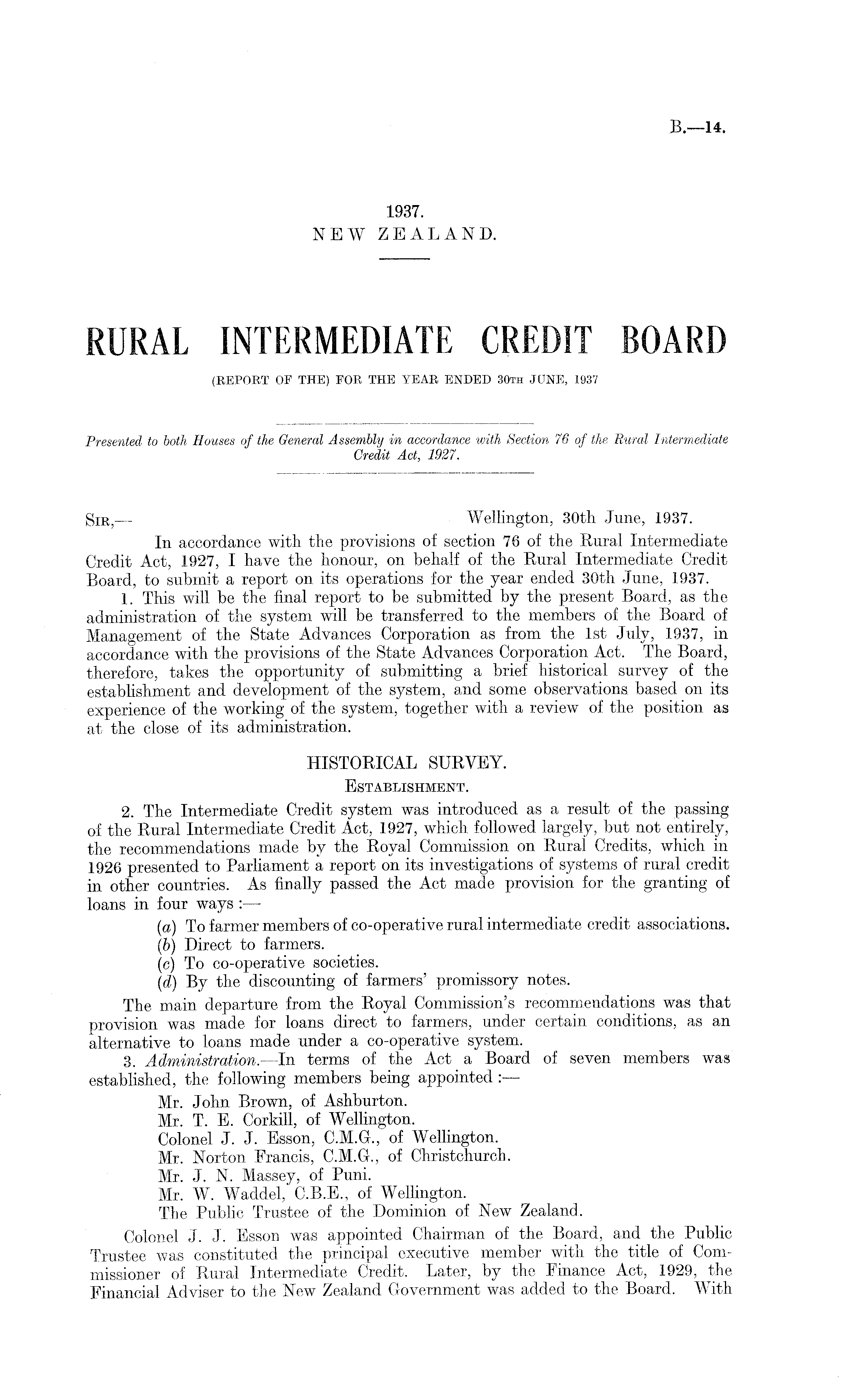 SiKj— Wellington, 30th June, 1937. In accordance with the provisions of section 76 of the Rural Intermediate Credit Act, 1927, I have the honour, on behalf of the Rural Intermediate Credit Board, to submit a report on its operations for the year ended 30th June, 1937. 1. This will be the final report to be submitted by the present Board, as the administration of the system will be transferred to the members of the Board of Management of the State Advances Corporation as from the Ist July, 1937, in accordance with the provisions of the State Advances Corporation Act. The Board, therefore, takes the opportunity of submitting a brief historical survey of the establishment and development of the system, and some observations based on its experience of the working of the system, together with a review of the position as at the close of its administration. HISTORICAL SURVEY. Establishment. 2. The Intermediate Credit system was introduced as a result of the passing of the Rural Intermediate Credit Act, 1927, which followed largely, but not entirely, the recommendations made by the Royal Commission on Rural Credits, which in 1926 presented to Parliament a report on its investigations of systems of rural credit in other countries. As finally passed the Act made provision for the granting of loans in four ways : — (a) To farmer members of co-operative rural intermediate credit associations. (b) Direct to farmers. (c) To co-operative societies. (d) By the discounting of farmers' promissory notes. The main departure from the Royal Commission's recommendations was that provision was made for loans direct to farmers, under certain conditions, as an alternative to loans made under a co-operative system. 3. Administration. —In terms of the Act a Board of seven members was established, the following members being appointed Mr. John Brown, of Ashburton. Mr. T. E. Corkill, of Wellington. Colonel J. J. Esson, C.M.G., of Wellington. Mr. Norton Francis, C.M.G., of Christchurch. Mr. J. N. Massey, of Puni. Mr. W. Waddel, C.8.E., of Wellington. The Public Trustee of the Dominion of New Zealand. Colonel J. J. Esson was appointed Chairman of the Board, and the Public Trustee was constituted the principal executive member with the title of Commissioner of Rural Intermediate Credit. Later, by the Finance Act, 1929, the Financial Adviser to the New Zealand Government was added to the Board. With