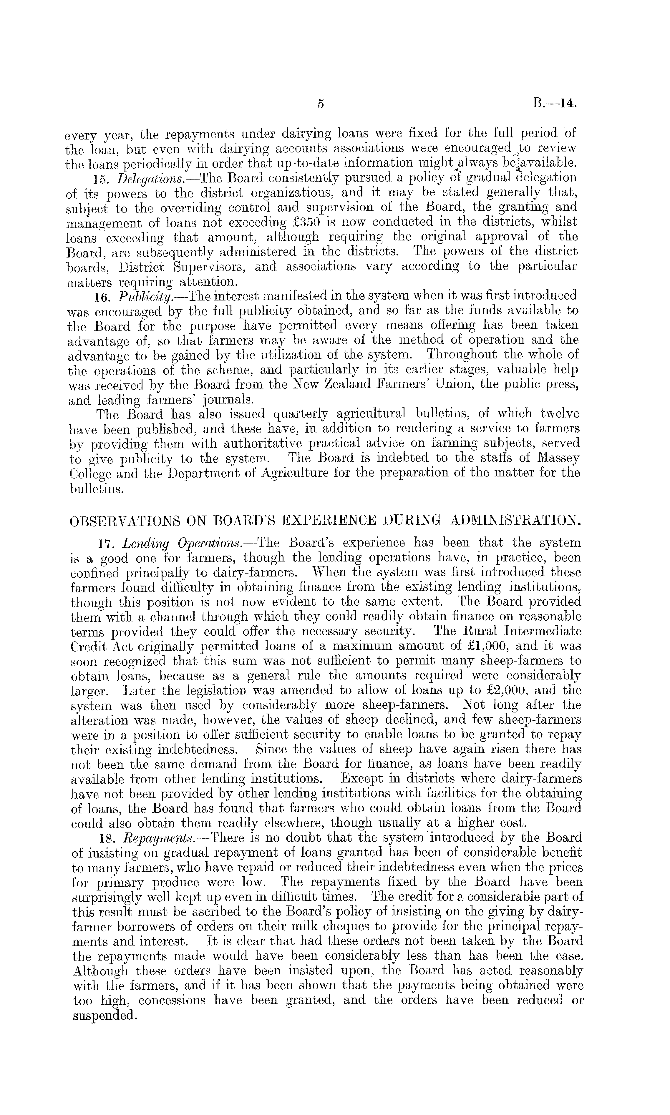 every year, the repayments under dairying loans were fixed for the full period of the loan, but even with dairying accounts associations were encouraged J;o review the loans periodically in order that up-to-date information mightalways be,-available. 15. Delegations. —The Board consistently pursued a policy of gradual delegation of its powers to the district organizations, and it may be stated generally that, subject to the overriding control and supervision of the Board, the granting and management of loans not exceeding £350 is now conducted in the districts, whilst loans exceeding that amount, although requiring the original approval of the Board, are subsequently administered in the districts. The powers of the district boards, District Supervisors, and associations vary according to the particular matters requiring attention. 16. Publicity. —The interest manifested in the system when it was first introduced was encouraged by the full publicity obtained, and so far as the funds available to the Board for the purpose have permitted every means offering has been taken advantage of, so that farmers may be aware of the method of operation and the advantage to be gained by the utilization of the system. Throughout the whole of the operations of the scheme, and particularly in its earlier stages, valuable help was received by the Board from the New Zealand Farmers' Union, the public press, and leading farmers' journals. The Board has also issued quaxterly agricultural bulletins, of which twelve have been published, and these have, in addition to rendering a service to farmers by providing them with authoritative practical advice on farming subjects, served to give publicity to the system. The Board is indebted to the staffs of Massey College and the Department of Agriculture for the preparation of the matter for the bulletins. OBSERVATIONS ON BOARD'S EXPERIENCE DURING ADMINISTRATION. 17. Lending Operations. —The Board's experience has been that the system is a good one for farmers, though the lending operations have, in practice, been confined principally to dairy-farmers. When the system was first introduced these farmers found difficulty in obtaining finance from the existing lending institutions, though this position is not now evident to the same extent. The Board provided them with a channel through which they could readily obtain finance on reasonable terms provided they could offer the necessary security. The Rural Intermediate Credit Act originally permitted loans of a maximum amount of £1,000, and it was soon recognized that this sum was not sufficient to permit many sheep-farmers to obtain loans, because as a general rule the amounts required were considerably larger. Later the legislation was amended to allow of loans up to £2,000, and the system was then used by considerably more sheep-farmers. Not long after the alteration was made, however, the values of sheep declined, and few sheep-farmers were in a position to offer sufficient security to enable loans to be granted to repay their existing indebtedness. Since the values of sheep have again risen there has not been the same demand from the Board for finance, as loans have been readily available from other lending institutions. Except in districts where dairy-farmers have not been provided by other lending institutions with facilities for the obtaining of loans, the Board has found that farmers who could obtain loans from the Board could also obtain them readily elsewhere, though usually at a higher cost. 18. Repayments. —There is no doubt that the system introduced by the Board of insisting on gradual repayment of loans granted has been of considerable benefit to many farmers, who have repaid or reduced their indebtedness even when the prices for primary produce were low. The repayments fixed by the Board have been surprisingly well kept up even in difficult times. The credit for a considerable part of this result must be ascribed to the Board's policy of insisting on the giving by dairyfarmer borrowers of orders on their milk cheques to provide for the principal repayments and interest. It is clear that had these orders not been taken by the Board the repayments made would have been considerably less than has been the case. Although these orders have been insisted upon, the Board has acted reasonably with the farmers, and if it has been shown that the payments being obtained were too high, concessions have been granted, and the orders have been reduced or suspended.