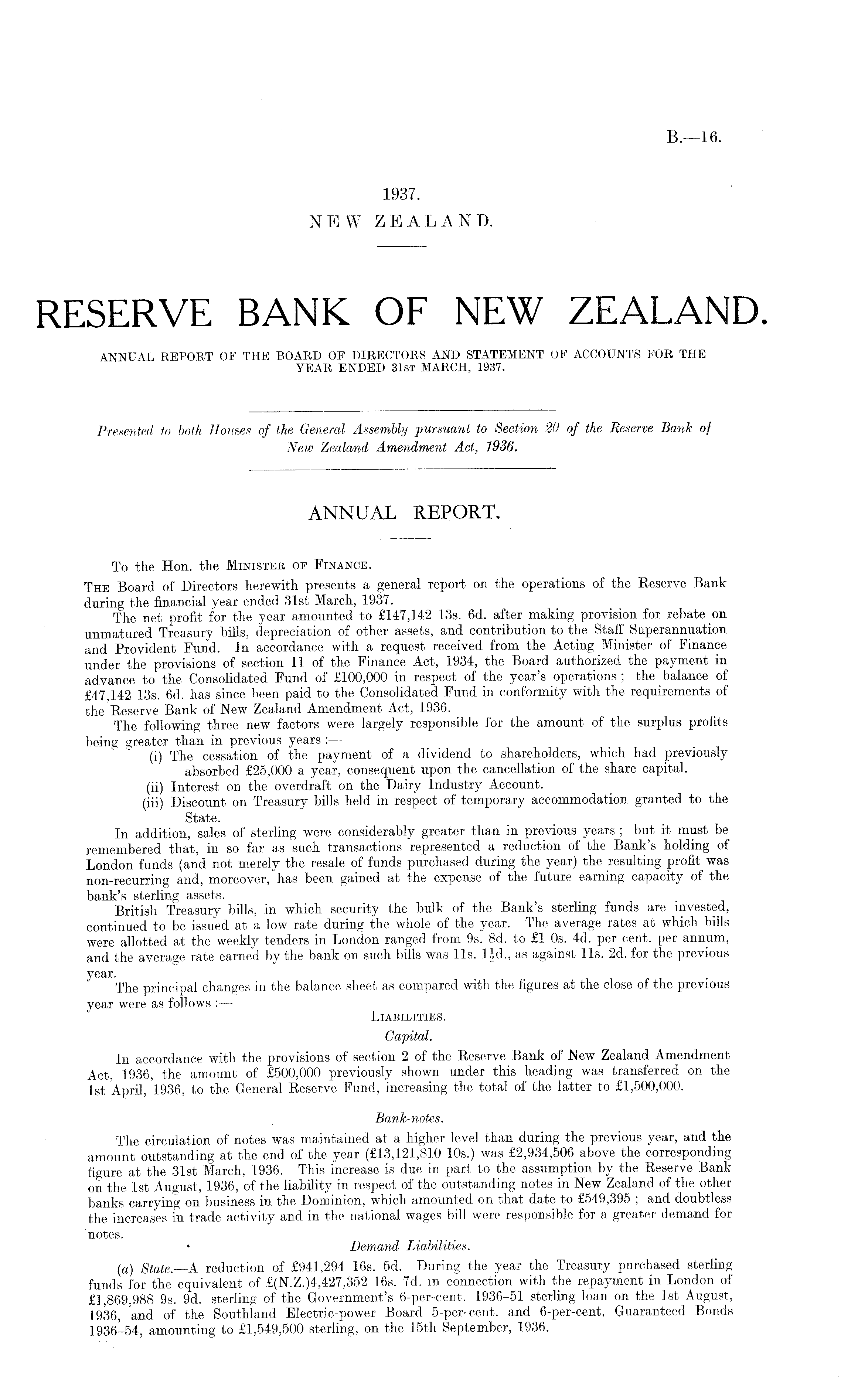 To the Hon. the Minister of Finance. The Board of Directors herewith presents a general report on the operations of the Reserve Bank during the financial year ended 31st March, 1937. The net profit for the year amounted to £147,142 13s. 6d. after making provision for rebate on unmatured Treasury bills, depreciation of other assets, and contribution to the Staff Superannuation and Provident Fund. In accordance with a request received from the Acting Minister of Finance under the provisions of section 11 of the Finance Act, 1934, the Board authorized the payment in advance to the Consolidated Fund of £100,000 in respect of the year's operations ; the balance of £47,142 13s. 6d. has since been paid to the Consolidated Fund in conformity with the requirements of the Reserve Bank of New Zealand Amendment Act, 1936. The following three new factors were largely responsible for the amount of the surplus profits being greater than in previous years : — (i) The cessation of the payment of a dividend to shareholders, which had previously absorbed £25,000 a year, consequent upon the cancellation of the share capital. (ii) Interest on the overdraft on the Dairy Industry Account. (iii) Discount on Treasury bills held in respect of temporary accommodation granted to the State. In addition, sales of sterling were considerably greater than in previous years ; but it must be remembered that, in so far as such transactions represented a reduction of the Bank's holding of London funds (and not merely the resale of funds purchased during the year) the resulting profit was non-recurring and, moreover,' has been gained at the expense of the future earning capacity of the bank's sterling assets. British Treasury bills, in which security the bulk of the Bank's sterling funds are invested, continued to be issued at a low rate during the whole of the year. The average rates at which bills were allotted at the weekly tenders in London ranged from 9s. Bd. to £1 os. 4d. per cent, per annum, and the average rate earned by the bank on such bills was lis. lid., as against lis. 2d. for the previous year. The principal changes in the balance sheet as compared with the figures at the close of the previous year were as follows : — Liabilities. Capital. In accordance with the provisions of section 2 of the Reserve Bank of New Zealand Amendment Act, 1936, the amount of £500,000 previously shown under this heading was transferred on the Ist April, 1936, to the General Reserve Fund, increasing the total of the latter to £1,500,000. Bank-notes. The circulation of notes was maintained at a higher level than during the previous year, and the amount outstanding at the end of the year (£13,121,810 10s.) was £2,934,506 above the corresponding figure at the 31st March, 1936. This increase is due in part to the assumption by the Reserve Bank on the Ist August, 1936, of the liability in respect of the outstanding notes in New Zealand of the other banks carrying on business in the Dominion, which amounted on that date to £549,395 ; and doubtless the increases in trade activity and in the national wages bill were responsible for a greater demand for notes. • Demand Liabilities. (a) State.—A reduction of £941,294 16s. sd. During the year the Treasury purchased sterling funds for the equivalent of £(N.Z.)4,427,352 16s. 7d. in connection with the repayment in London of £1,869,988 9s. 9d. sterling of the Government's 6-per-cent. 1936-51 sterling loan on the Ist August, 1936, 'and of the Southland Electric-power Board 5-per-cent. and 6-per-cent. Guaranteed Bonds; 1936-54, amounting to £1,549,500 sterling, on the 15th September, 1936.