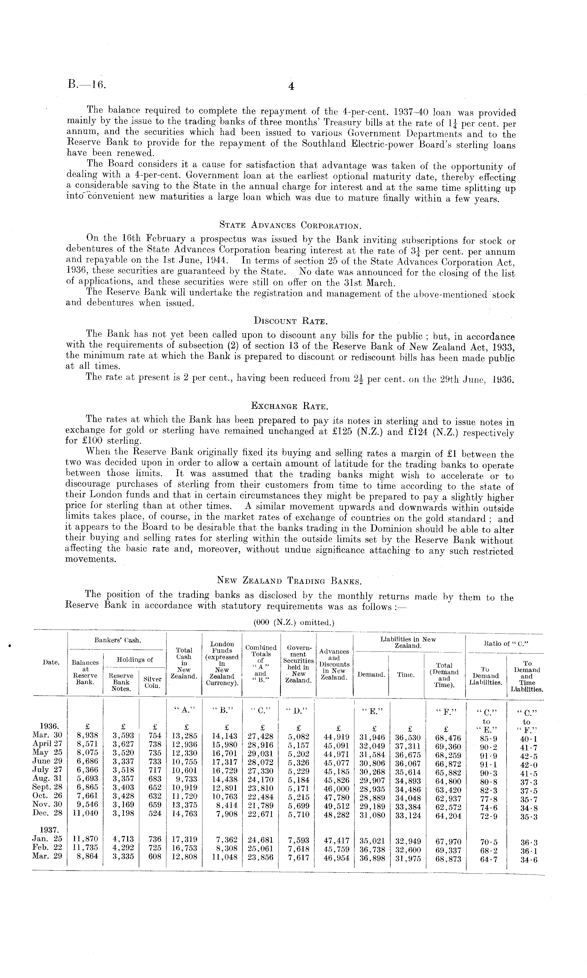 The balance required to complete the repayment of the 4-per-cent. 1937-40 loan was provided mainly by the issue to the trading banks of three months' Treasury bills at the rate of 1J per cent, per annum, and the securities which had been issued to various Government Departments and to the Reserve Bank to provide for the repayment of the Southland Electric-power Board's sterling loans have been renewed. The Board considers it a cause for satisfaction that advantage was taken of the opportunity of dealing with a 4-per-cent. Government loan at the earliest optional maturity date, thereby effecting a considerable saving to the State in the annual charge for interest and at the same time splitting up into convenient new maturities a large loan which was due to mature finally within a few years. State Advances Corporation. On the 16th February a prospectus was issued by the Bank inviting subscriptions for stock or debentures of the State Advances Corporation bearing interest at the rate of 3£ per cent, per annum and repayable on the Ist June, 1944. In terms of section 25 of the State Advances Corporation Act, 1936, these securities are guaranteed by the State. No date was announced for the closing of the list of applications, and these securities were still on offer on the 31st March. The Reserve Bank will undertake the registration and management of the above-mentioned stock and debentures when issued. Discount Rate. The Bank has not yet been called upon to discount any bills for the public ; but, in accordance with the requirements of subsection (2) of section 13 of the Reserve Bank of New Zealand Act, 1933, the minimum rate at which the Bank is prepared to discount or rediscount bills has been made public at all times. The rate at present is 2 per cent., having been reduced from 2| per cent, on the 29th June, 1936. Exchange Rate. The rates at which the Bank has been prepared to pay its notes in sterling and to issue notes in exchange for gold or sterling have remained unchanged at £125 (N.Z.) and £124 (N.Z.) respectively for £100 sterling. When the Reserve Bank originally fixed its buying and selling rates a margin of £1 between the two was decided upon in order to allow a certain amount of latitude for the trading banks to operate between those limits. It was assumed that the trading banks might wish to accelerate or to discourage purchases of sterling from their customers from time to time according to the state of their London funds and that in certain circumstances they might be prepared to pay a slightly higher price for sterling than at other times. A similar movement upwards and downwards within outside limits takes place, of course, in the market rates of exchange of countries on the gold standard ; and it appears to the Board to be desirable that the banks trading in the Dominion should be able to alter their buying and selling rates for sterling within the outside limits set by the Reserve Bank without affecting the basic rate and, moreover, without undue significance attaching to any such restricted movements. New Zealand Trading Banks. The position of the trading banks as disclosed by the monthly returns made by them to the Reserve Bank in accordance with statutory requirements was as follows :—