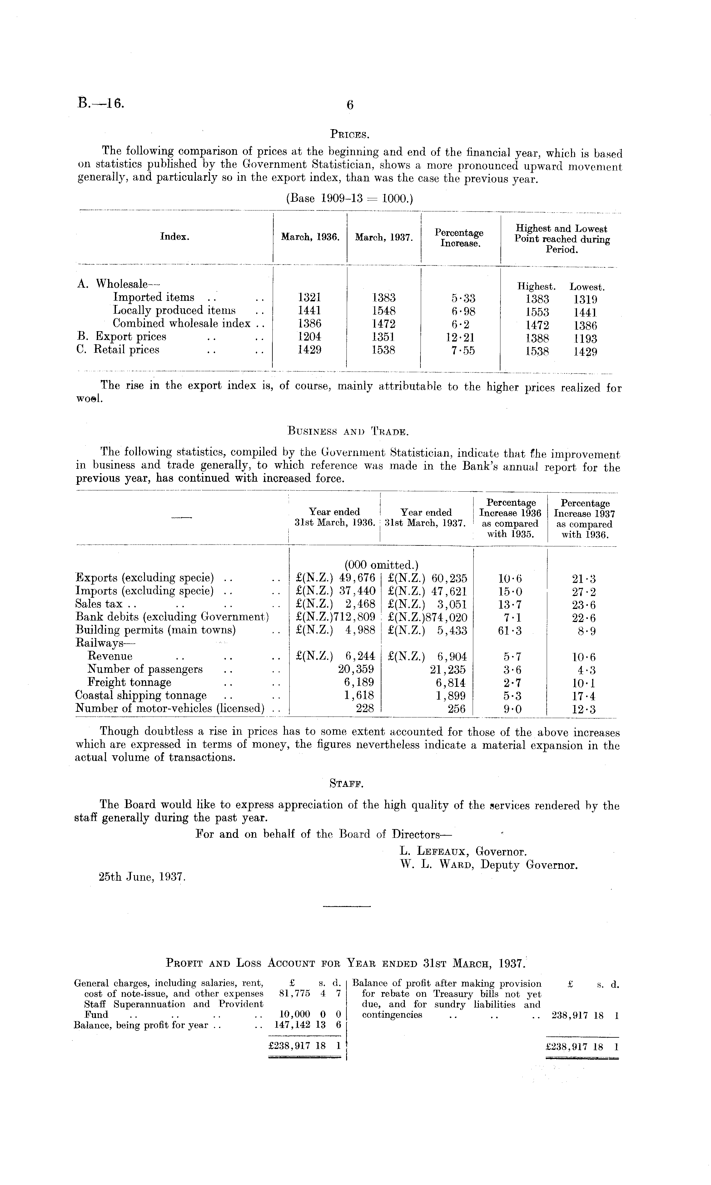Though doubtless a rise in prices has to some extent accounted for those of the above increases which are expressed in terms of money, the figures nevertheless indicate a material expansion in the actual volume of transactions. Staff. The Board would like to express appreciation of the high quality of the services rendered by the staff generally during the past year. For and on behalf of the Board of Directors— L. Lefeaux, Governor. W. L. Ward, Deputy Governor. 25th June, 1937.