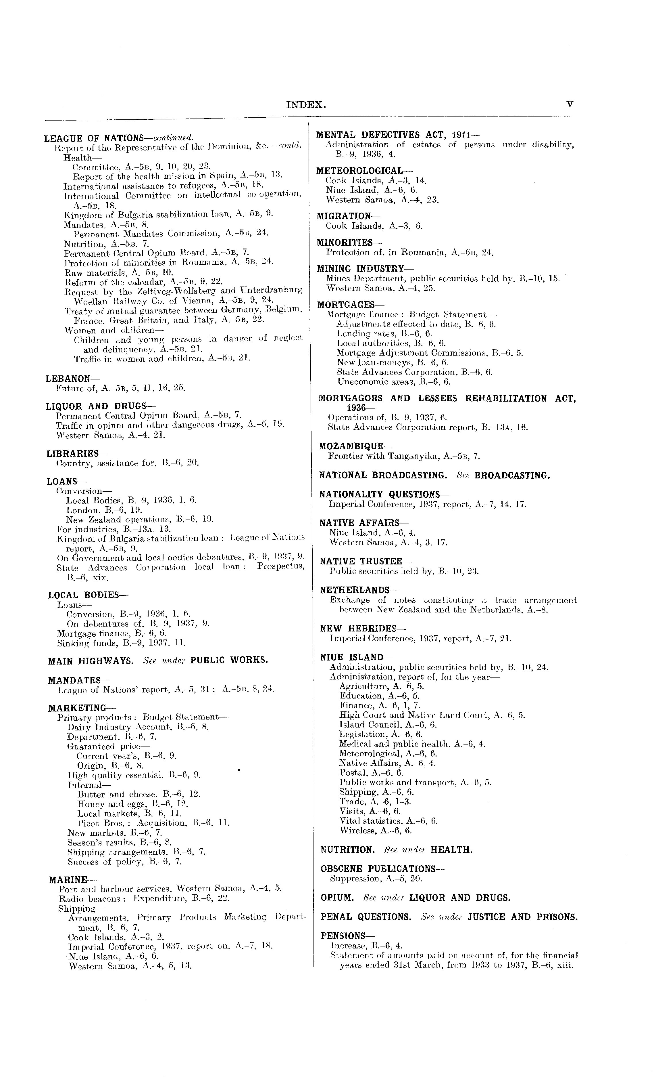 MENTAL DEFECTIVES ACT, 1911— Administration of estates of persons under disability, B -~ 9 > 1936 > 4 - MirTiTTitnnT nPTfAT M u n™ T s lnnd A -fi fi Western Samoa A-4 23 MIGRATION — Cook Islands, A.-3, 6. MINORITIES — Protection of, in Roumania, A.-sb, 24. rwmreTrov MINING INDUSTRY Department, public securities held by, 8.-10, 15. Western Samoa, A.-4, 25. MORTGAGES Mortgage . Budget Statement— Adjustments effected to date, 8.-6, 6. Tannin o- T\ (\ Local 8.-6, 6. Mortgage Adjustment Commissions, 8.-6, 5. New loan-moneys, 8.-6, 6. State Advances Corporation, 8.-6, 6. Uneconomic areas, 8.-6, 6. MORTGAGORS AND LESSEES REHABILITATION ACT, 1936 Operations of, 8.-9, 1937, 6. State Advances Corporation report, 8.-13 a, 16. MOZAMBIQUEFrontier with Tanganyika, A.-sb, 7. NATIONAL BROADCASTING. See BROADCASTING. NATIONALITY QUESTIONS— Imperial Conference, 1937, report, A.-7, 14, 17. r ' r ' ' ' NATIVE AFFAIRS Niue Island A.-6 4. Western Samoa A.-4 3 17. NATIVE TRUSTEE " Public securities held by, 8.-10. 23. J NETHERLANDS Exchange of notes constituting a trade arrangement between New Zealand and the Netherlands, A.-8. NEW HEBRIDES— Imperial Conference, 1937, report, A.-7, 21. NIUE ISLAND— Administration, public securities held by, 8.-10, 24. Administration, report of, for the year — Agriculture, A.-6, 5. Education, A.-6, 5. Finance, A.-6, 1, 7. High Court and Native Land Court, A.-6, 5. Island Council, A.-6, 6. Legislation, A.-6, 6. Medical and public health, A.-6, 4. Meteorological, A.—6, 6. Native Affairs, A.-6, 4. Postal, A.-6, 6. Public works and transport, A.-6, 5. Shipping, A.-6, 6. Trade, A.-6, 1-3. Visits, A.-6, 6. Vital statistics, A.-6, 6. Wireless, A.-6, 6. NUTRITION. See under HEALTH. OBSCENE PUBLICATIONSSuppression, A.-5, 20. OPIUM. See under LIQUOR AND DRUGS. PENAL QUESTIONS. See under JUSTICE AND PRISONS, PENSIONS— Increase, 8.-6, 4. Statement of amounts paid on account of, for the financial years ended 31st March, from 1933 to 1937, 8.-6, xiii.
