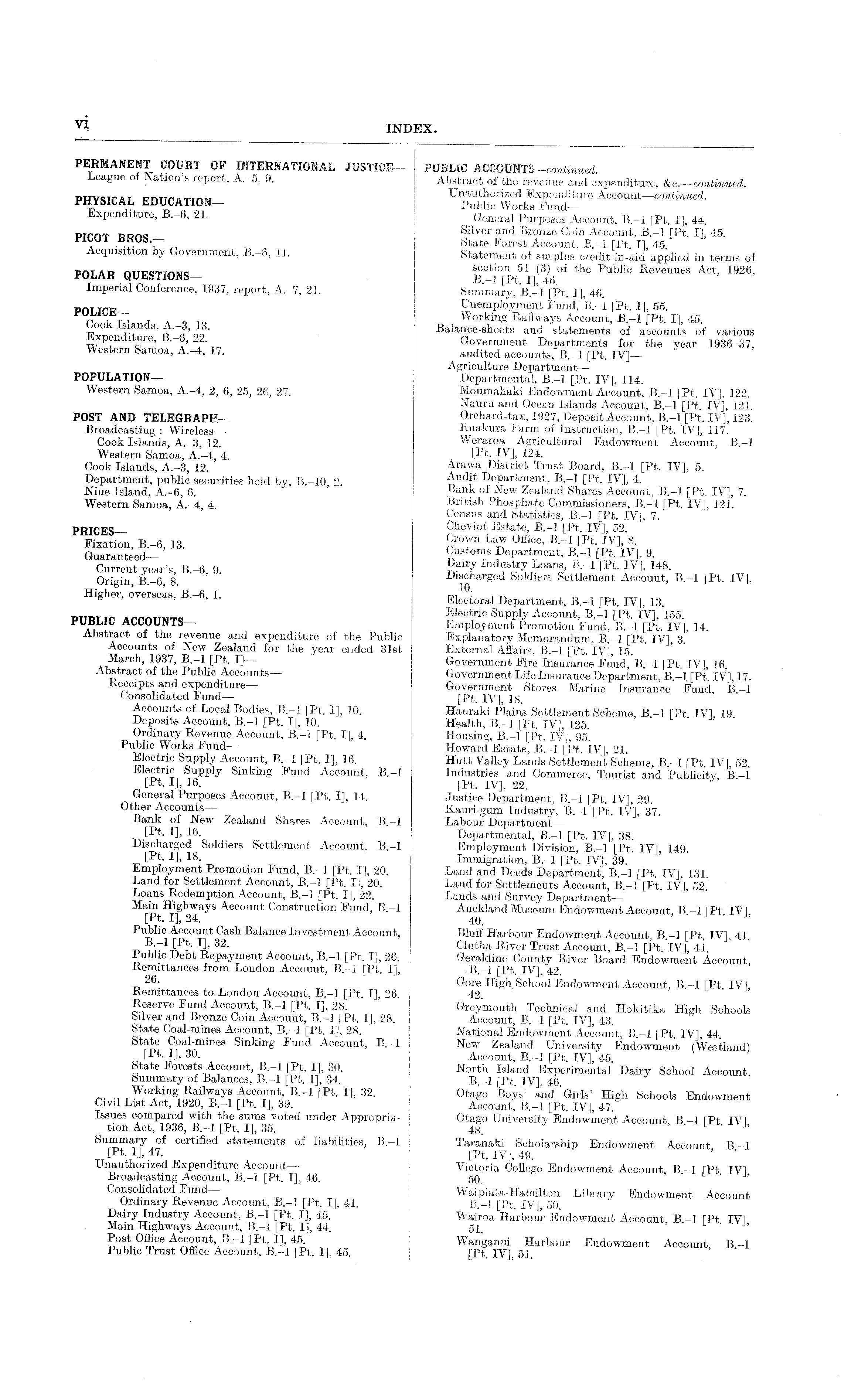 PERMANENT COURT OF INTERNATIONAL JUSTICE— League of Nation's report, A.-5, 9. PHYSICAL EDUCATION— Expenditure, 8.-6, 21. PICOT BROS.— Acquisition by Government, 8.-6, 11. POLAR QUESTIONS — Imperial Conference, 1937, report, A.-7, 21. I POLICE— Cook Islands, A.-3, 13. Expenditure, 8.-6, 22. Western Samoa, A.-4, 17. POPULATION— Western Samoa, A.-4, 2, 6, 25, 26, 27. POST AND TELEGRAPH Broadcasting : Wireless— Cook Islands, A.-3, 12. Western Samoa, A.-4, 4. Cook Islands, A.-3, 12. Department, public securities held by, 8.-10, 2. Niue Island, A.-6, 6. Western Samoa, A.-4, 4. PRICES— Fixation, 8.-6, 13. Guaranteed— Current year's, 8.-6, 9. Origin, 8.-6, 8. Higher, overseas, 8.-6, 1. PUBLIC ACCOUNTS— Abstract of the revenue and expenditure of the Public Accounts of New Zealand for the year ended 31st March, 1937, 8.-l [Pt. I]— Abstract of the Public Accounts— Receipts and expenditure— Consolidated Fund— Accounts of Local Bodies, 8.-l [Pt. I], 10. Deposits Account, 8.-l [Pt. I], 10. Ordinary Revenue Account, 8.-l [Pt. I], 4. Public Works Fund— Electric Supply Account, 8.-l [Pt. I], 16. Electric Supply Sinking Fund Account, B-1 [Pt. I], 16. General Purposes Account, 8.-l [Pt. I], 14. Other Accounts— Bank of New Zealand Shares Account, B-1 [Pt. I], 16. Discharged Soldiers Settlement Account, B-1 [Pt. I], 18. Employment Promotion Fund. 8.-l [Pt. I], 20. Land for Settlement Account, 8.-l [Pt. I], 20. Loans Redemption Account, 8.-l [Pt. I], 22. Main Highways Account Construction Fund, 8.-l [Pt. I], 24. Public Account Cash Balance Investment Account 8.-l [Pt. I], 32. Public Debt Repayment Account, 8.-l [Pt. I], 26. Remittances from London Account. B-1 [Pt II 26. Remittances to London Account, 8.-l [Pt. I], 26. Reserve Fund Account, 8.-l [Pt. I], 28. Silver and Bronze Coin Account, 8.-l [Pt. I], 28. State Coal-mines Account, 8.-l [Pt. I], 28. State Coal-mines Sinking Fund Account, B-1 [Pt. I], 30. State Forests Account, 8.-l [Pt. I], 30. Summary of Balances, 8.-l [Pt. I], 34. Working Railways Account. 8.-l [Pt I], 32 Civil List Act, 1920, 8.-l [Pt. I], 39. Issues compared with the sums voted under Appropriation Act, 1936, 8.-l [Pt. I], 35. Summary of certified statements of liabilities, 8.-l [Pt, I], 47. Unauthorized Expenditure Account— Broadcasting Account, 8.-l [Pt. I], 46. Consolidated Fund— Ordinary Revenue Account, 8.-l [Pt. I], 41. Dairy Industry Account, 8.-l [Pt. I], 45. Main Highways Account, 8.-l [Pt. I], 44. Post Office Account, 8.-l [Pt. I], 45. Public Trust Office Account, 8.-l [Pt. I], 45.
