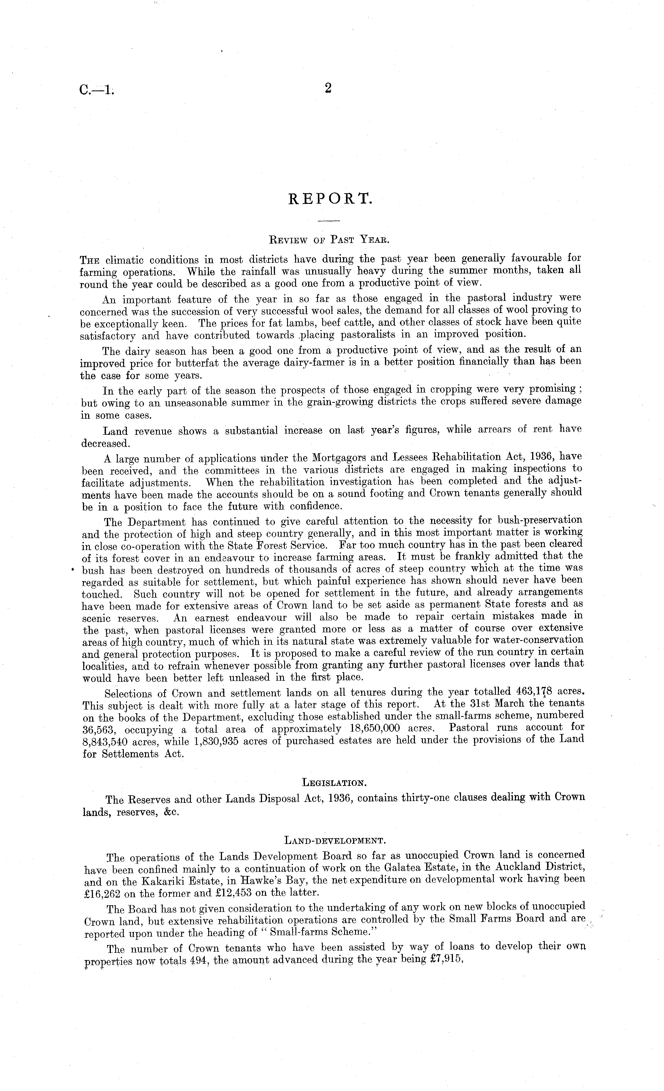 Review of Past Yeak. The climatic conditions in most districts have during the past year been generally favourable for farming operations. While the rainfall was unusually heavy during the summer months, taken all round the year could be described as a good one from a productive point of view. An important feature of the year in so far as those engaged in the pastoral were concerned was the succession of very successful wool sales, the demand for all classes of wool proving to be exceptionally keen. The prices for fat lambs, beef cattle, and other classes of stock have been quite satisfactory and have contributed towards .placing pastoralist-s in an improved position. The dairy season has been a good one from a productive point of view, and as the result of an improved price for butterfat the average dairy-farmer is in a better position financially than has been the case for some years. In the early part of the season the prospects of those engaged in cropping were very promising ; but owing to an unseasonable summer in the grain-growing districts the crops suffered severe damage in some cases. Land revenue shows a substantial increase on last year's figures, while arrears of rent have decreased. A large number of applications under the Mortgagors and Lessees Rehabilitation Act, 1936, have been received, and the committees in the various districts are engaged in making inspections to facilitate adjustments. When the rehabilitation investigation has been completed and the adjustments have been made the accounts should be on a sound footing and Crown tenants generally should be in a position to face the future with confidence. The Department has continued to give careful attention to the necessity for bush-preservation and the protection of high and steep country generally, and in this most important matter is working in close co-operation with the State Forest Service. Far too much country has in the past been cleared of its forest cover in an endeavour to increase farming areas. It must be frankly admitted that the bush has been destroyed on hundreds of thousands of acres of steep country which at the time was regarded as suitable for settlement, but which painful experience has shown should never have been touched. Such country will not be opened for settlement in the future, and already arrangements have been made for extensive areas of Grown land to be set aside as permanent State forests and as scenic reserves. An earnest endeavour will also be made to repair certain mistakes made in the past, when pastoral licenses were granted more or less as a matter of course over extensive areas of high country, much of which in its natural state was extremely valuable for water-conservation and general protection purposes. It is proposed to make a careful review of the run country in certain localities, and to refrain whenever possible from granting any further pastoral licenses over lands that would have been better left unleased in the first place. Selections of Crown and settlement lands on all tenures during the year totalled 463,178 acres. This subject is dealt with more fully at a later stage of this report. At the 31st March the tenants on the books of the Department, excluding those established under the small-farms scheme, numbered 36,563, occupying a total area of approximately 18,650,000 acres. Pastoral runs account for 8,843,540 acres, while 1,830,935 acres of purchased estates are held under the provisions of the Land for Settlements Act. Legislation. The Reserves and other Lands Disposal Act, 1936, contains thirty-one clauses dealing with Crown lands, reserves, &c. Land-development. The operations of the Lands Development Board so far as unoccupied Crown land is concerned have been confined mainly to a continuation of work on the Galatea Estate, in the Auckland District, and on the Kakariki Estate, in Hawke's Bay, the net expenditure on developmental work having been £16,262 on the former and £12,453 on the latter. The Board has not given consideration to the undertaking of any work on new blocks of unoccupied Crown land, but extensive rehabilitation operations are controlled by the Small Farms Board and are reported upon under the heading of " Small-farms Scheme.'' The number of Crown tenants who have been assisted by way of loans to develop their own properties now totals 494, the amount advanced during the year being £7,915,