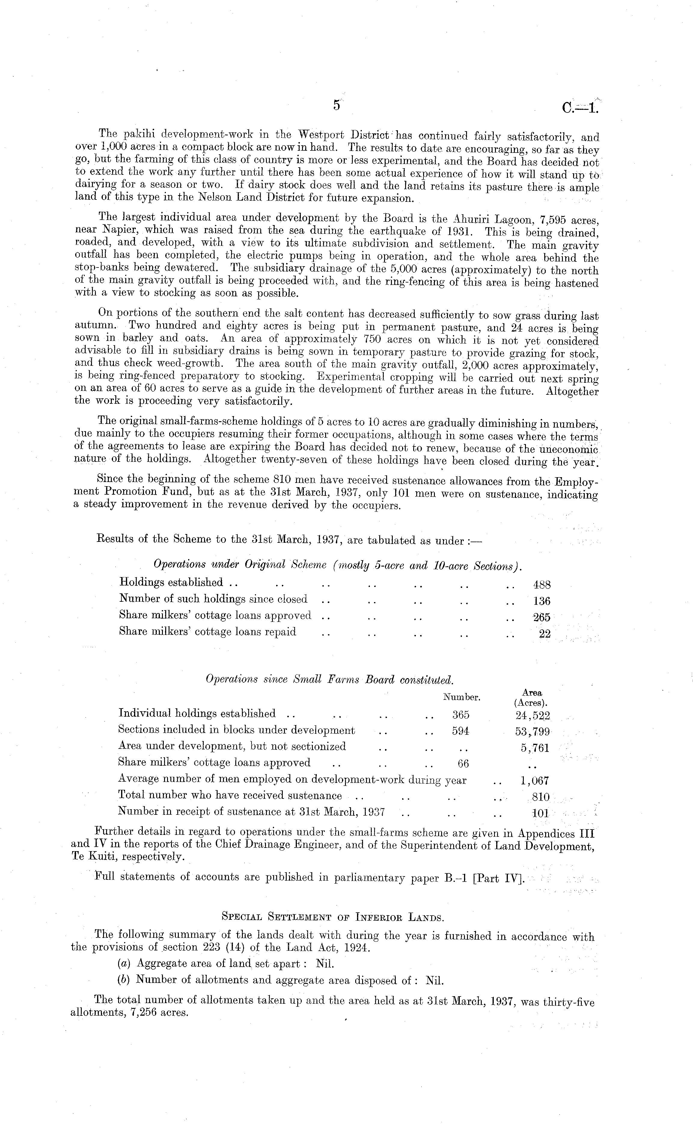 The pakihi development-work in the Westport District has continued fairly satisfactorily, and over 1,000 acres in a compact block are now in hand. The results to date are encouraging, so far as they go, but the farming of this class of country is more or less experimental, and the Board has decided not to extend the work any further until there has been some actual experience of how it will stand up to dairying for a season or two. If dairy stock does well and the land retains its pasture there is ample land of this type in the Nelson Land District for future expansion. The largest individual area under development by the Board is the Ahuriri Lagoon, 7,595 acres, near Napier, which was raised from the sea during the earthquake of 1931. This is being drained! roaded, and developed, with a view to its ultimate subdivision and settlement. The main gravity outfall has been completed, the electric pumps being in operation, and the whole area behind the stop-banks being dewatered. The subsidiary drainage of the 5,000 acres (approximately) to the north of the main gravity outfall is being proceeded with, and the ring-fencing of this area is being hastened with a view to stocking as soon as possible. On portions of the southern end the salt content has decreased sufficiently to sow grass during last autumn. Two hundred and eighty acres is being put in permanent pasture, and 24 acres is being sown in barley and oats. An area of approximately 750 acres on which it is not yet considered advisable to fill in subsidiary drains is being sown in temporary pasture to provide grazing for stock, arid thus check weed-growth. The area south of the main gravity outfall. 2,000 acres approximately, is being ring-fenced preparatory to stocking. Experimental cropping will be carried out next spring on an area of 60 acres to serve as a guide in the development of further areas in the future. Altogether the work is proceeding very satisfactorily. The original small-farms-scheme holdings of 5 acres to 10 acres are gradually diminishing in numbers, due mainly to the occupiers resuming their former occupations, although in some cases where the terms of the agreements to lease are expiring the Board has decided not to renew, because of the uneconomic nature of the holdings. Altogether twenty-seven of these holdings have been closed during the year. Since the beginning of the scheme 810 men have received sustenance allowances from the Employment Promotion Fund, but as at the 31st March, 1937, only 101 men were on sustenance, indicating a steady improvement in the revenue derived by the occupiers. Results of the Scheme to the 31st March, 1937, are tabulated as under :— Operations under Original Scheme (mostly 5-acre and 10-acre Sections). Holdings established .. .. .. .. .. .. ~ Number of such holdings since closed .. .. .. .. .. 135 Share milkers' cottage loans approved .. .. .. .. .. 265 Share milkers' cottage loans repaid .. . . .. .. .. 22 Operations since Small Farms Board constituted. Number. , A Area , (Acres). Individual holdings established .. .. .. .. 365 24,522 Sections included in blocks under development .. .. 594 53,799 Area under development, but not sectionized .. .. .. 5 761 Share milkers' cottage loans approved .. . . .. 66 Average number of men employed on development-work during year .. 1,067 Total number who have received sustenance .. .. .. ~ 810 Number in receipt of sustenance at 31st March, 1937 .. .. .. 101 Further details in regard to operations under the small-farms scheme are given in Appendices 111 and IV in the reports of the Chief Drainage Engineer, and of the Superintendent of Land Development, Te Kuiti, respectively. Full statements of accounts are published in parliamentary paper 8.-l [Part IV]. Special Settlement of Inferior Lands. The following summary of the lands dealt with during the year is furnished in accordance with the provisions of section 223 (14) of the Land Act, 1924. (а) Aggregate area of land set apart : Nil. (б) Number of allotments and aggregate area disposed of : Nil. The total number of allotments taken up and the area held as at 31st March, 1937, was thirty-five allotments, 7,256 acres.