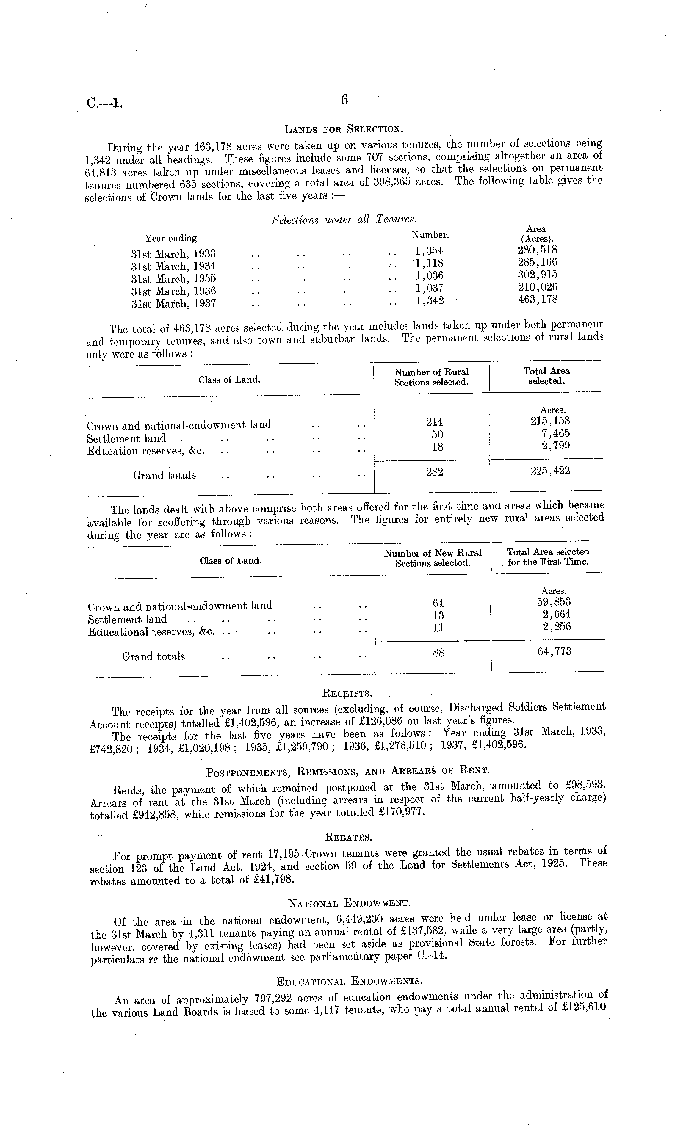Receipts. The receipts for the year from all sources (excluding, of course, Discharged Soldiers Settlement Account receipts) totalled £1,402,596, an increase of £126,086 on last year's figures. The receipts for the last five years have been as follows: Year ending 31st March, 1933, £742,820 ; 1934, £1,020,198 ; 1935, £1,259,790 ; 1936, £1,276,510 ; 1937, £1,402,596. Postponements, Remissions, and Abreabs of Rent. Rents, the payment of which remained postponed at the 31st March, amounted to £98,593. Arrears of'rent at the 31st March (including arrears in respect of the current half-yearly charge) totalled £94-2,858, while remissions for the year totalled £170,977. Rebates. For prompt payment of rent 17,195 Crown tenants were granted the usual rebates in terms of section 123 of the Land Act, 1924, and section 59 of the Land for Settlements Act, 1925. These rebates amounted to a total of £41,798. National Endowment. Of the area in the national endowment, 6,449,230 acres were held under lease or license at the 31st March by 4,311 tenants paying an annual rental of £137,582, while a very large area (partly, however, covered by existing leases) had been set aside as provisional State forests, tor further particulars re the national endowment see parliamentary paper C.—l 4. Educational Endowments. An area of approximately 797,292 acres of education endowments under the administration of the various Land Boards is leased to some 4,147 tenants, who pay a total animal rental of £125,610