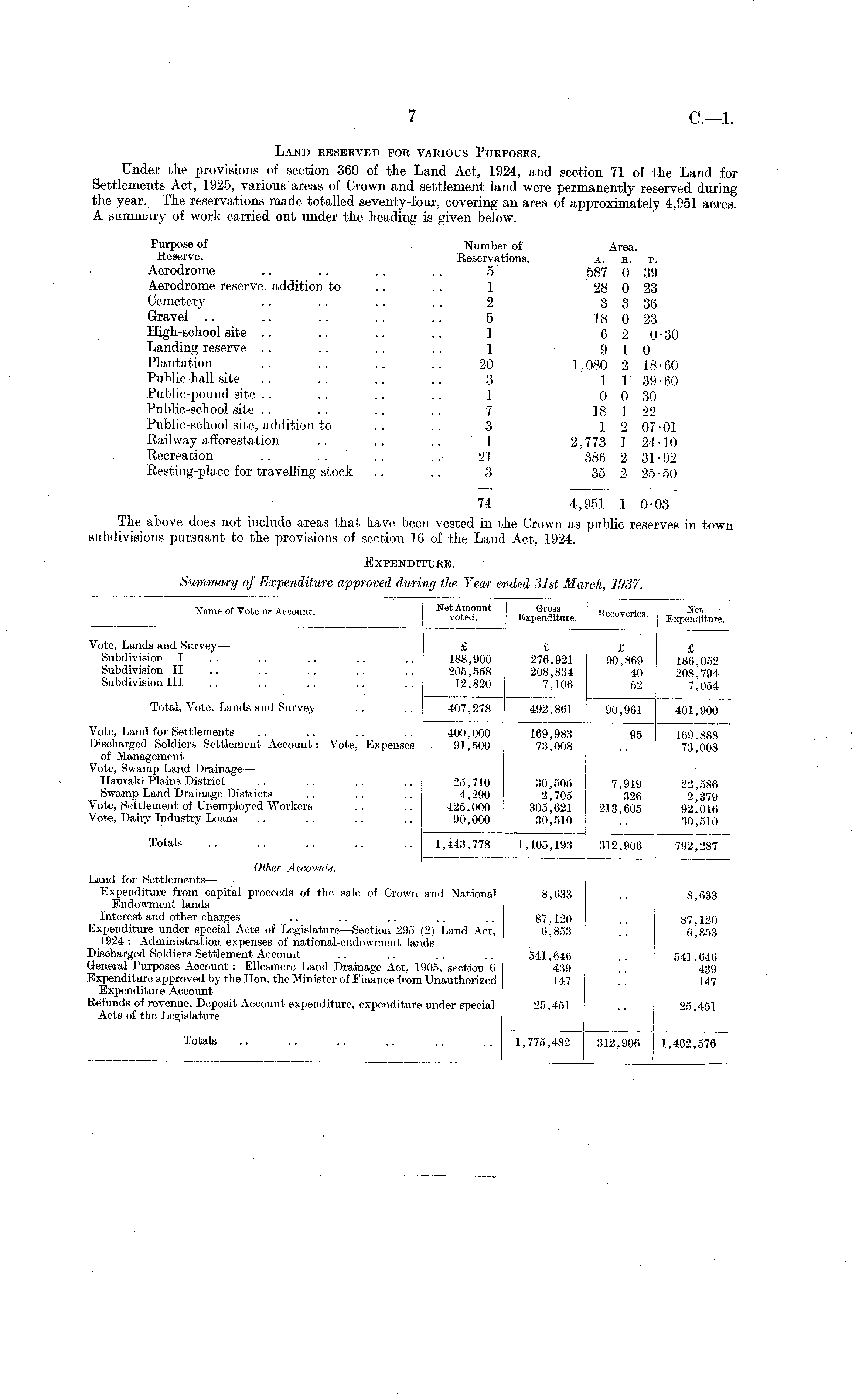 Name of Vote or Account. Net Amount ! Gross Recoveries I * et voted. | Expenditure. recoveries. Expenditure. Vote, Lands and Survey— £ £ £ £ Subdivision I .. .. .. .. .. 188,900 276,921 90,869 186,052 Subdivision II .. .. .. .. .. 205,558 208,834 40 208,794 Subdivision III .. .. .. .. .. 12,820 7,106 52 7,054 Total, Vote. Lands and Survey .. .. 407,278 492,861 90,961 401,900 Vote, Land for Settlements .. .. .. .. 400,000 169,983 95 169,888 Discharged Soldiers Settlement Account: Vote, Expenses 91,500 73,008 .. 73^008 of Management Vote, Swamp Land Drainage — Hauraki Plains District .. .. .. .. 25,710 30,505 7,919 22,586 Swamp Land Drainage Districts .. .. .. 4,290 2,705 326 2 379 Vote, Settlement of Unemployed Workers .. .. 425,000 305,621 213,605 92^016 Vote, Dairy Industry Loans ' .. . . . . . . 90,000 30,510 !. 30^510 Totals •• •• •• 1,443,778 1,105,193 312,906 792,287 Other Accounts. Land for Settlements— Expenditure from capital proceeds of the sale of Crown and National 8,633 8,633 Endowment lands Interest and other charges .. .. .. .. .. 87,120 .. 87,120 Expenditure under special Acts of Legislature—Section 295 (2) Land Act, 6,853 . . 6^853 1924 : Administration expenses of national-endowment lands Discharged Soldiers Settlement Account . . .. .. .. 541 s 646 . . 54] 646 General Purposes Account : Ellesmere Land Drainage Act, 1905, section 6 439 . . '439 Expenditure approved by the Hon. the Minister of Finance from Unauthorized 147 .. 147 Expenditure Account Refunds of revenue,'Deposit Account expenditure, expenditure under special 25,451 .. 25,451 Acts of the Legislature Totals .. .. .. .. .. .. 1,775,482 312,906 1,462,576