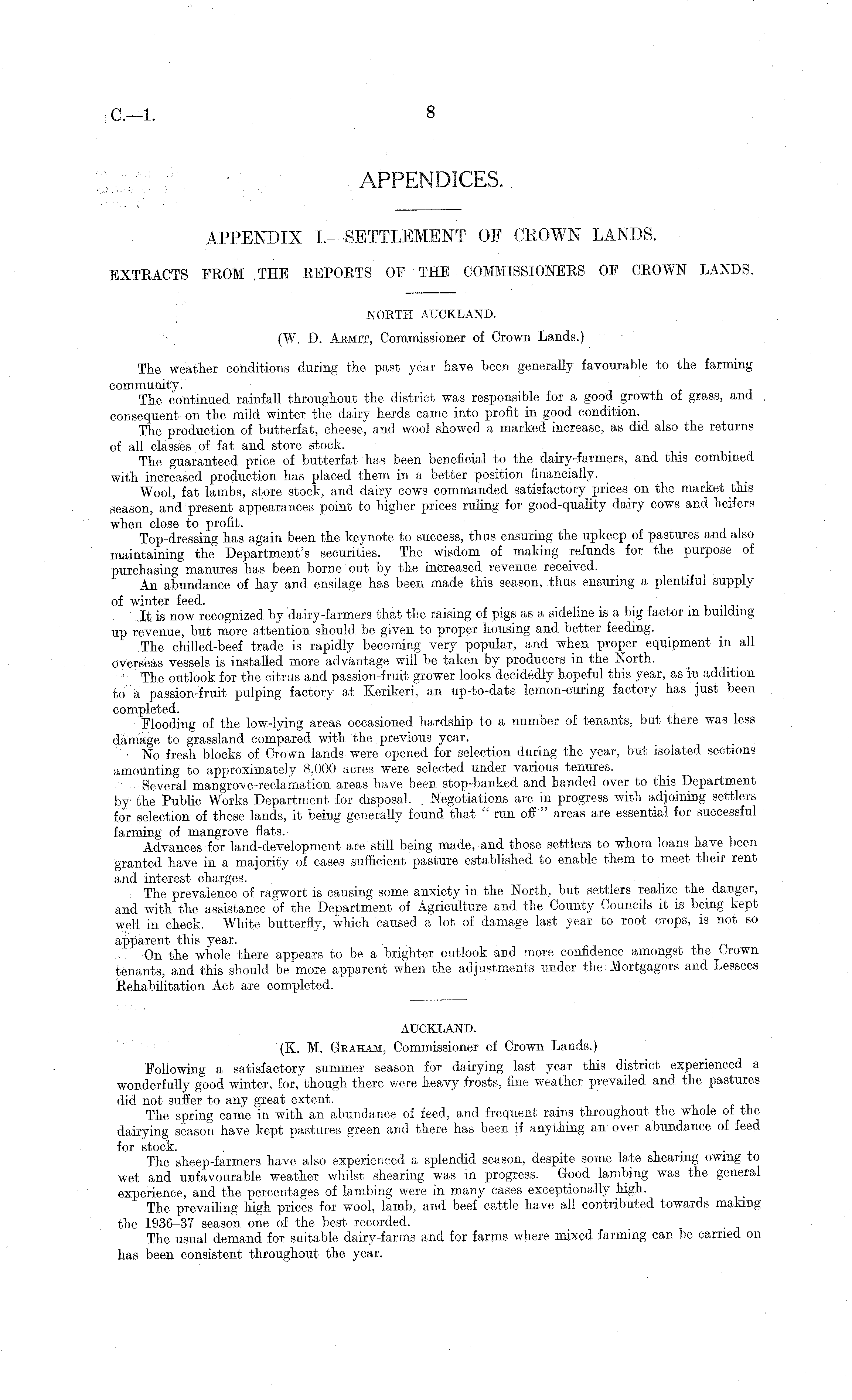 APPENDIX I.—SETTLEMENT OF CROWN LANDS. EXTRACTS FROM THE REPORTS OF THE COMMISSIONERS OF CROWN LANDS.
