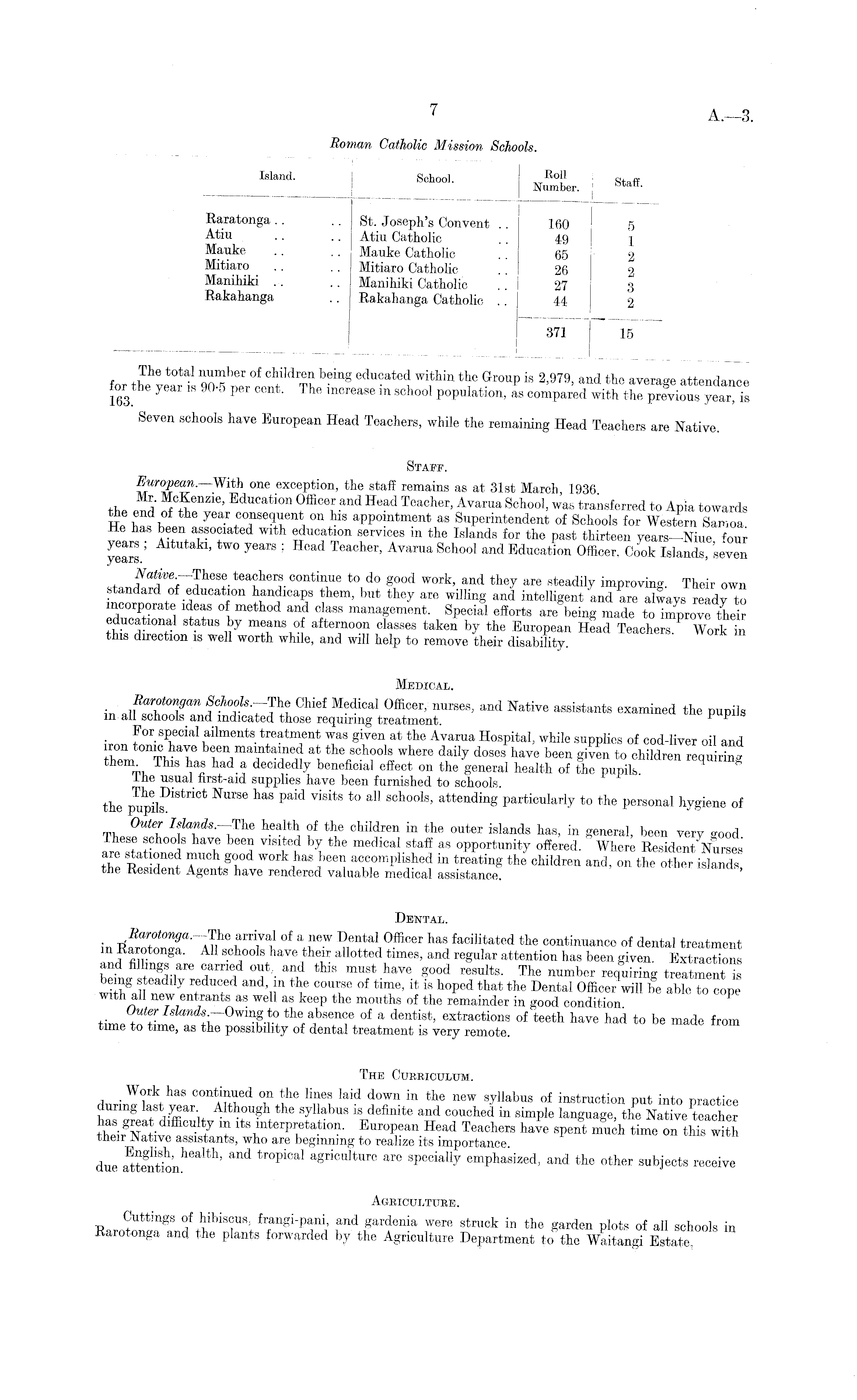 for total r ber ° f 0l ! being educated tie Group is 2,979, and the average attendance 163 1S Per ' increase in school population, as compared with the previous year, is Seven schools have European Head Teachers, while the remaining Head Teachers are Native. Staff. European. With one exception, the staff remains as at 31st March, 1936. +1. !i' C^ enzle ' Educatlon Officer and Head Teacher, Avarua School, was transferred to Apia towards the end o f the year consequent on his appointment as Superintendent of Schools for Western Samoa He has been associated with education services m the Islands for the past thirteen years—Nine four years , Aitutaki, two years : Head Teacher, Avarua School and Education Officer. Cook Islands, seven years. 3 , f at j Ve '7~\T heS ®. teachers continue to do good work, and they are steadily improving. Their own standard of education handicaps them, but they are willing and intelligent and are always readv to incorporate ideas of method and class management, Special efforts are being made to improve their educational status by means of afternoon classes taken by the European Head Teachers. Work in this direction is well worth while, and will help to remove their disability. Medical. in »vZhn!T n A C^ S '7Ī h X ° hief Medical officer > nurses > and Nativ e assistants examined the pupils in all schools and indicated those requiring treatment. For special ailments treatment was given at the Avarua Hospital, while supplies of cod-liver oil and iron tonic have been maintained at the schools where daily doses have been given to children reauirinff them This has had a decidedly beneficial effect on the general health of the pupils q g Ihe usual first-aid supplies have been furnished to schools. the pupllf IStnCt NUrSe haS Pald ViSitS t0 aH schools ' attendin S particularly to the personal hygiene of Outer Islands.—'The health of the children in the outer islands has, in general, been very These schools have been visited by the medical staff as opportunity offered. Where Resident Nurses are stationed much good work has been accomplished in treating the children and, on the other islands the Resident Agents have rendered valuable medical assistance. Dental. Rarot.onga.~~The arrival of a new Dental Officer has facilitated the continuance of dental treatment n Rarotonga. All. schools have their allotted times, and regular attention has been given. Extractions and fillings are carried out, and this must have good results. The number requiring treatment is being steadily reduced and in the course of time, it is hoped that the Dental Officer will be able to cope with all new entrants as well as keep the mouths of the remainder in good condition time to t[if?/th7^ Win vf 0 / h f? S ?i ( ; 0f ? dentist ' extractions of teeth have had to be made from time to time, as the possibility of dental treatment is very remote. The Curriculum. Work has continued on the lines laid down in the new syllabus of instruction put into practice during last year. Although the syllabus is definite and couched in simple language, the Native teacher the S ir S / lts mter Pftation. European Head Teachers have spent much time on this with their Native assistants, who are beginning to realize its importance. due a E tte g nttn health ' tr ° Pi ° al agriculture are s P e cially emphasized, and the other subjects receive Agriculture. Cuttings of hibiscus, frangi-pani, and gardenia were struck in the garden plots of all schools in Rarotonga and the plants forwarded by the Agriculture Department to the Waitangi Estate,
