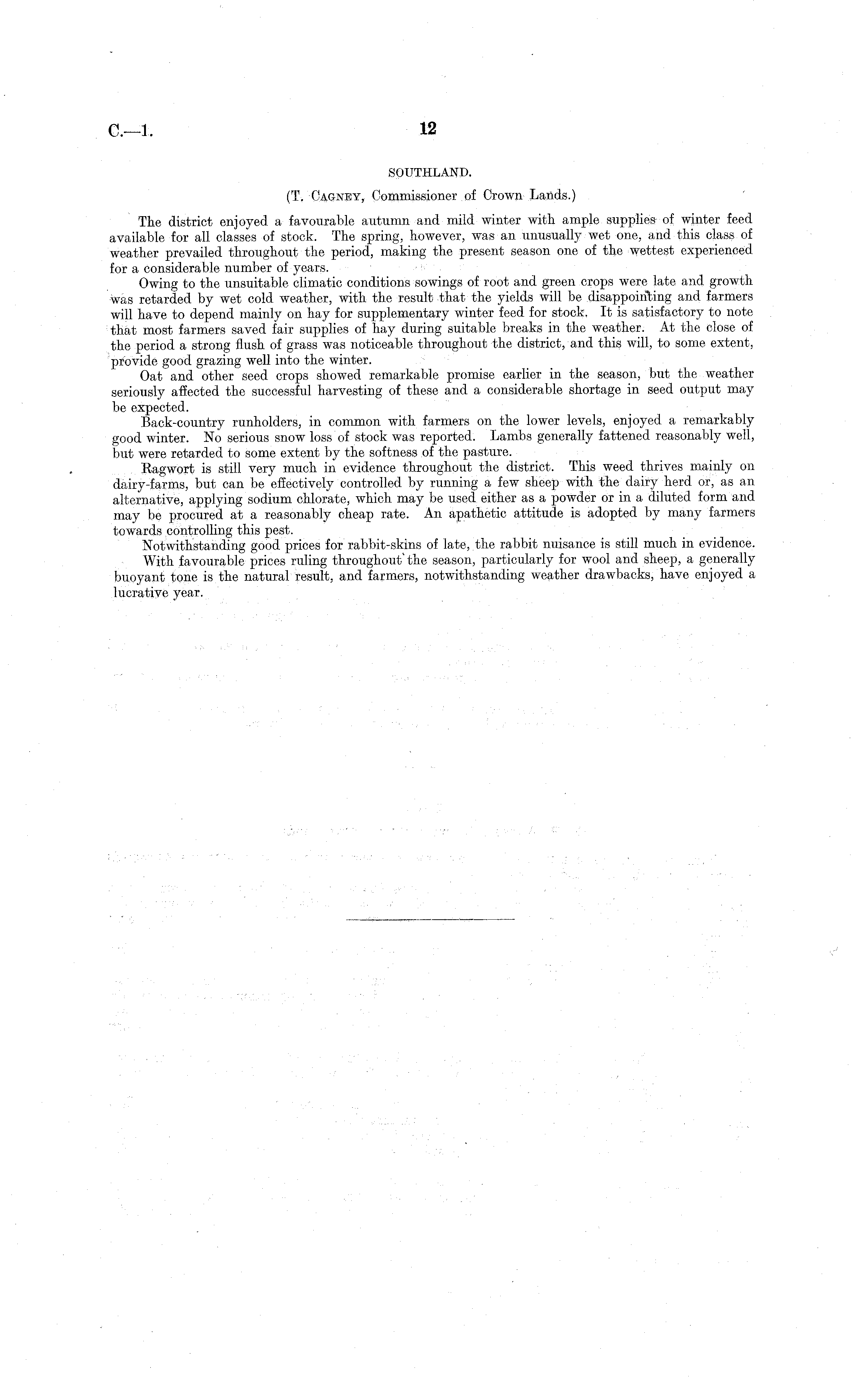 SOUTHLAND. (T. Cagney, Commissioner of Crown Lands.) The district enjoyed a favourable autumn and mild winter with ample supplies of winter feed available for all classes of stock. The spring, however, was an unusually wet one, and this class of weather prevailed throughout the period, making the present season one of the wettest experienced for a considerable number of years. Owing to the unsuitable climatic conditions sowings of root and green crops were late and growth was retarded by wet cold weather, with the result that the yields will be disappointing and farmers will have to depend mainly on hay for supplementary winter feed for stock. It is satisfactory to note that most farmers saved fair supplies of hay during suitable breaks in the weather. At the close of the period a strong flush of grass was noticeable throughout the district, and this will, to some extent, provide good grazing well into the winter. Oat and other seed crops showed remarkable promise earlier in the season, but the weather seriously affected the successful harvesting of these and a considerable shortage in seed output may be expected. Back-country runholders, in common with farmers on the lower levels, enjoyed a remarkably good winter. No serious snow loss of stock was reported. Lambs generally fattened reasonably well, but were retarded to some extent by the softness of the pasture. Ragwort is still very much in evidence throughout the district. This weed thrives mainly on dairy-farms, but can be effectively controlled by running a few sheep with the dairy herd or, as an alternative, applying sodium chlorate, which may be used either as a powder or in a diluted form and may be procured at a reasonably cheap rate. An apathetic attitude is adopted by many farmers towards controlling this pest. Notwithstanding good prices for rabbit-skins of late, the rabbit nuisance is still much in evidence. With favourable prices ruling throughout' the season, particularly for wool and sheep, a generally buoyant tone is the natural result, and farmers, notwithstanding weather drawbacks, have enjoyed a lucrative year.