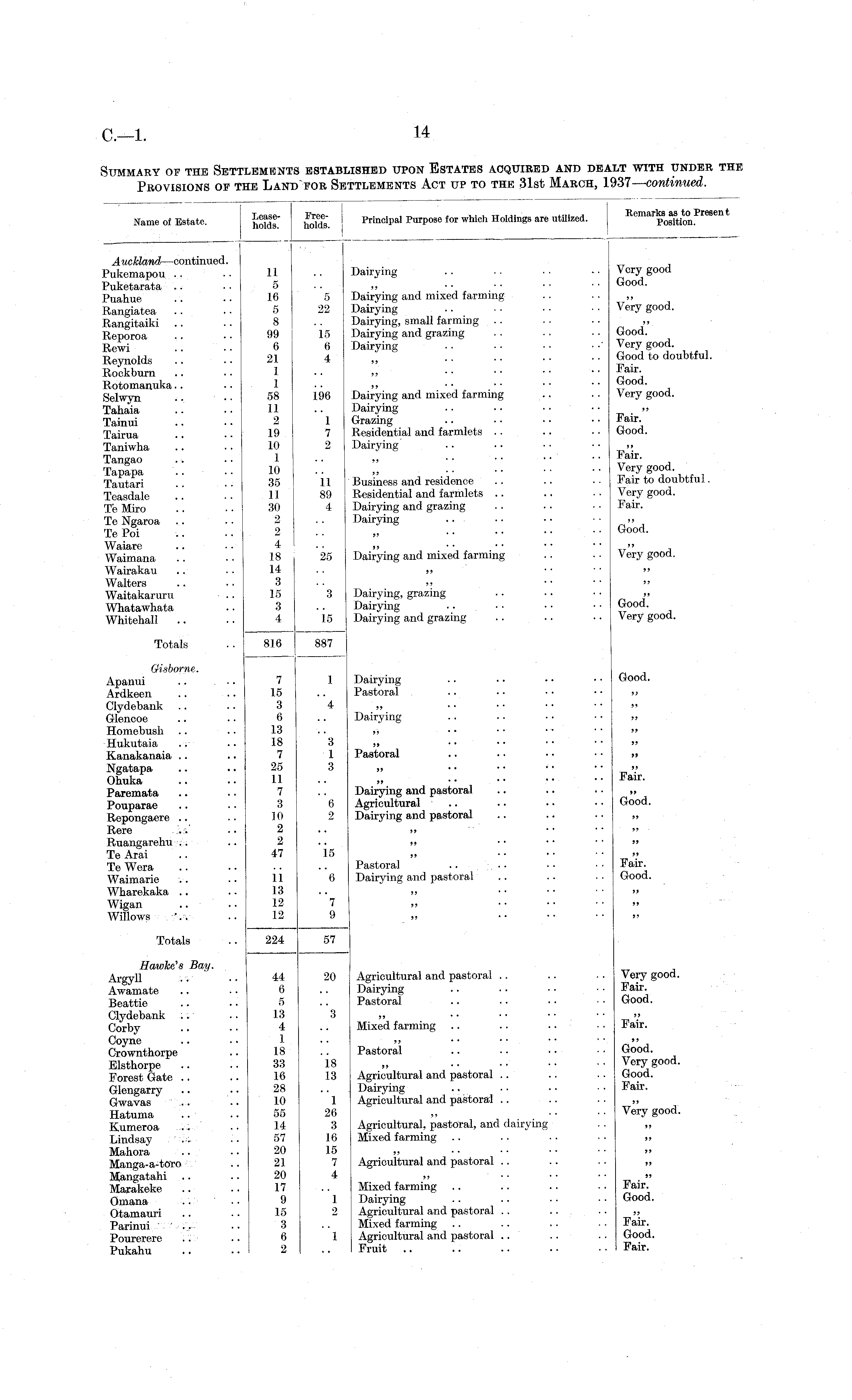 Toaap. TTrpp- . , i-ittu. .... , I Remarks as to Present Name of Estate. jjjjg® Principal Purpose for which Holdings are utilized. j Position. Auckland —continued. Pukemapou .. .. 11 Dairying .. . . .. -• Very good Puketarata .. • • 5 . . „ ■ • ■ ■ • ■ ■ ■ Good. Puahue .. .. 16 5 Dairying and mixed farming . . . . ,, Rangiatea .. . • 5 22 Dairying .. ■ • • ■ • • Very good. Rangitaiki .. . . 8 .. Dairying, small farming .. . . .. „ Reporoa .. • • 99 15 Dairying and grazing . . . . • • Good. Rewi .. .. 6 6 Dairying .. •• ■■ • X er yg°°f' , , Reynolds .. .. 21 4 „ Good to doubtful. Roekburn .. .. 1 • • >> • • ■ • ■ • • ' ī, alr j IRiotoniā/iinkH/ • • 1 •• • • • • • • (jood. Selwyn .. • ■ 58 196 Dairying and mixed farming .. . . Very good. Tahaia .. •• 11 ■■ Dairying .. •• •• • • . » Tainui .. .. 2 1 Grazing .. • • • ■ • • * air Tairua .. • • 19 7 Residential and farmlets .. .. • • Good. Taniwha .. 10 2 Dairying .. •• •• •• ,, Tangao .. .. 1 • • „ * alr ' , Tapapa .. .. 10 .. „ Very goo.d. Tautari .. •• 35 11 Business and residence .. .. ■■ Fair to doubtful. Teasdale .. .. 11 89 Residential and farmlets .. .. Very good. Te Miro .. • • 30 4 Dairying and grazing . . . . • ■ Fair. TeNgaroa .. .. 2 .. Dairying .. •• ■■ ■ • „ Te Poi .. .. 2 .. „ Good. Waiare .. .. 4 .. ,, ■ • • • ■ • • • >> Waimana .. 18 25 Dairying and mixed farming Very good. Wairakau .. 14 ,, ■ ■ ■ ■ » Walters .. .. 3 ,, ■ ■ ■ ■ >> Waitakaruru .. 15 3 Dairying, grazing ■ • • • •• „ Whatawhata .. 3 .. Dairying .. ■ • • • • ■ Good. Whitehall .. .. 4 15 Dairying and grazing .. •• •• Very good. Totals . . 816 887 Gisborne. Apanui .. .. 7 1 Dairying .. • • • • • • Good. Ardkeen .. .. 15 .. Pastoral .. ■ • ■ • • • » Clydebank .. ■ ■ 3 4 ,, • • ■ • • • • • » Glencoe .. .. 6 .. Dairying Homebush .. . ■ 13 .. ,, • • • • • • • ■ » Hukutaia .. .. 18 3 ,, • • • • • • • • >> Kanakanaia .. .. 7 1 Pastoral .. • • • • • • >> Ngatapa .. • • 25 3 „ • • • • • • •• Ohuka .. .. 11 •• >> •' Fair. Paremata .. .. 7 .. Dairying and pastoral .. .. . • „ Pouparae .. . • 3 6 Agricultural .. . • • • • • Good. Repongaere .. .. 10 2 Dairying and pastoral .. .. •• „ Rere .. • • 2 .. „ • ■ >> Ruangarehu .. .. 2 .. ,, •• » Te Arai .. 47 15 ,, • • • • ' ' Te Wera .. .. •• Pastoral .. •• Fair. Waimarie .. .. 11 6 Dairying and pastoral .. .. . ■ Good. Wharekaka .. .. 13 .. ,, • ■ • • » Wigan .. • • 12 7 ,, ■ • • • • ■ » Willows '.. .. 12 9 ,, •• •• ■ • >. Totals .. 224 57 Hawke's Bay. Argyll .. . • 44 20 Agricultural and pastoral .. .. Very good. Awamate .. .. 6 .. Dairying .. . • • • ■ • Fair. Beattie .. .. 5 .. Pastoral .. • • • • • ■ Good. Clydebank .. .. 13 3 „ • • • • • • » Corby .. • • 4 .. Mixed farming .. • • ■ • ■ • Fair. Coyne .. 1 •• » ■■ ■■ •• >> Crownthorpe .. 18 . . Pastoral .. • • • • • • Uooa. Elsthorpe .. .. 33 18 „ Very good. Forest Gate .. .. 16 13 Agricultural and pastoral .. .. . . Good. Glengarrv . • • • 28 .. Dairying .. .. • ■ ■ • Fair. Gwavas .. .. 10 1 Agricultural and pastoral .. .. . . ,, Hatuma .... 55 26 „ .... Very good. Kumeroa . .. ' •• 14 3 Agricultural, pastoral, and dairying .. ,, Lindsay . • ■ • 57 16 Mixed farming .. . . ■ • ■ • >, Mahora .. .. 20 15 ,, • • • • • • • • >> Manga-a-toro .. 21 7 Agricultural and pastoral .. .. ■ • „ Mangatahi .. .. 20 4 ,, • • • • •' " Marakeke .. .. 17 .. Mixed farming .. .. .. .. Fair. Omana .. . • 9 1 Dairying .. .. • • ■ • Good. Otamauri .. .. 15 2 Agricultural and pastoral .. .. . . ,, Parinui ... .. 3 .. Mixed farming .. . . .. ■ • Fair. Pourerere .. .. 6 1 Agricultural and pastoral .. .. . • Good. Pukahu .. .. 2 .. Fruit Fair.