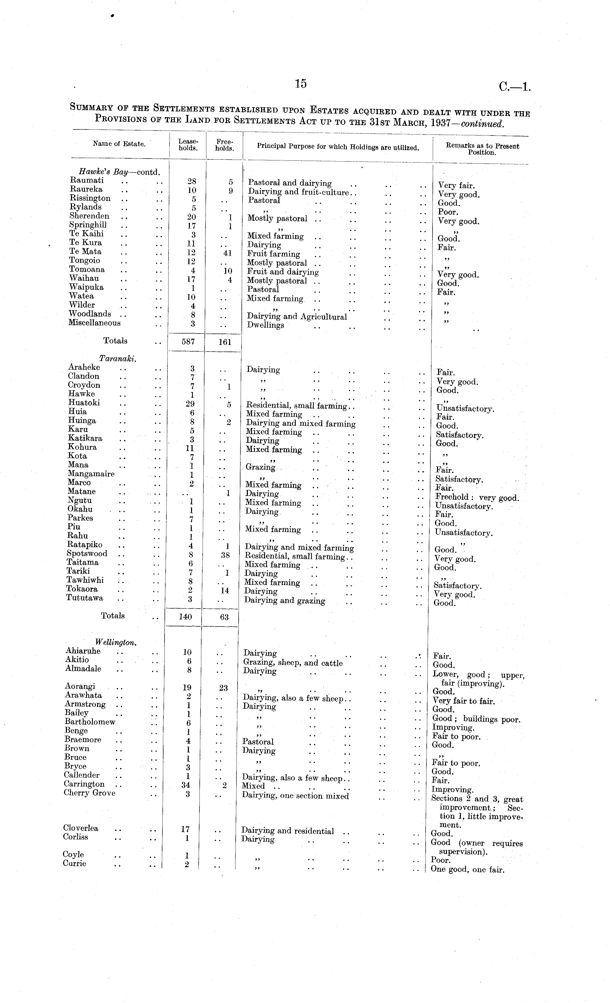 Name of Estate. ! folds' Principal Purpose Jor which Holdings are utilized. Remarks as to Present Position. Hawke's Bay—contd. Raumati .. .. 28 5 Pastoral and dairying .. .. .. Verv fair Raureka .. .. ]o 9 Dairying and fruit-culture.. .. Ver'v cood Rissmgton .. .. 5 .. Pastoral .. " Good Rylands .. . . 5 .. „ " '" p Springhil] 1 :: :: 1? I M0S * iy P ast0ral " " - •• vCygood. Te Kaihi .. .. 3 .. Mixed farming .. .. .. Good Te Kura .. .. 11 .. Dairying ., ,. ,. -p.,;., Te Mata .. ., 12 4] Fruit farming Tongoio .. .. 12 .. Mostly pastoral Tomoana . . .. 4 10 Fruit and dairying .. .. _ Verv pond Waihau .. .. 17 4 Mostly pastoral .. . . .. ,, Good Waipuka .. .. 1 .. Pastoral .. . . .. p a j r Watea .. .. 10 .. Mixed farming Wilder .. .. 4 '' " Woodlands .. .. 8 .. Dairying and Agricultural Miscellaneous .. 3 .. Dwellings .. .. " Totals .. S87 161 Taranaki. Araheke .. .. 3 . . Dairying .. . . .. .. Fai Clandon .. .. 7 t T ' Croydon .. .. 7 "1 " Very good. Hawke .. .. 1 .. ;; ;; •• •• • • Good - S" a a t0ki '• '• 2 l 3 Residential, small' farming.. " " Unsatisfactory. • • • • 6 .. Mixed farming .. .. . . . # J Humga .. .. 8 2 Dairying and mixed farming .. . . Good. Katikara " :: 3 :: S5 rming :: ;; ;; ;; Soof ctory ' Kohura .. .. 11 .. Mixed farming Kota .. .. 7 _ 6 " " •' Mana . . .. 1 .. Grazing .. .. " y'\ Mangamaire 1 ... ci a if?J arco • • • • 2 .. Mixed farming .. . . a ° ° ry ' Ktu e :: -i 1 •• •• ;; :: Okahu .. .. 1 :: Dairying :: ! Unsatisfactory. Parkes .... 7 " .... aLL - Pin 1 . " ' * • • • • • • (jrOOd. Italiii ;; \ ;; .. .. .. .. Unsatisfactory. Ratapiko .. .. 4 ] Dairying and mixed farming .. Good " TaitaZ " '• 2 38 Residential, small farming. .. " Very good. laxtama .. .. (> . Mixed farming G oo'd. -LciiiK.i .. .. 7 i Dairying :: :: I u Sn f r ing :: :: ii Tut.utawa .. .. 3 .. Dairying and grazing .. . . .. Good Totals .. 140 63 Wellington. Akitio Uhe " " " jR ail 7 in g . ■' Pair. tfm'lle " " « ' ' « razm g> shee P. and cattle .. . . Good. Almadale .. .. 8 .. Dairying Lowei . good . upper> Aorangi .. .. 19 23 „ fair (improving). Armstrong " " l " als ° a few sheep.. .! " Very fair to fair. Armstrong .. .. 1 .. Dairying Good Bartholomew'' !'! 6 " " " " " '" ? ood; buildi "gs poor. Benge .. .. i " " Improving. Braemore .. .. 4 Pastoral ' ' ' P 00rBrown .. .. \ D a " G ° od " Bruce .... 1 Bryce .. .. 3 ;; ;; ;; • ■ • • * alr to p° 0r - Callender .. .. 1 .. Dairying, also a few sheep.. . Fa,V ' Carrington .. .. 34 2 Mixed " . . Cherry Grove .. 3 .. Dairying, one section mixed .. . ! Stotions'l;' and 3, great improvement; Section 1, little improveCloverlea .. .. 17 .. Dairying and residential .. .. Good^ 88 '■ '• 1 '• Dairying Good " (owner requires Coyle .. .. 1 .. supervision). Currie .. .. 2 .. " " " " n ° or ' , " • • • • • • • • One good, one fair.