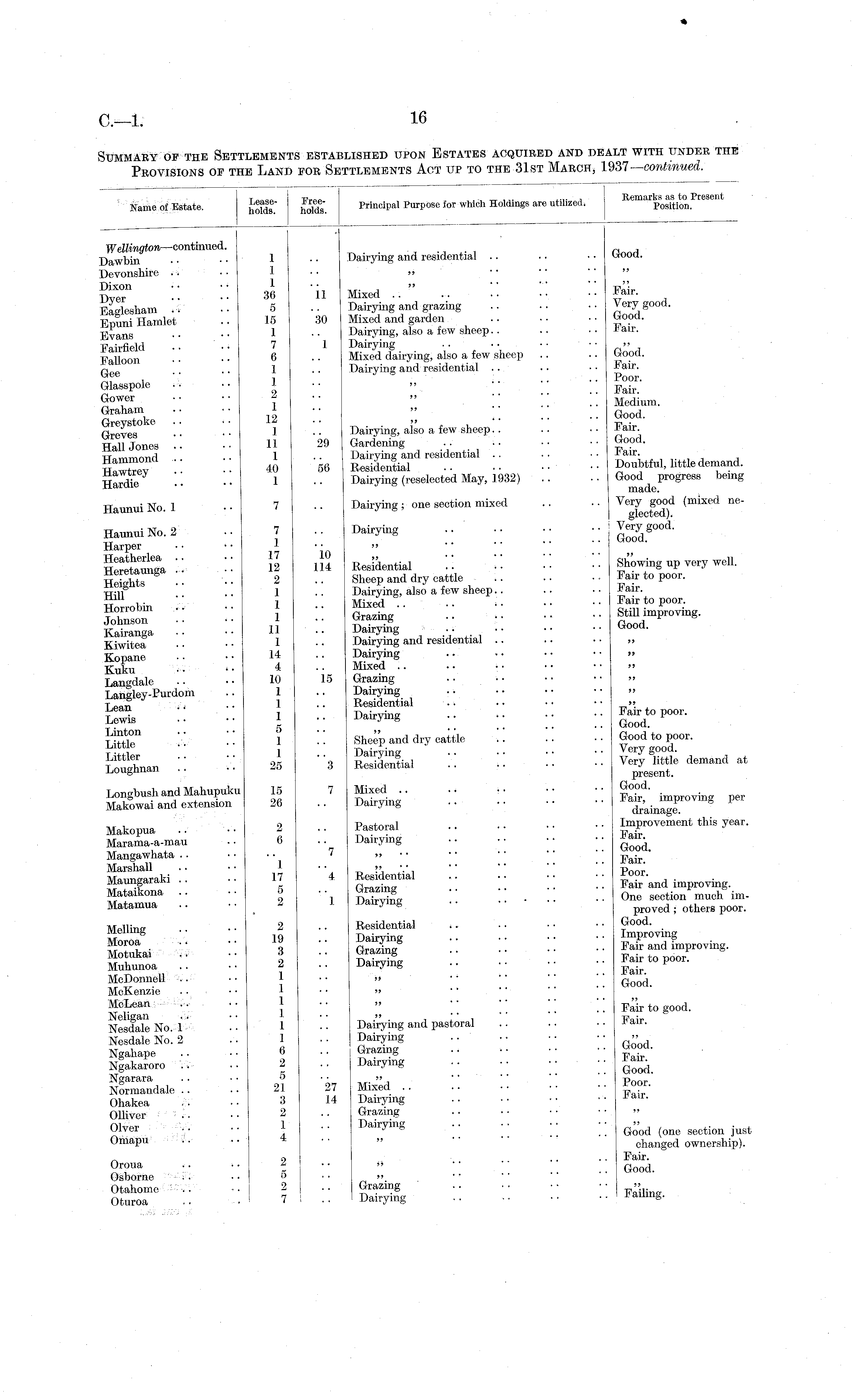 I Wr „. , . , „ ... .... i Remarks as to Present Name of Estate. kofds." ! holds'. Principal Purpose for which Holdings are utilized, : Position. ;■ '1 ! — Wettington —continued. ., . , n a Dawbin • • ■ • 1 • ■ Dairying and residential .. ■. ■ • uooa. Devonshire .. • • 1 .. ,, S iX ° n 36 II Mixed " .. •• F air - Eaglesham • 5 .. Dairying and grazing Good g °° d ' Epuni Hamlet .. 15 30 Mixed and garden .. • • • ■ Good. Evans • • • • 1 • ■ Dairying, also a few sheep.. .. • • P alr - Fairfield •• •• 7 1 Dairying .. •• •• •• >> xfollonn . . • • 6 • • Mixed dairying, also a few sheep .. .. Good. .. 1 .. Dairying and residential .. • ■ • • P alr - jjf , I ' ...... Poor. Glasspole .. •• 1 » Pair. Gower ■ • • • V " . • • Medium. Graham .. 1 •• " .. .. Good. Greves° •• 1 •• Dairying, also a few sheep.. .. ■■ Fair Hall Jones .. 11 29 Gardening .. Good. n.mmnnd •• 1 •• Dairying and residential .. ■■ air. Hawtev • -.40 56 Residential Doubtful, little demand. Hardie • • ■ • 1 • • Dairying (reselected May, 1932) . . .. Good progress being ui fid©. Haunui No. 1 • • 7 • • Dairying; one section mixed .. • ■ Very good (mixed neHaunuiNo. 2 ■■ 7 .. Dairying Good g °° d ' Harper •• •• 1 •• « Heatherlea •• 1 Residential .. •• •• Showing up very well. Heretaunga .. •• 12 1 14 Kesiclentiai .. Fair to rioor Heights •• •• 2 .. Sheep and dry cattle Pair to poor. tt-ii .. 1 .. Dairying, also a few sheep.. . . • • f* air. tt i • 7 Mixed .. • • • • • • Fair t0 P oor * Horrobm • • •• 1 •• llxe . ' S+ill imr>rnvinpJohnson •• 1 Grazing Good Kairanga .. H •• Dairying •• Uoocl - Kiwitea • ■ ■ ■ 1 • ■ Dairying and residential Kopane . • • • 14 • • Dairying Kuku • ■ • • 4 .. Mixed Langdalc .. •• 10 15 Grazing Langley-Purdom .. 1 Dairying Lean •< •• 1 Residential Lewis 1 Dairying po ° l - Little 11 :: " 1 " sUp.anddrycaiile i! " " Loughnan " 25 3 pSial !! Very Httle demand at S* 26 „ 7 Dairying' !! " - Makopua .. •• 2 .. Pastoral Improvement this year. Marama-a-mau • • 6 . . Dairying • • • • ■ • • • • Mangawhata . • • • • • 7 >> • • • • " " ™ • ' Marshall . • • • 1 • • >> y '' '' '' " ' p ' Mnunsraraki . . • • I 7 4 Residential .. • • • • • • t?Y l - . Mateikona .. 5 .. Grazing Pair and improving. iViataiKona 01 TioiWiW . .. • ■ One section much imMatamua . • '' Jo • • proved; others poor. Melling • • • ■ 2 .. Residential Proving Moroa .. • • 19 • ■ Dairying Pair and fmproving Motukai . ■ • 3 .. Grazmg . • • • • ■ • • £ alr ana im P r<mn SMuhunoa .. 2 .. Dairying to poor. McDonnell .. 1 •• » ; " G ood. McKenzie • • • • 1 • • » McLean .. • • j • • » -p a j r g 00( j. Nesdale No. 1 ' '' 1 • ■ Dairying and pastoral Pair. Nesdale No. 2 . • 1 • • Dairying Ngahape .. ■ • 6 • • Grazing Good. Ngakaroro .. . ■ 2 . . Dairying . • • • • • • • q 0(k | Ngarara .. • • 5 .. » • ■ '' '' '' p„„_' Normandale .. 21 27 Mixed .. .. •• ■■ Fair Ohakea .. .. 3 14 Dairying ***• Olliver .. • • 2 .. Grazing 01ver ' '' ] ' ' Dairying .. ■ • • ' ;; G ;' od (one sect ion just Omapu .. • • • ■ » • changed ownership). n 2 ....•••■ Pair. 0r ° ua » ... Good. Osborne • . . • • ° • • Otahome .. .. 2 .. Grazmg .. • • • • ■ • p'-ij Oturoa .. • 7 1.. Dairying -tailing.