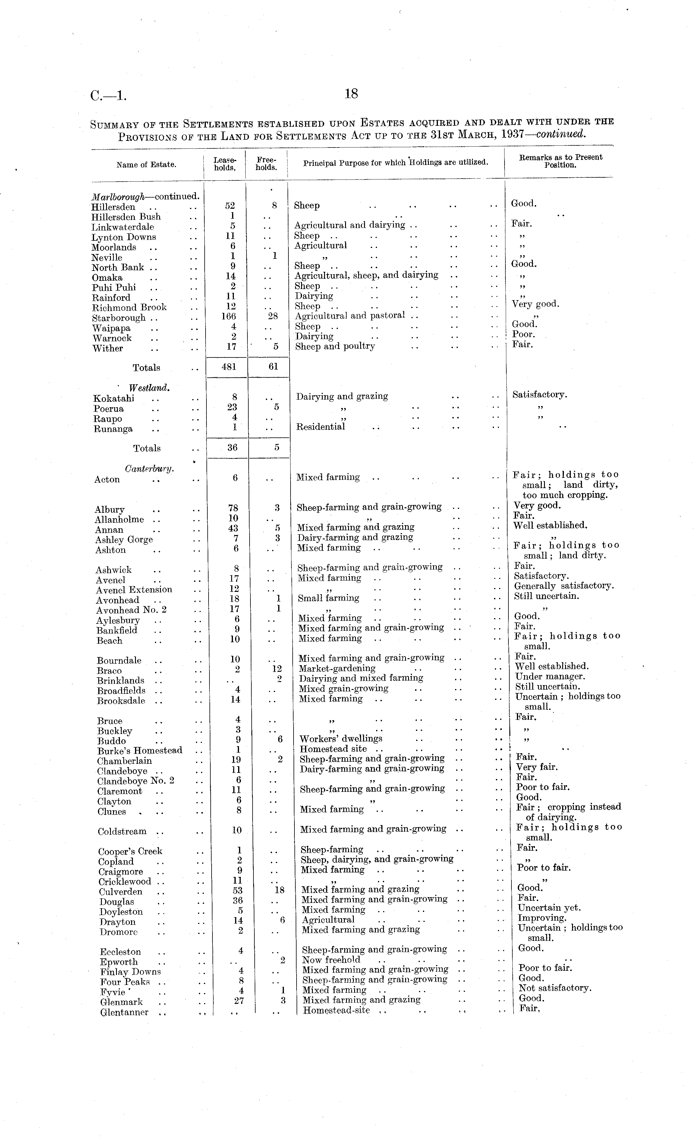 1 t poop. TTrpp- . , Vr ,j. i.-T j Remarks as to Present Name of Estate. j holds. Principal Purpose for which Holdings are utilized. Position. Marlborough—continued. Hillersden .. .. 52 8 Sheep . . .. .. ■ • Good. Hillersden Bush 1 ■ • . Linkwaterdale .. 5 .. Agricultural and dairying .. .. . . iair. Lynton Downs .. 11 . . Sheep .. .. • • • • • • >> Moorlands .. .. 6 .. Agricultural Neville .. • ■ 1 1 U • • • • •' " , North Bank . . .. 9 .. Sheep .. .. • • • • • • t*ood. Omaka .. . . 14 .. Agricultural, sheep, and dairying .. ■ . „ Puhi Puhi .. .. 2 .. Sheep Rainford .. • • H ■ • Dairying . . . • • • •• » Richmond Brook .. 12 .. Sheep Very good. Scarborough .. • • 166 28 Agricultural and pastoral .. .. • • » Waipapa .. .. 4 . . Sheep .. .. • • • • • Good. Warnock .. • • 2 .. Dairying .. .. . • Poor. Wither .. .. 17 5 Sheep and poultry .. .. •• lair. Totals .. 481 61 Westland. Kokatahi .. • • 8 .. Dairying and grazing .. ■ • Satisfactory. Poerua .. 23 5 ,, Raupo .. • • 4 .. „ ■ • • • • • » Runanga .. • • 1 • • Residential Totals .. 36 5 d (TY) t PvhlLYf/ Acton .. 6 .. Mixed farming .. .. Pair; holdings too small; land dirty, too much cropping. Albury .. • • 78 3 Sheep-farming and grain-growing .. .. Very good. Allanholme .. • • 10 .. » • • • • Annan .. ■ • 43 5 Mixed farming and grazing .. ■ ■ Well established. Ashley Gorge . . 7 3 Dairy-farming and grazing . . . . Ashton •• 6 .. Mixed farming .. .. Fair; holdings too small; land dirty. Ashwick .. • ■ 8 .. Sheep-farming and grain-growing . . . . Fair. Avenel .. .. 17 .. Mixed farming .. . . .. ■■ Satisfactory. Avenel Extension . . 12 .. „ Generally satisfactory. Avonhead . . .. 18 1 Small farming .. .. ■ • • ■ Still uncertain. Avonhead No. 2 . . J 7 1 ,, • - ■ • • • • ■ » Aylesbury .. •. 6 .. Mixed farming .. .. . . ■ • t*ood. Bankfield .. 9 •• Mixed farming and grain-growing .. .. ['air. Beach .. .. 10 .. Mixed farming .. .. .. Fair; holdings too small. Bourndale .. •• 10 .. Mixed farming and grain-growing .. .. Fair Braco .. .. 2 12 Market-gardening .. •• Vr ell established. Brinklands .. ■ • • . 2 Dairying and mixed farming .. .. Under manager. Broadfields .. .. 4 .. Mixed grain-growing .. .. •• Still uncertain. Brooksdale .. .. 14 .. Mixed farming .. .. .. Uncertain; holdings too small. Bruce .. .. 4 .. „ Pair. Buckley .. ■ • 3 .. „ ■ • • • • • » Buddo" .. .. 9 6 Workers' dwellings .. .. .. i », Burke's Homestead .. 1 .. Homestead site .. .. • ■ • • Chamberlain .. 19 2 Sheep-farming and grain-growing .. .. -fcair Clandeboye .. .. 11 •• Dairy-farming and gram-growing .. .. Very fair. Clandeboye No. 2 6 » . • • 5 a ""' , , . Claremont .. .. 11 •• Sheep-farming and gram-growing .. .. Boor to fair. Clayton .. ■ • 6 » ■ • • • 0 . . . , , dunes ... .. 8 .. Mixed farming .. .. .. ■ • Fair; cropping instead of dairying. Coldstream .. .. 10 .. Mixed farming and grain-growing .. .. Fair; holdings too small. Cooper's Creek .. 1 .. Sheep-farming .. .. .. • ■ Fair. Copland .. .. 2 .. Sheep, dairying, and grain-growing . . „ Craigmore . . • ■ 9 . . Mixed farming .. .. ■ • • ■ Poor to fair. Cricklewood .. .. 11 • • » • • • • • ■ " Culverden .. .. 53 18 Mixed farming and grazing .. l*ood. Douglas . .. 36 .. Mixed farming and grain-growing .. . . Fair. Doyleston . . .. 5 .. Mixed farming .. .. .. ■ ■ Uncertain yet. Drayton .. -. 14 6 Agricultural .. .. •• Dromore . . • • 2 . . Mixed farming and grazing .. .. Uncertain; holdings too small. Eccleston .. . . 4 .. Sheep-farming and grain-growing .. . . Good. Epworth .. . ■ • • 2 Now freehold .. .. .. ■ ■ _• • Finlay Downs .. 4 .. Mixed farming and gram-growmg .. . . ! oor to fair. Four Peaks .. .. 8 .. Sheep-farming and grain-growing .. . . Good. jyrie ■ .. . . 4 1 Mixed farming .. . . ■ . . . Not satisfactory. Glenmark . . .. 27 3 Mixed farming and grazing .. ■ Good. Glentanner .. ., .. • • Homestead-site , . •. .. . • Pair,