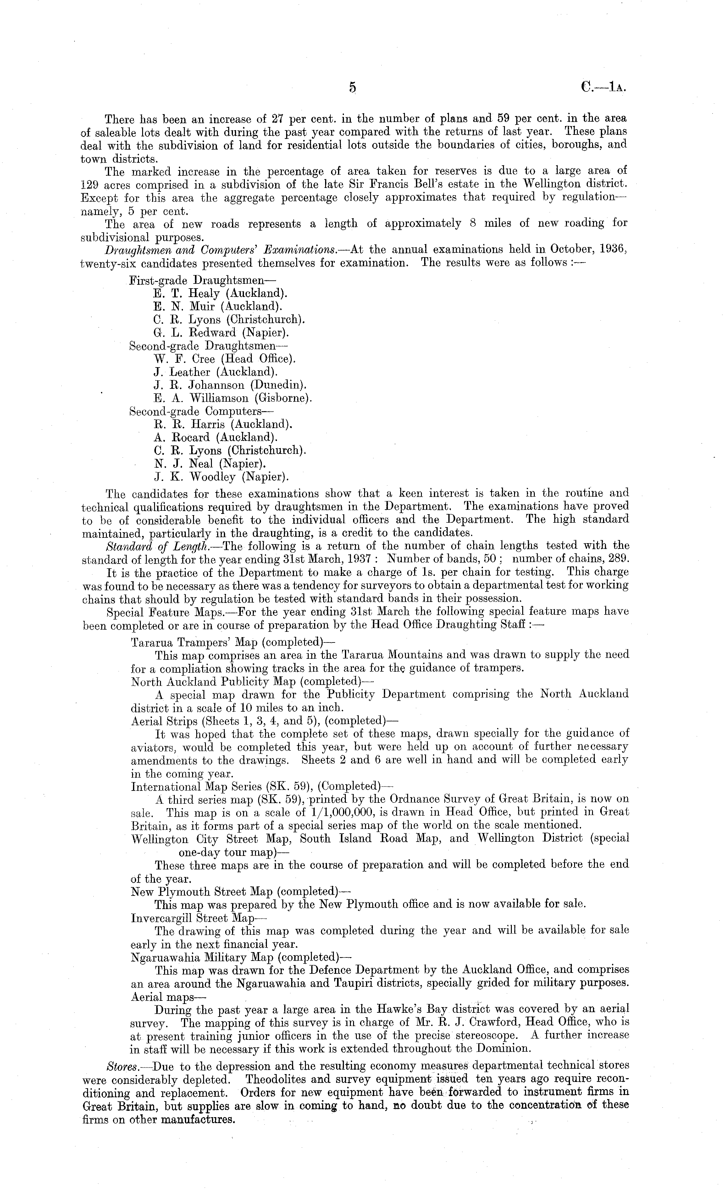 There lias been an increase of 27 per cent, in the number of plans and 59 per cent, in the area of saleable lots dealt with during the past year compared with the returns of last year. These plans deal with the subdivision of land for residential lots outside the boundaries of cities, boroughs, and town districts. The marked increase in the percentage of area taken for reserves is due to a large area of 129 acres comprised in a subdivision of the late Sir Francis Bell's estate in the Wellington districtExcept for this area the aggregate percentage closely approximates that required by regulation — namely, 5 per cent. The area of new roads represents a length of approximately 8 miles of new roading for subdivisional purposes. Draughtsmen and Computers' Examinations. —At the annual examinations held in October, 1936, twenty-six candidates presented themselves for examination. The results were as follows : — First-grade Draughtsmen — E. T. Healy (Auckland). E. N. Muir (Auckland). C. R. Lyons (Christchurch). G. L. Redward (Napier). Second-grade Draughtsmen — W. F. Cree (Head Office). J. Leather (Auckland). J. R. Johannson (Dunedin). E. A. Williamson (Gisborne). Second-grade Computers — R. R. Harris (Auckland). A. Rocard (Auckland). G. R. Lyons (Christchurch). N. J. Neal (Napier). J. K. Woodley (Napier). The candidates for these examinations show that a keen interest is taken in the routine and technical qualifications required by draughtsmen in the Department. The examinations have proved to be of considerable benefit to the individual officers and the Department. The high standard maintained, particularly in the draughting, is a credit to the candidates. Standard of Length. —The following is a return of the number of chain lengths tested with the standard of length for the year ending 31st March, 1937 : Number of bands, 50 ; number of chains, 289. It is the practice of the Department to make a charge of Is. per chain for testing. This charge was found to be necessary as there was a tendency for surveyors to obtain a departmental test for working chains that should by regulation be tested with standard bands in their possession. Special Feature Maps. —For the year ending 31st March the following special feature maps have been completed or are in course of preparation by the Head Office Draughting Staff : —• Tararua Trampers' Map (completed)— This map comprises an area in the Tararua Mountains and was drawn to supply the need for a compliation showing tracks in the area for the guidance of trampers. North Auckland Publicity Map (completed) — A special map drawn for the Publicity Department comprising the North Auckland district in a scale of 10 miles to an inch. Aerial Strips (Sheets 1, 3, 4, and 5), (completed) — It was hoped that the complete set of these maps, drawn specially for the guidance of aviators, would be completed this year, but were held up on account of further necessary amendments to the drawings. Sheets 2 and 6 are well in hand and will be completed early in the coming year. International Map Series (SK. 59), (Completed) — A third series map (SK. 59), printed by the Ordnance Survey of Great Britain, is now on sale. This map is on a scale of 1/1,000,000, is drawn in Head Office, but printed in Great Britain, as it forms part of a special series map of the world on the scale mentioned. Wellington City Street Map, South Island Road Map, and Wellington District (special one-day tour map) — These three maps are in the course of preparation and will be completed before the end of the year. New Plymouth Street Map (completed) — This map was prepared by the New Plymouth office and is now available for sale. Invercargill Street Map — The drawing of this map was completed during the year and will be available for sale early in the next financial year. Ngaruawahia Military Map (completed)— This map was drawn for the Defence Department by the Auckland Office, and comprises an area around the Ngaruawahia and Taupiri districts, specially grided for military purposes. Aerial maps — During the past year a large area in the Hawke's Bay district was covered by an aerial survey. The mapping of this survey is in charge of Mr. R. J. Crawford, Head Office, who is at present training junior officers in the use of the precise stereoscope. A further increase in staff will be necessary if this work is extended throughout the Dominion. Stores.—Due to the depression and the resulting economy measures departmental technical stores were considerably depleted. Theodolites and survey equipment issued ten years ago require reconditioning and replacement. Orders for new equipment have been forwarded to instrument firms in Great Britain, but supplies are slow in coming to hand, no doubt due to the concentration of these firms on other manufactures.
