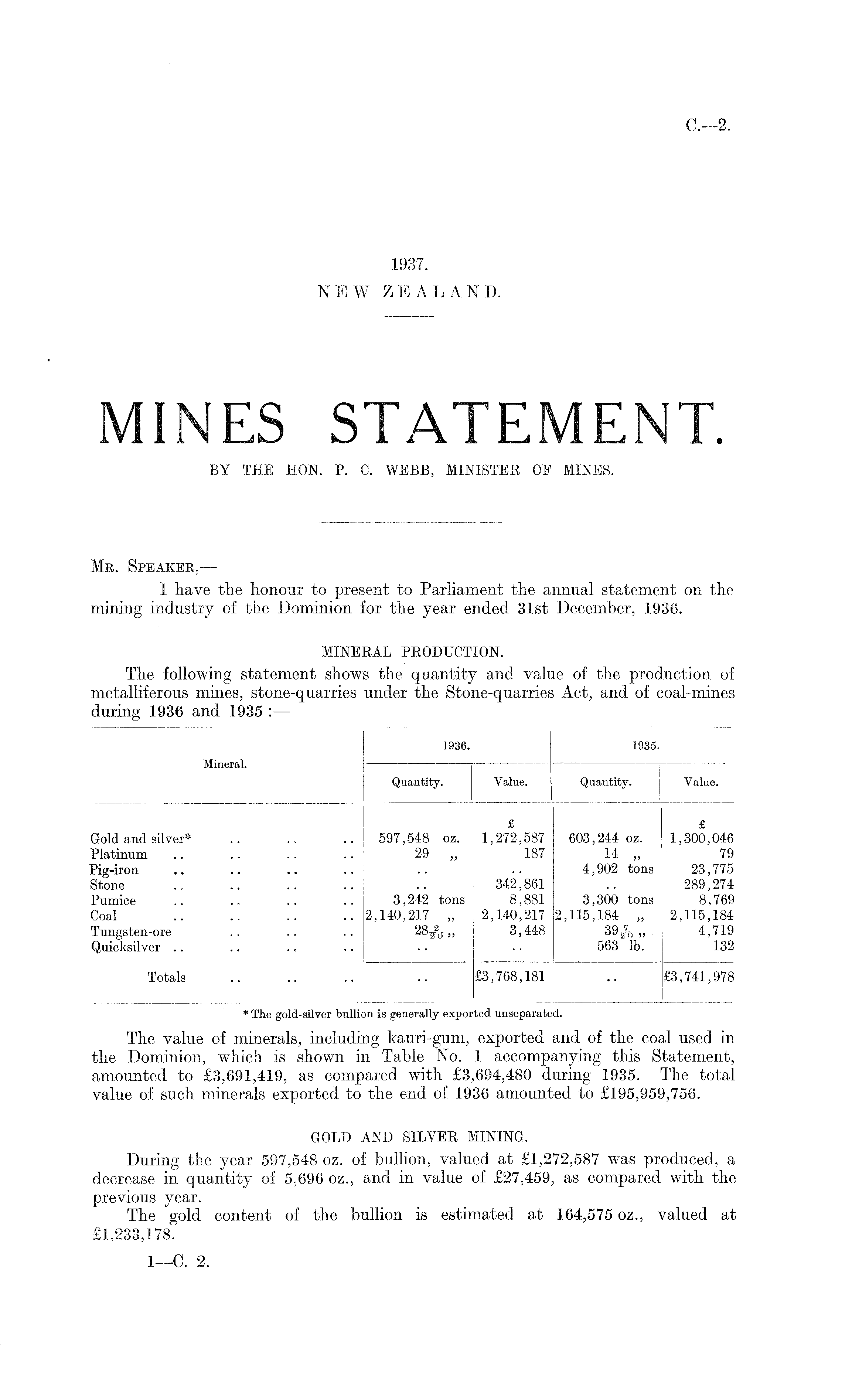 Mr. Speaker,— I have the honour to present to Parliament the annual statement on the mining industry of the Dominion for the year ended 31st December, 1936. MINERAL PRODUCTION. The following statement shows the quantity and value of the production of metalliferous mines, stone-quarries under the Stone-quarries Act, and of coal-mines during 1936 and 1935 : —