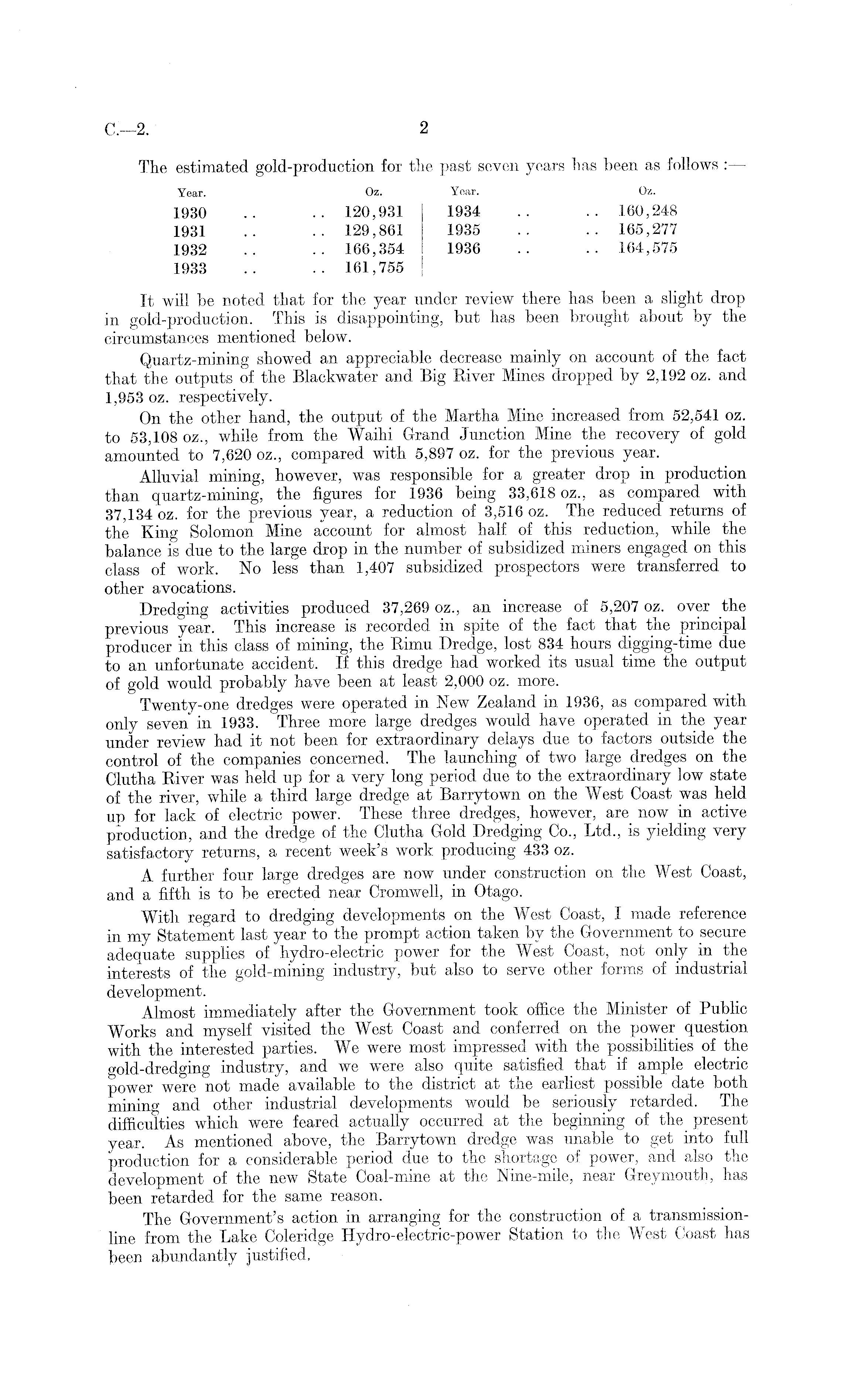 The estimated gold-production for the past seven years has been as follows :— Year. Oz. Year. Oz. 1930 .. .. 120,931 1934 .. .. 160,248 1931 .. •• 129,861 1935 .. .. 165,277 1932 .. .. 166,354 1936 .. .. 164,575 1933 .. •• 161,755 It will be noted that for the year under review there has been a slight drop in gold-production. This is disappointing, but has been brought about by the circumstances mentioned below. Quartz-mining showed an appreciable decrease mainly on account of the fact that the outputs of the Blackwater and Big River Mines dropped by 2,192 oz. and 1,953 oz. respectively. On the other hand, the output of the Martha Mine increased from 52,541 oz. to 53,108 oz., while from the Waihi Grand Junction Mine the recovery of gold amounted to 7,620 oz., compared with 5,897 oz. for the previous year. Alluvial mining, however, was responsible for a greater drop in production than quartz-mining, the figures for 1936 being 33,618 oz., as compared with 37,134 oz. for the previous year, a reduction of 3,516 oz. The reduced returns of the King Solomon Mine account for almost half of this reduction, while the balance is due to the large drop in the number of subsidized miners engaged on this class of work. No less than 1,407 subsidized prospectors were transferred to other avocations. Dredging activities produced 37,269 oz., an increase of 5,207 oz. over the previous year. This increase is recorded in spite of the fact that the principal producer in this class of mining, the Rimu Dredge, lost 834 hours digging-time due to an unfortunate accident. If this dredge had worked its usual time the output of gold would probably have been at least 2,000 oz. more. Twenty-one dredges were operated in New Zealand in 1936, as compared with only seven in 1933. Three more large dredges would have operated in the year under review had it not been for extraordinary delays due to factors outside the control of the companies concerned. The launching of two large dredges on the Clutha River was held up for a very long period due to the extraordinary low state of the river, while a third large dredge at Barrytown on the West Coast was held up for lack of electric power. These three dredges, however, are now in active production, and the dredge of the Clutha Gold Dredging Co., Ltd., is yielding very satisfactory returns, a recent week's work producing 433 oz. A further four large dredges are now under construction on the West Coast, and a fifth is to be erected near Cromwell, in Otago. With regard to dredging developments on the West Coast, I made reference in my Statement last year to the prompt action taken by the Government to secure adequate supplies of hydro-electric power for the West Coast, not only in the interests of the gold-mining industry, but also to serve other forms of industrial development. Almost immediately after the Government took office the Minister of Public Works and myself visited the West Coast and conferred on the power question with the interested parties. We were most impressed with the possibilities of the gold-dredging industry, and we were also quite satisfied that if ample electric power were not made available to the district at the earliest possible date both mining and other industrial developments would be seriously retarded. The difficulties which were feared actually occurred at the beginning of the present year. As mentioned above, the Barrytown dredge was unable to get into full production for a considerable period due to the shortage of power, and also the development of the new State Coal-mine at the Nine-mile, near Grey mouth., has been retarded for the same reason. The Government's action in arranging for the construction of a transmissionline from the Lake Coleridge Hydro-electric-power Station to the West Coast has been abundantly justified.