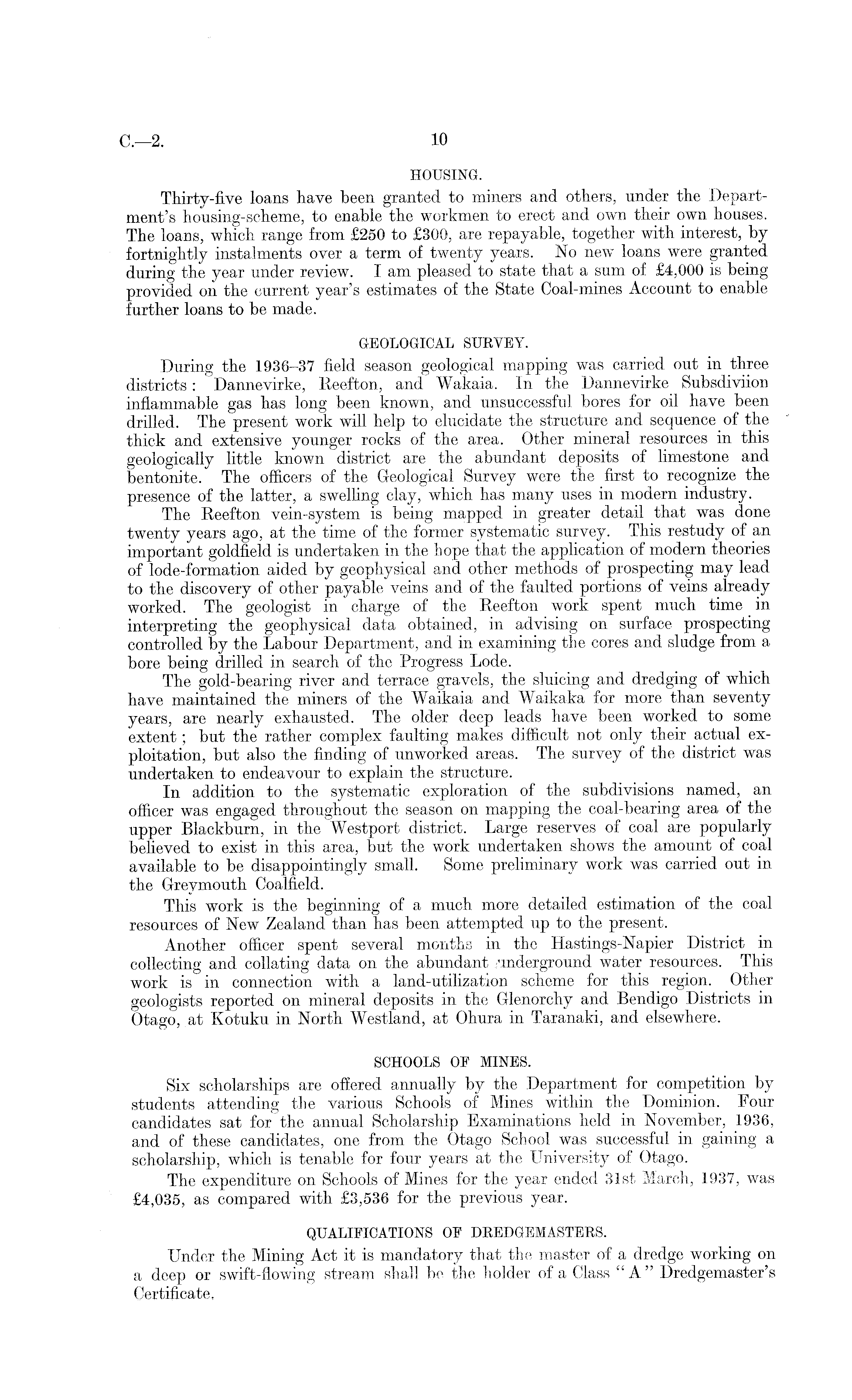 HOUSING. Thirty-five loans have been granted to miners and others, under the Department's housing-scheme, to enable the workmen to erect and own their own houses. The loans, which range from £250 to £300, are repayable, together with interest, by fortnightly instalments over a term of twenty years. No new loans were granted during the year under review. lam pleased to state that a sum of £4,000 is being provided on the current year's estimates of the State Coal-mines Account to enable further loans to be made. GEOLOGICAL SURVEY. During the 1936-37 field season geological mapping was carried out in three districts: Dannevirke, Reefton, and Wakaia. In the Dannevirke Subsdiviion inflammable gas has long been known, and unsuccessful bores for oil have been drilled. The present work will help to elucidate the structure and sequence of the thick and extensive younger rocks of the area. Other mineral resources in this geologically little known district are the abundant deposits of limestone and bentonite. The officers of the Geological Survey were the first to recognize the presence of the latter, a swelling clay, which has many uses in modern industry. The Reefton vein-system is being mapped in greater detail that was done twenty years ago, at the time of the former systematic survey. This restudy of an important goldfield is undertaken in the hope that the application of modern theories of lode-formation aided by geophysical and other methods of prospecting may lead to the discovery of other payable veins and of the faulted portions of veins already worked. The geologist in charge of the Reefton work spent much time in interpreting the geophysical data obtained, in advising on surface prospecting controlled by the Labour Department, and in examining the cores and sludge from a bore being drilled in search of the Progress Lode. The gold-bearing river and terrace gravels, the sluicing and dredging of which have maintained the miners of the Waikaia and Waikaka for more than seventy years, are nearly exhausted. The older deep leads have been worked to some extent; but the rather complex faulting makes difficult not only their actual exploitation, but also the finding of unworked areas. The survey of the district was undertaken to endeavour to explain the structure. In addition to the systematic exploration of the subdivisions named, an officer was engaged throughout the season on mapping the coal-bearing area of the upper Blackburn, in the Westport district. Large reserves of coal are popularly believed to exist in this area, but the work undertaken shows the amount of coal available to be disappointingly small. Some preliminary work was carried out in the Greymouth Coalfield. This work is the beginning of a much more detailed estimation of the coal resources of New Zealand than has been attempted up to the present. Another officer spent several months in the Hastings-Napier District in collecting and collating data on the abundant underground water resources. This work is in connection with a land-utilization scheme for this region. Other geologists reported on mineral deposits in the Glenorchy and Bendigo Districts in Otago, at Kotuku in North Westland, at Ohura in Taranaki, and elsewhere. SCHOOLS OF MINES. Six scholarships are offered annually by the Department for competition by students attending the various Schools of Mines within the Dominion. Four candidates sat for the annual Scholarship Examinations held in November, 1936, and of these candidates, one from the Otago School was successful in gaining a scholarship, which is tenable for four years at the University of Otago. The expenditure on Schools of Mines for the year ended 31st March, 1937, was £4,035, as compared with £3,536 for the previous year. QUALIFICATIONS OF DREDGEMASTERS. Under the Mining Act it is mandatory that the master of a dredge working on a deep or swift-flowing stream shall be the holder of a Class "A" Dredgemaster's Certificate,