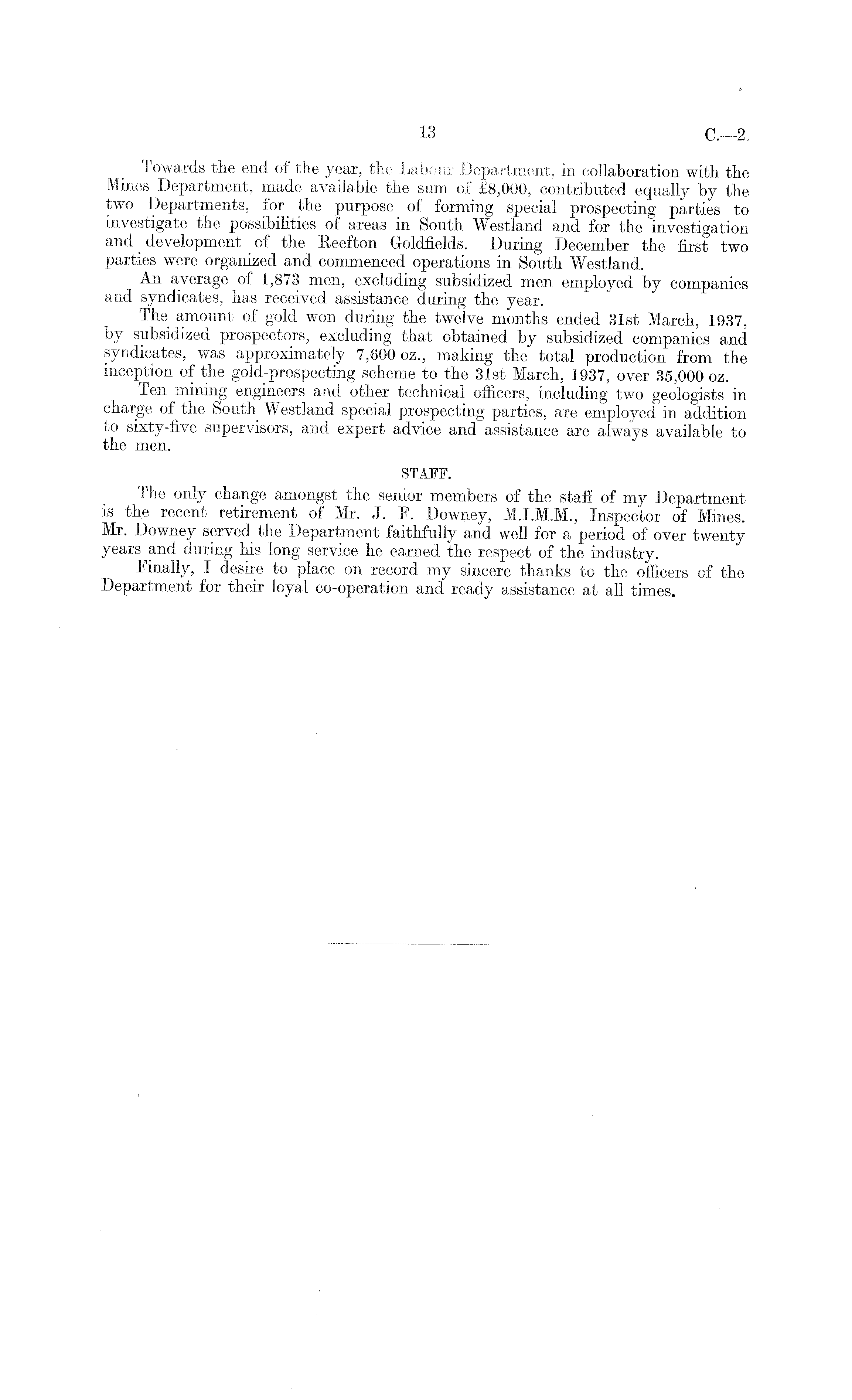 Towards the end of the year, the Labour Department, in collaboration with the Mines Department, made available the sum of £8,000, contributed equally by the two Departments, for the purpose of forming special prospecting parties to investigate the possibilities of areas in South Westland and for the investigation and development of the Reefton Goldfields. During December the first two parties were organized and commenced operations in South Westland. An average of 1,873 men, excluding subsidized men employed by companies and syndicates, has received assistance during the year. The amount of gold won during the twelve months ended 31st March, 1937, by subsidized prospectors, excluding that obtained by subsidized companies and syndicates, was approximately 7,600 oz., making the total production from the inception of the gold-prospecting scheme to the 31st' March, 1937, over 35,000 oz. Ten mining engineers and other technical officers, including two geologists in charge of the South Westland special prospecting parties, are employed in addition to sixty-five supervisors, and expert advice and assistance are always available to the men. STAFF. The only change amongst the senior members of the staff of my Department is the recent retirement of Mr. J. F. Downey, M.1.M.M., Inspector of Mines. Mr. Downey served the Department faithfully and well for a period of over twenty years and during his long service he earned the respect of the industry. Finally, I desire to place on record my sincere thanks to the officers of the Department for their loyal co-operation and ready assistance at all times.