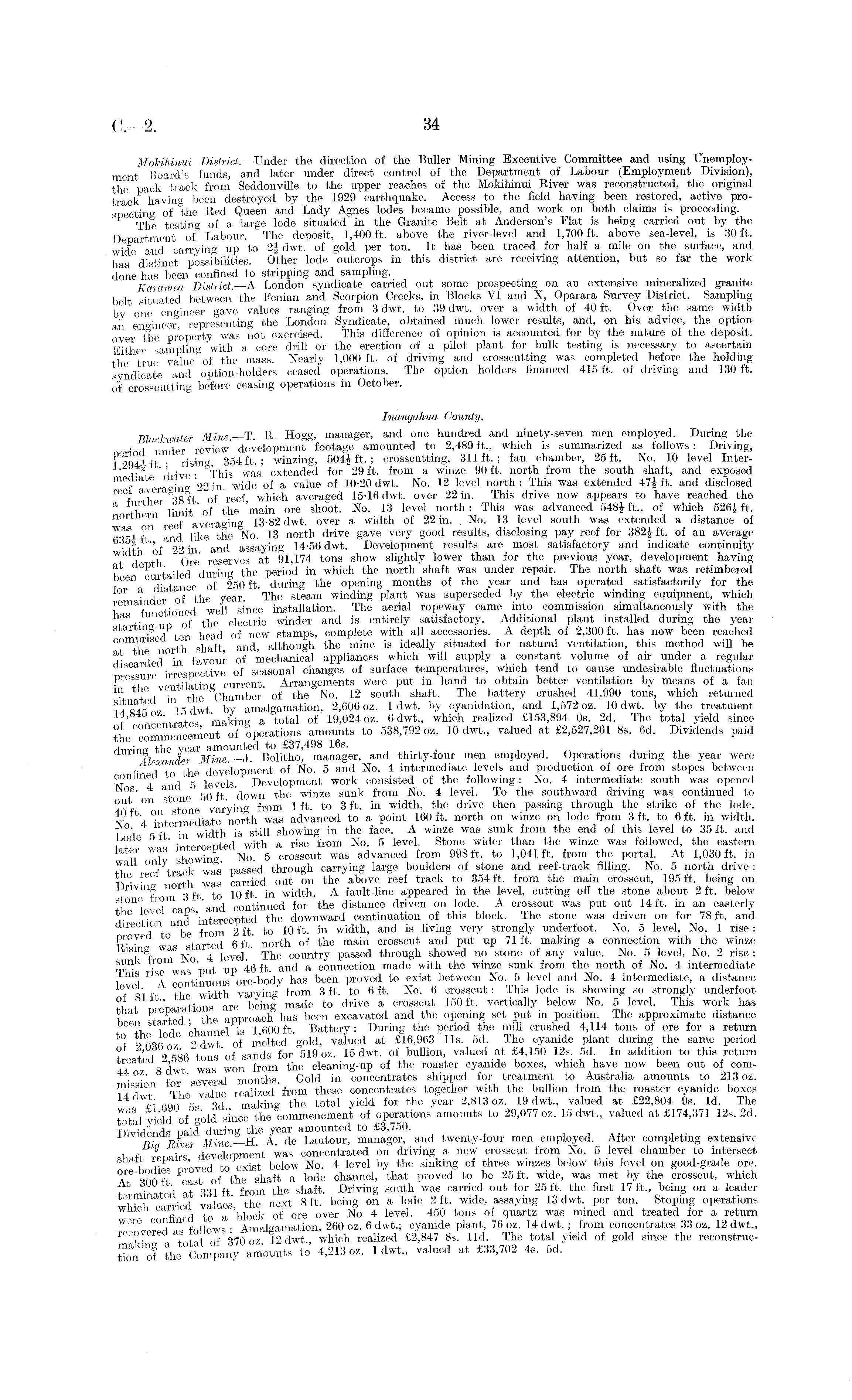 MoMhinui District.—Under the direction of the Buller Mining Executive Committee and using Unemployment Board's funds, and later under direct control of the Department of Labour (Employment Division), the pack track from Seddonville to the upper reaches of the Mokihinui River was reconstructed, the original track having been destroyed by the 1929 earthquake. Access to the field having been restored, active prospecting of the Red Queen and Lady Agnes lodes became possible, and work on both claims is proceeding. The testing of a large lode situated in the Granite Belt at Anderson's Flat is being carried out by the Department of Labour. The deposit, 1,400 ft. above the river-level and 1,700 ft. above sea-level, is 30 ft. wide and carrying up to 2£dwt. of gold per ton. It has been traced for half a mile on the surface, and has distinct possibilities. Other lode outcrops in this district are receiving attention, but so far the work done has been confined to stripping and sampling. Karamea District. —A London syndicate carried out some prospecting on an extensive mineralized granite belt situated between the Fenian and Scorpion Creeks, in Blocks VI and X, Oparara Survey District. Sampling bv one engineer gave values ranging from 3 dwt. to 39 dwt. over a width of 40 ft. Over the same width an engineer, representing the London Syndicate, obtained much lower results, and, on his advice, the option over the property was not exercised. This difference of opinion is accounted for by the nature of the deposit. Either sampling with a core drill or the erection of a pilot plant for bulk testing is necessary to ascertain the true value of the mass. Nearly 1,000 ft. of driving and crosscutting was completed before the holding syndicate and option-holders ceased operations. The option holders financed 415 ft. of driving and 130 ft. of crosscutting before ceasing operations in October. Inangahua County. Blackwaier Mine.—l. R. Hogg, manager, and one hundred and ninety-seven men employed. During the ■ i under review development footage amounted to 2,489 ft., which is summarized as follows : Driving, r^t l ft. • risinc, 354 ft.; winzing, 504£ ft. ; crosscutting, 311 ft.; fan chamber, 25 ft. No. 10 level Inter- ' j■ , "V. This was extended for 29ft. from a winze 90ft. north from the south shaft, and exposed media e 22 in. wide of a value of 10-20 dwt. No. 12 level north: This was extended 47J ft. and disclosed reef aver os • w hich averaged 15-16 dwt. over 22 in. This drive now appears to have reached the a turt ier main ore shoot. No. 13 level north : This was advanced 548J ft., of which 526J ft. nortner averaging 13-82 dwt. over a width of 22 in. No. 13 level south was extended a distance of fWttft n and like the No. 13 north drive gave very good results, disclosing pay reef for 382£ ft. of an average dtVi f 22 in and assaying 14-56 dwt. Development results are most satisfactory and indicate continuity 1 tl Ore reserves at 91,174 tons show slightly lower than for the previous year, development having h tailed during the period in which the north shaft was under repair. The north shaft was retimbered been cur' 3go {t _ during the opening months of the year and has operated satisfactorily for the of the year. The steam winding plant was superseded by the electric winding equipment, which remain er s j noe installation. The aerial ropeway came into commission simultaneously with the has iu electric winder and is entirely satisfactory. Additional plant installed during the year starting-up stamps, complete with all accessories. A depth of 2,300 ft. has now been reached comprise aīl< j although the mine is ideally situated for natural ventilation, this method will be !r rled°in favour of mechanical appliances which will supply a constant volume of air under a regular discarc e spective of seasonal changes of surface temperatures, which tend to cause undesirable fluctuations pressure . t current. Arrangements were put in hand to obtain better ventilation by means of a fan m tne . Chamber of the No. 12 south shaft. The battery crushed 41,990 tons, which returned fXf' in , r. a wt, bv amalgamation, 2,606 oz. 1 dwt. by cyanidation, and 1,572 oz. 10 dwt. by the treatment f tncntrates making a total of 19,024 oz. 6 dwt., which realized £153,894 os. 2d. The total yield since the "commencement of operations amounts to 538,792 oz. 10 dwt., valued at £2,527,261 Bs. 6d. Dividends paid during the year amounted to £37,498 16s. _ Alexander Mine.—J. Bolitho, manager, and thirty-four men employed. Operations during the year were fi d t the development of No. 5 and No. 4 intermediate levels and production of ore from stopes between confined o j eve l g Development work consisted of the following: No. 4 intermediate south was opened Nos. 4 goft ' down the winze sunk from No. 4 level. To the southward driving was continued to out on s ' var 'ying from 1 ft. to 3 ft. in width, the drive then passing through the strike of the lode, tj 4 "intermediate north was advanced to a point 160 ft. north on winze on lode from 3 ft. to 6 ft. in width. T °'i sft ' width is still showing in the face. A winze was sunk from the end of this level to 35 ft. and Lode 5 . m rige £ rom No. 5 level. Stone wider than the winze was followed, the eastern later wa No g oro sscut was advanced from 998 ft. to 1,041 ft. from the portal. At 1,030 ft. in the reef track was passed through carrying large boulders of stone and reef-track filling. No. 5 north drive : uuc iooi carried out on the above reef track to 354 ft. from the main crosscut, 195 ft. being on Driving n r 10 ft. in width. A fault-line appeared in the level, cutting off the stone about 2 ft. below stone tr °™ • {md continued for the distance driven on lode. A crosscut was put out 14 ft. in an easterly the leve p , , ~ downward continuation of this block. The stone was driven on for 78 ft. and direction a 1Q width; and is living very strongly underfoot. No. 5 level, No. 1