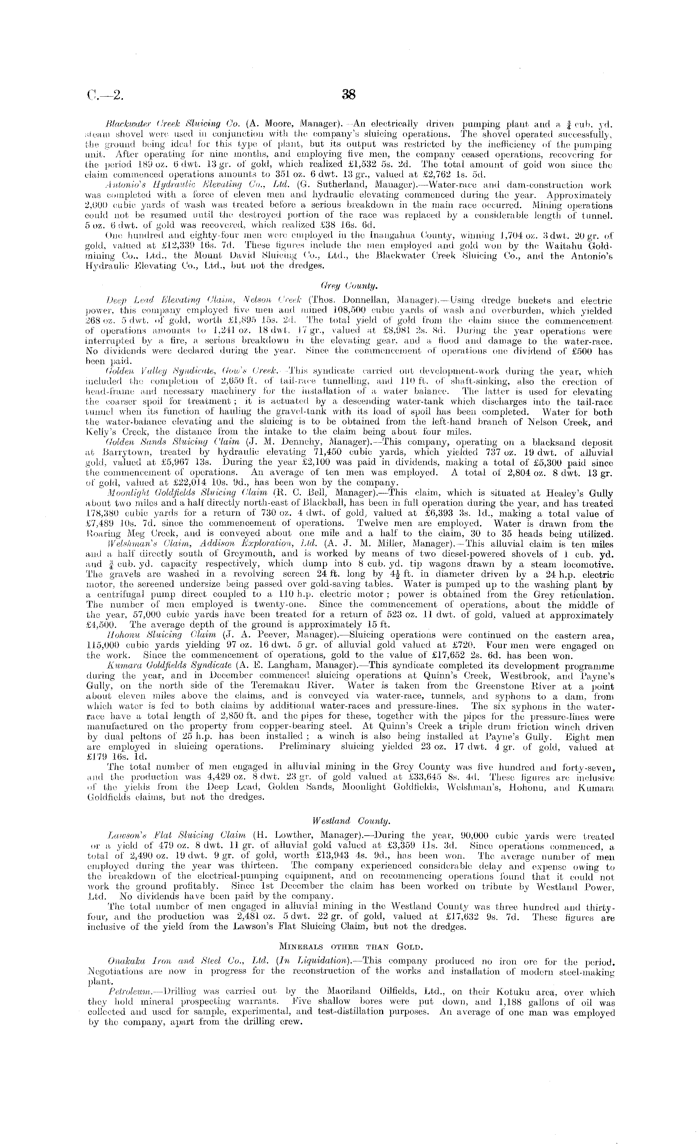 Blackwater Greek Sluicing Co. (A. Moore, Manager).—An electrically driven pumping plant and a f cub. yd. steam shovel were used in conjunction with the company's sluicing operations. The shovel operated successfully, the ground being ideal for this type of plant, but its output was restricted by the inefficiency of the pumping unit. After operating for nine months, and employing five men, the company ceased operations, recovering for the period 189 oz. 0 dwt. 13 gr. of gold, which realized £1,532 ss. 2d. The total amount of gold won since the claim commenced operations amounts to 351 oz. 6 dwt. 13 gr., valued at £2,762 Is. sd. Antonio's Hydraulic Elevating Co., Ltd. (G. Sutherland, Manager).—Water-race and dam-construction work was completed with a force of eleven men and hydraulic elevating commenced during the year. Approximately 2,000 cubic yards of wash was treated before a serious breakdown in the main race occurred. Mining operations could not be resumed until the destroyed portion of the race was replaced by a considerable length of tunnel. 5 oz. 6 dwt. of gold was recovered, which realized £38 16s. 6d. One hundred and eighty-ibur men were employed in the Inangahua County, winning 1,704 oz. 3 dwt. 20 gr. of gold, valued at £12,339 16s. 7d. These figures include the men employed and gold won by the Waitahu Goldmining Co., Ltd., the Mount David Sluicing Co., Ltd., the Blackwater Creek Sluicing Co., and the Antonio's Hydraulic Elevating Co., Ltd., but not the dredges. Grey County. Deep Lead Elevating Claim, Nelson Creek (Thos. Donnellan, Manager).—Using dredge buckets and electric power, this company employed five men and mined 108,500 cubic yards of wash and overburden, which yielded 268 oz. 5 dwt. of gold, worth £1,895 15s. 2d. The total yield of gold from the claim since the commencement of operations amounts to 1,241 oz. 18 dwt. 1.7 gr., valued at £8,981 2s. Bd. During the year operations were interrupted by a fire, a serious breakdown in the elevating gear, and a flood and damage to the water-race. No dividends were declared during the year. Since the commencement of operations one dividend of £500 has been paid. Golden Valley Syndicate, Genu's Creek. —This syndicate carried out development-work during the year, which included the completion of 2,650 ft. of tail-race tunnelling, and 110 ft. of shaft-sinking, also the erection of head-frame and necessary machinery for the installation of a water balance. The latter is used for elevating the coarser spoil for treatment; it is actuated by a descending water-tank which discharges into the tail-race tunnel when its function of hauling the gravel-tank with its load of spoil has been completed. Water for both the water-balance elevating and the sluicing is to be obtained from the left-hand branch of Nelson Creek, and Kelly's Creek, the distance from the intake to the claim being about four miles. Golden Sands Sluicing Claim (J. M. Dennehy, Manager).—This company, operating on a blacksand deposit at Barrytown, treated by hydraulic elevating 71,450 cubic yards, which yielded 737 oz. 19 dwt. of alluvial gold, valued at £5,967 13s. During the year £2,100 was paid in dividends, making a total of £5,300 paid since the commencement of operations. An average of ten men was employed. A total of 2,804 oz. 8 dwt. 13 gr. of gold, valued at £22,014 10s. 9d., has been won by the company. Moonlight Goldfields Sluicing Claim (R. C. .Bell, Manager).—This claim, which is situated at Healey's Gully about two miles and a half directly north-east of Blackball, has been in full operation during the year, and has treated 178,380 cubic yards for a return of 730 oz. 4 dwt. of gold, valued at £6,393 3s. Id., making a total value of £7,489 10s. 7d. since the commencement of operations. Twelve men are employed. Water is drawn from the Roaring Meg Creek, and is conveyed about one mile and a half to the claim, 30 to 35 heads being utilized. Welshman's Claim, Addison Exploration, Ltd. (A. J. M. Miller, Manager).—This alluvial claim is ten miles and a halt directly south of Greymouth, and is worked by means of two diesel-powered shovels of 1 cub. yd. and § cub. yd. capacity respectively, which dump into 8 cub. yd. tip wagons drawn by a steam locomotive. The gravels are washed in a revolving screen 24 ft. long by 4J ft. in diameter driven by a 24 h.p. electric motor, the screened undersize being passed over gold-saving tables. Water is pumped up to the washing plant by a centrifugal pump direct coupled to a 110 h.p. electric motor ; power is obtained from the Grey reticulation. The number of men employed is twenty-one. Since the commencement of operations, about the middle of the year, 57,000 cubic yards have been treated for a return of 523 oz. 11 dwt. of gold, valued at approximately £4,500. The average depth of the ground is approximately 15 ft. Hohonu Sluicing Claim (J. A. Peever, Manager).—Sluicing operations were continued on the eastern area, 115,000 cubic yards yielding 97 oz. 16 dwt. 5 gr. of alluvial gold valued at £720. Four men were engaged on the work. Since the commencement of operations, gold to the value of £17,652 2s. 6d. has been won. Kumara Goldfields Syndicate (A. E. Langham, Manager).—This syndicate completed its development programme during the year, and in December commenced sluicing operations at Quinn's Creek, Westbrook, and Payne's Gully, on the north side of the Teremakau River. Water is taken from the Greenstone River at a point about eleven miles above the claims, and is conveyed via water-race, tunnels, and syphons to a dam, from which water is fed to both claims by additional water-races and pressure-lines. The six syphons in the waterrace have a total length of 2,850 ft. and the pipes for these, together with the pipes for the pressure-lines were manufactured on the property from copper-bearing steel. At Quinn's Creek a triple drum friction winch driven by dual peltons of 25 h.p. has been installed ; a